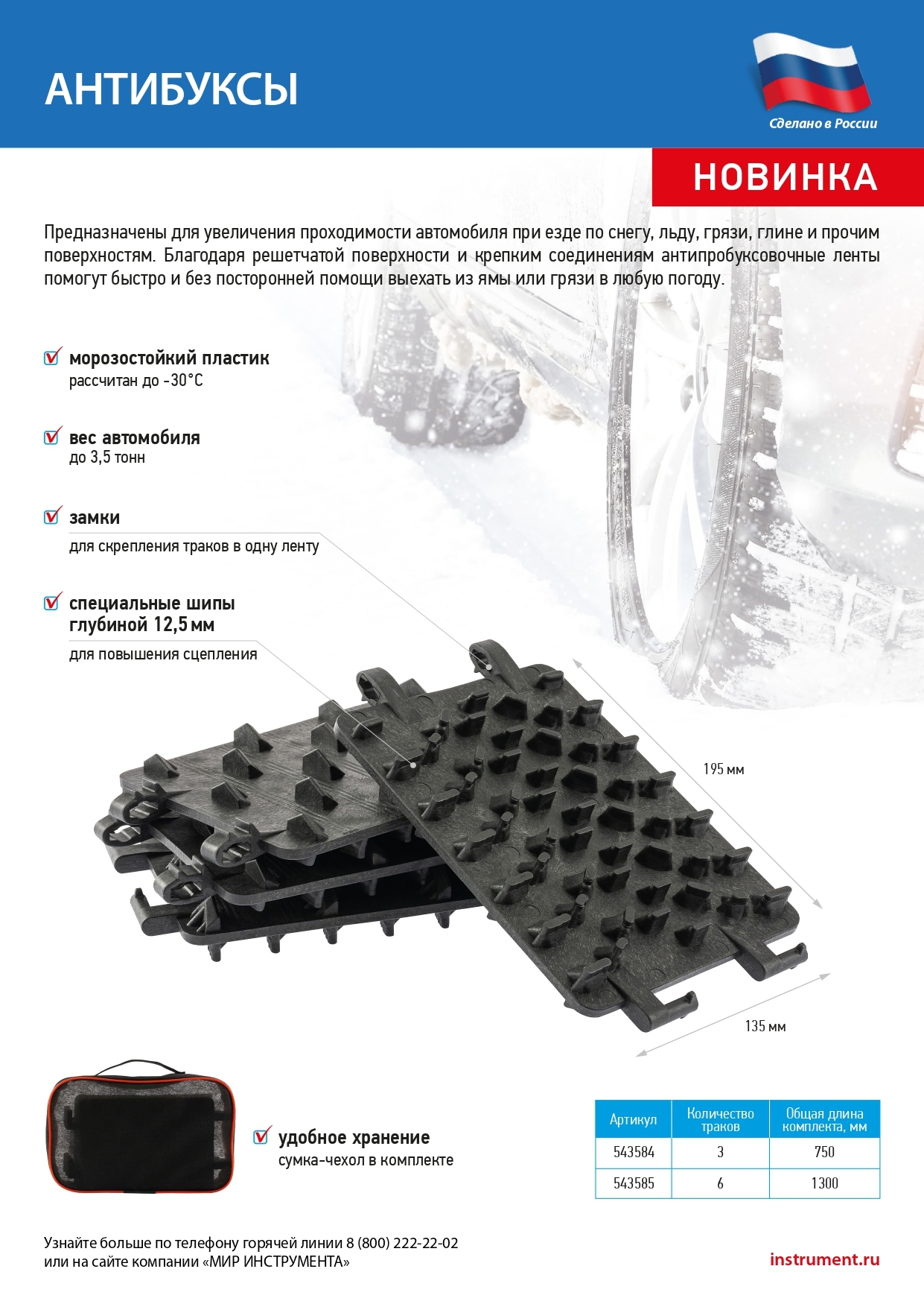 Антибуксировочные траки являются важным аксессуаром автомобилиста, особенно, если на вашем пути может возникнуть бездорожье. Ленты заметно повышают проходимость по льду, гряди и песку. Для удобства хранения в комплекте присутствует сумка.