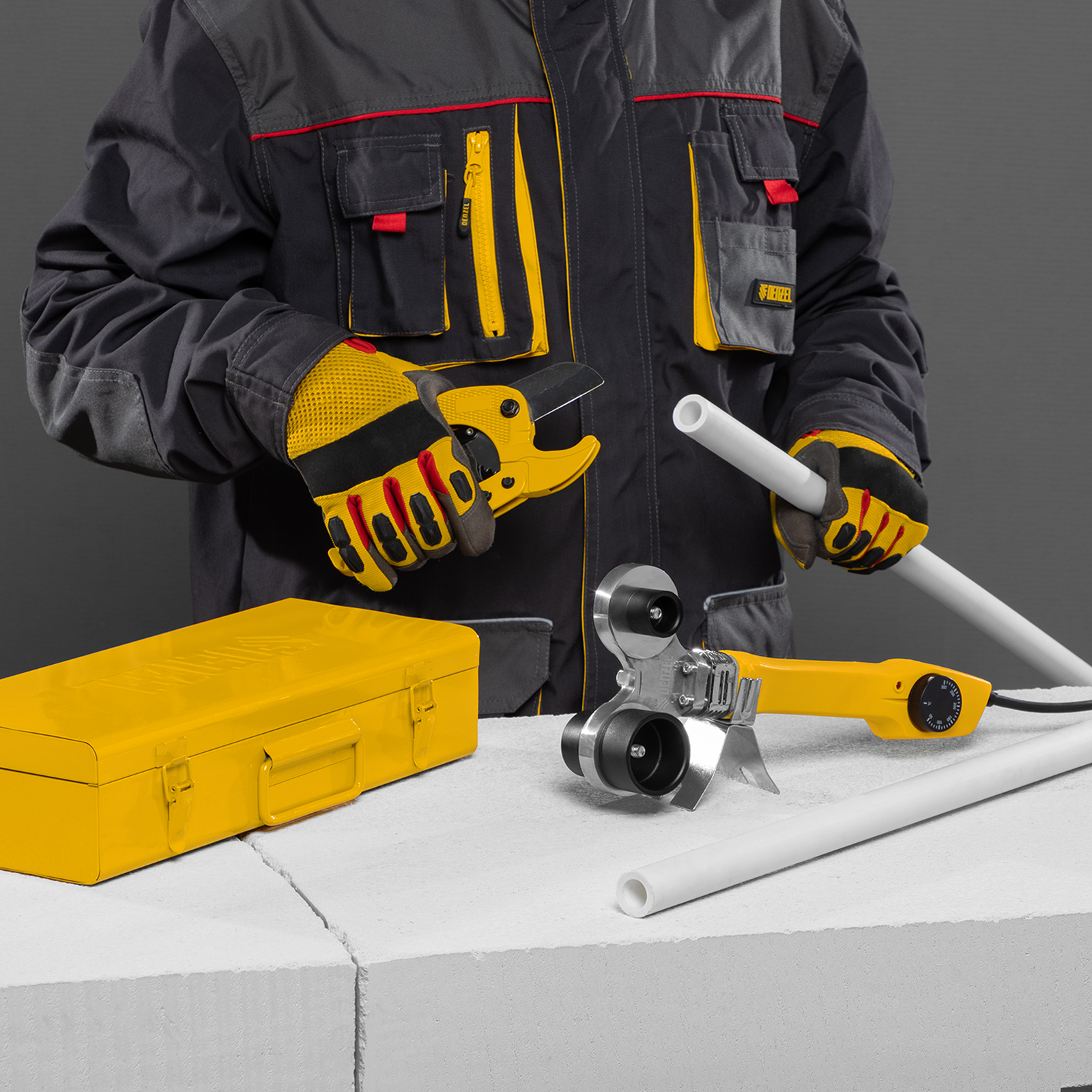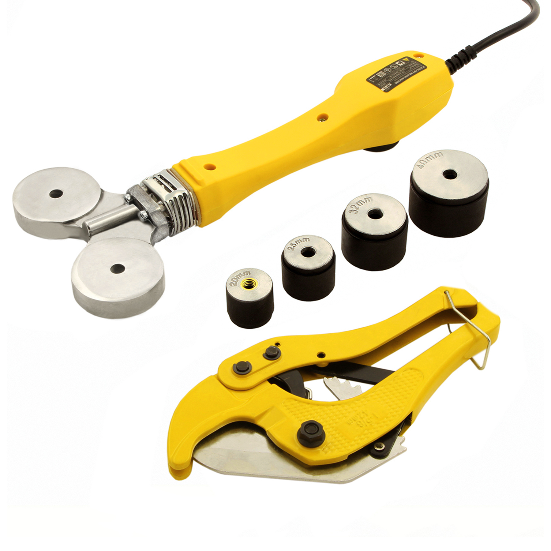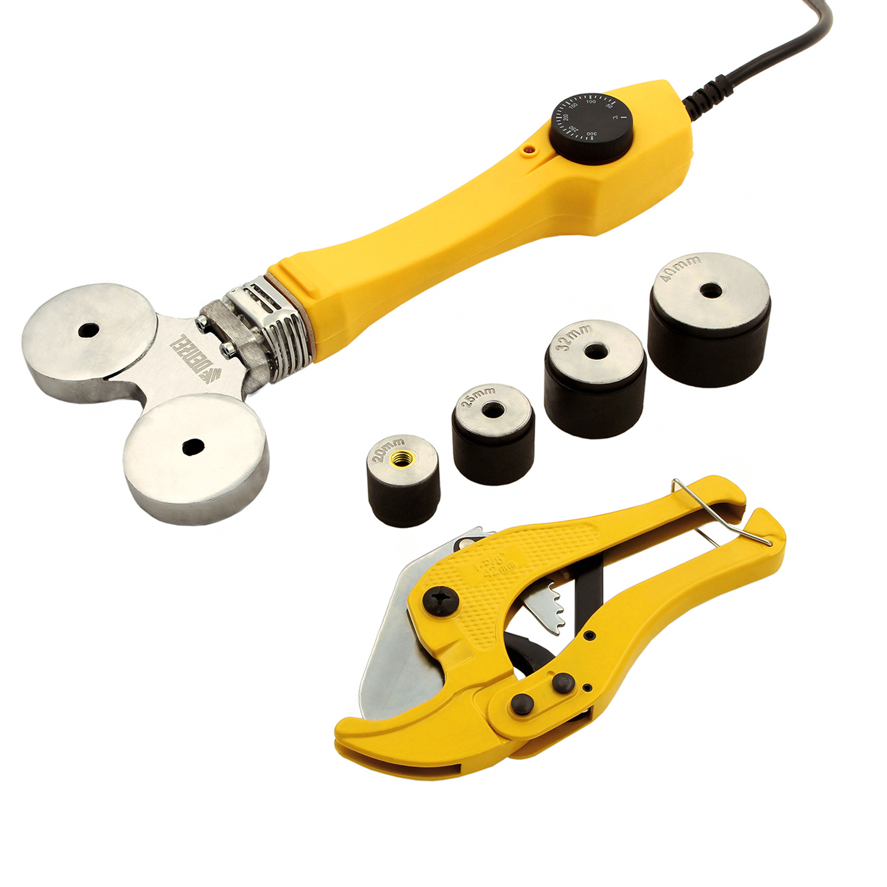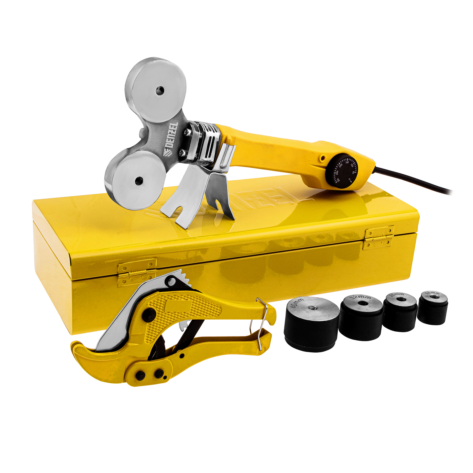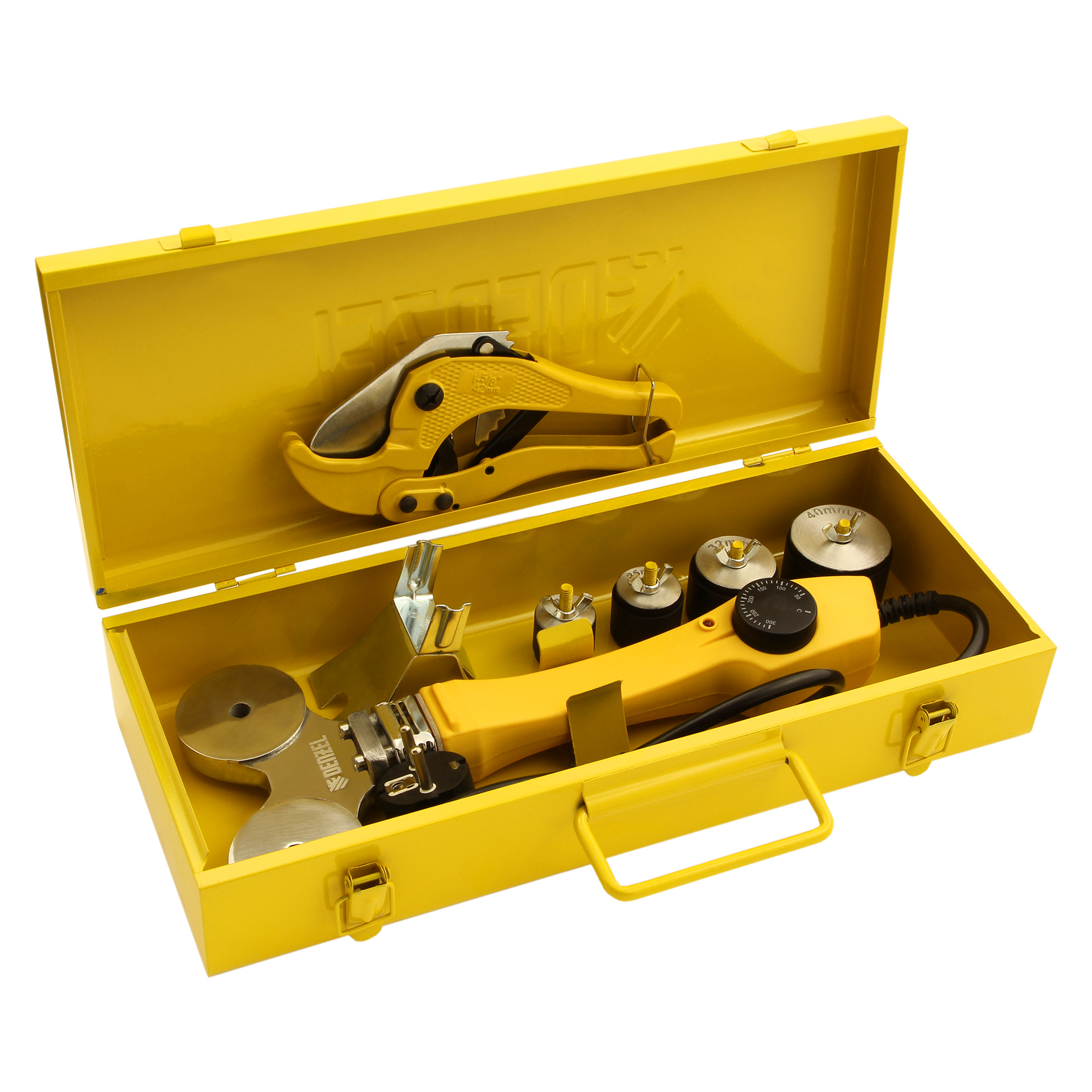 - Широкий комплект поставки — к аппарату прилагаются 4 насадки для соединения труб диаметром 20, 25, 32 и 40 мм, имбусовый ключ и труборез.