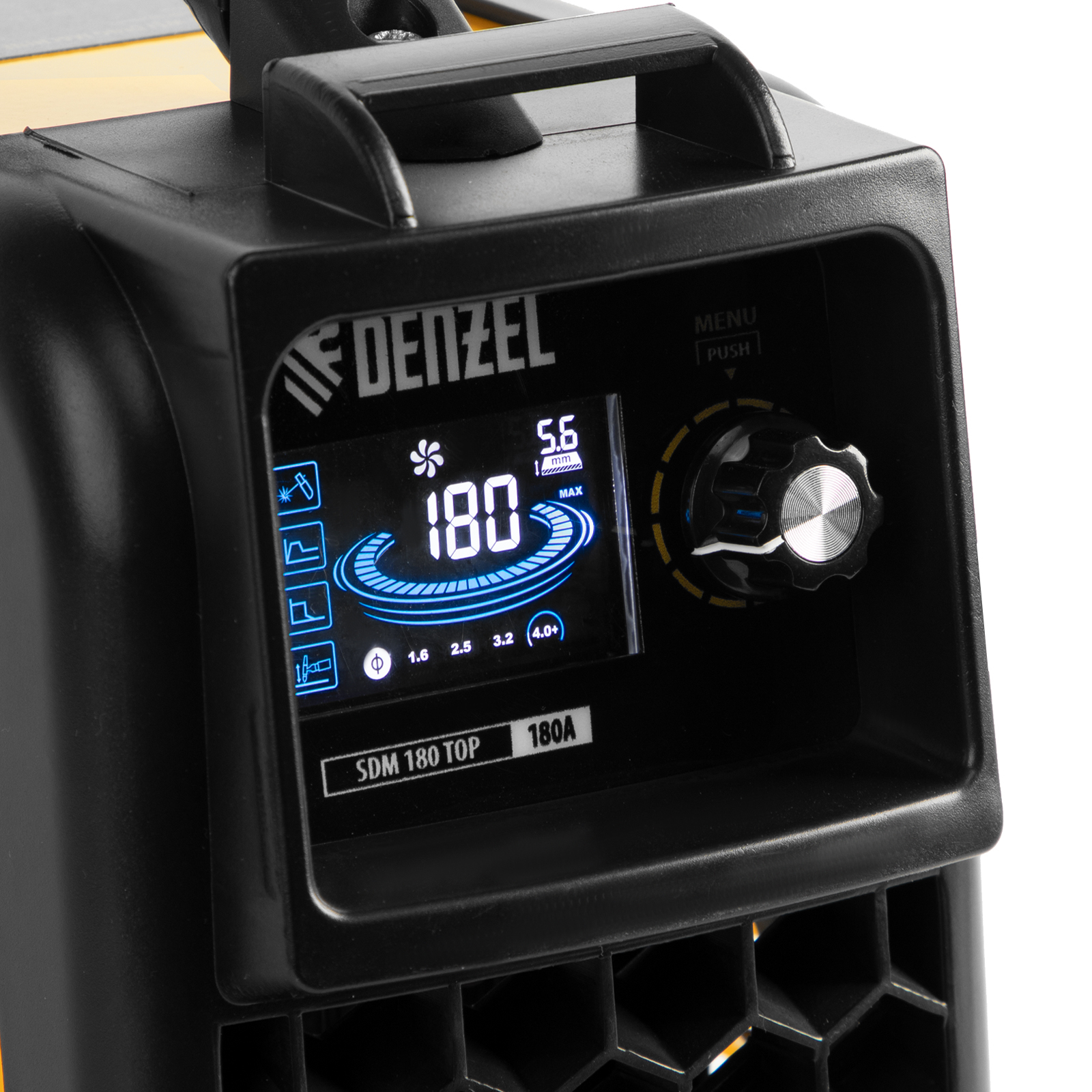 Инверторный аппарат дуговой сварки Denzel SDM-180 Top 94355 характеризуется увеличенной продолжительностью включения 80% и работает со сварочным током до 180 А. Предназначен для сварки штучными электродами диаметром до 4 мм изделий из низкоуглеродистых сталей в режиме MMA, а также аргонодуговой сварки неплавящимся электродом TIG LIFT (горелка приобретается отдельно). Аппарат эффективно работает даже при нестабильном напряжении. Устройство предназначено для использования в быту и профессиональной сфере.,Основное достоинство линейки Denzel SDM — синергетическое управление, значительно облегчающее подбор оптимальных параметров сварки. Аппарат дает возможность указать толщину свариваемого металла, после чего автоматически подбирает оптимальный сварочный ток и диаметр электрода. И наоборот: достаточно установить требуемое значение сварочного тока и на дисплее отобразится минимальная рекомендованная толщина свариваемых деталей, а также диаметр электрода. Аппарат эффективно работает даже при нестабильном напряжении, предназначен для использования в профессиональной сфере и в быту.