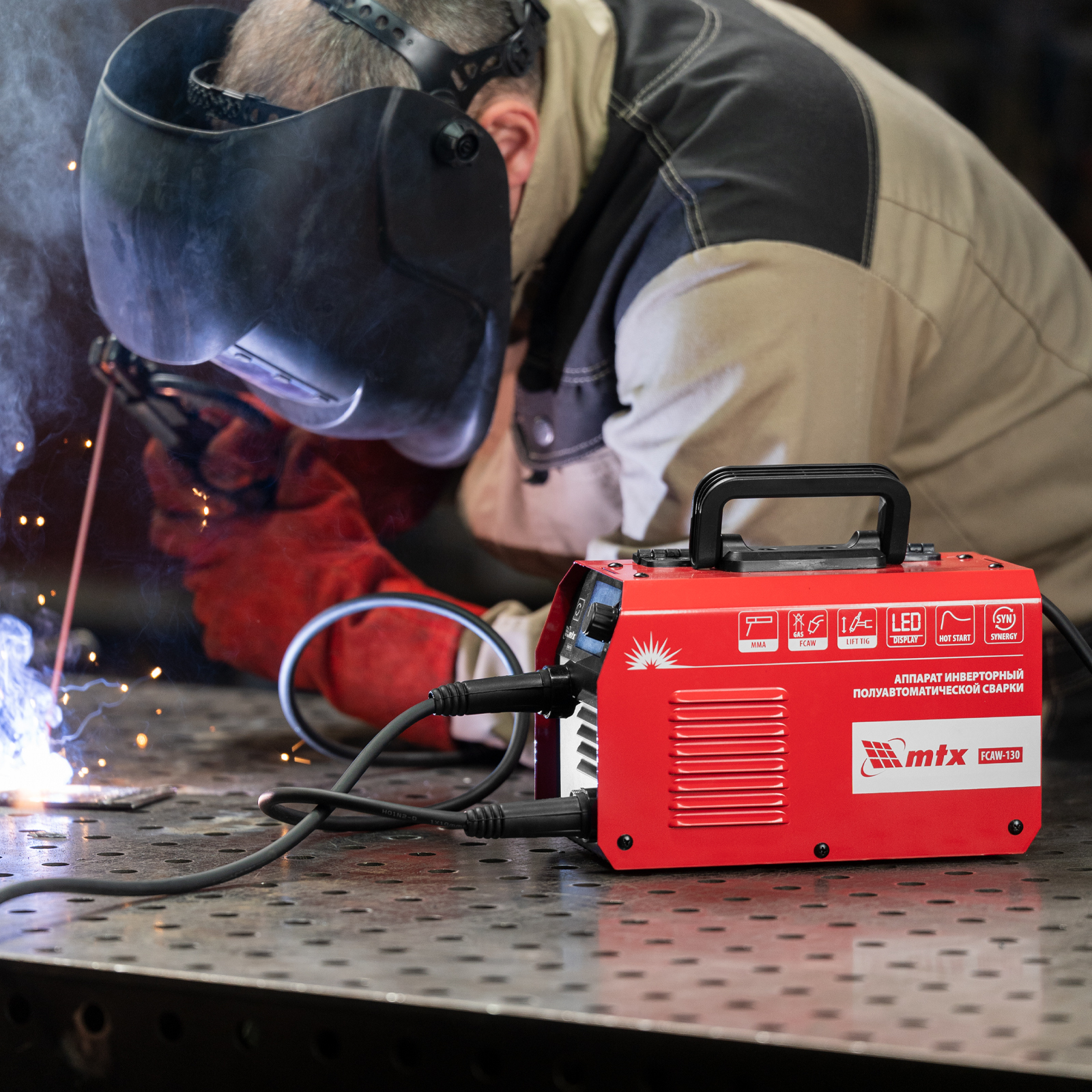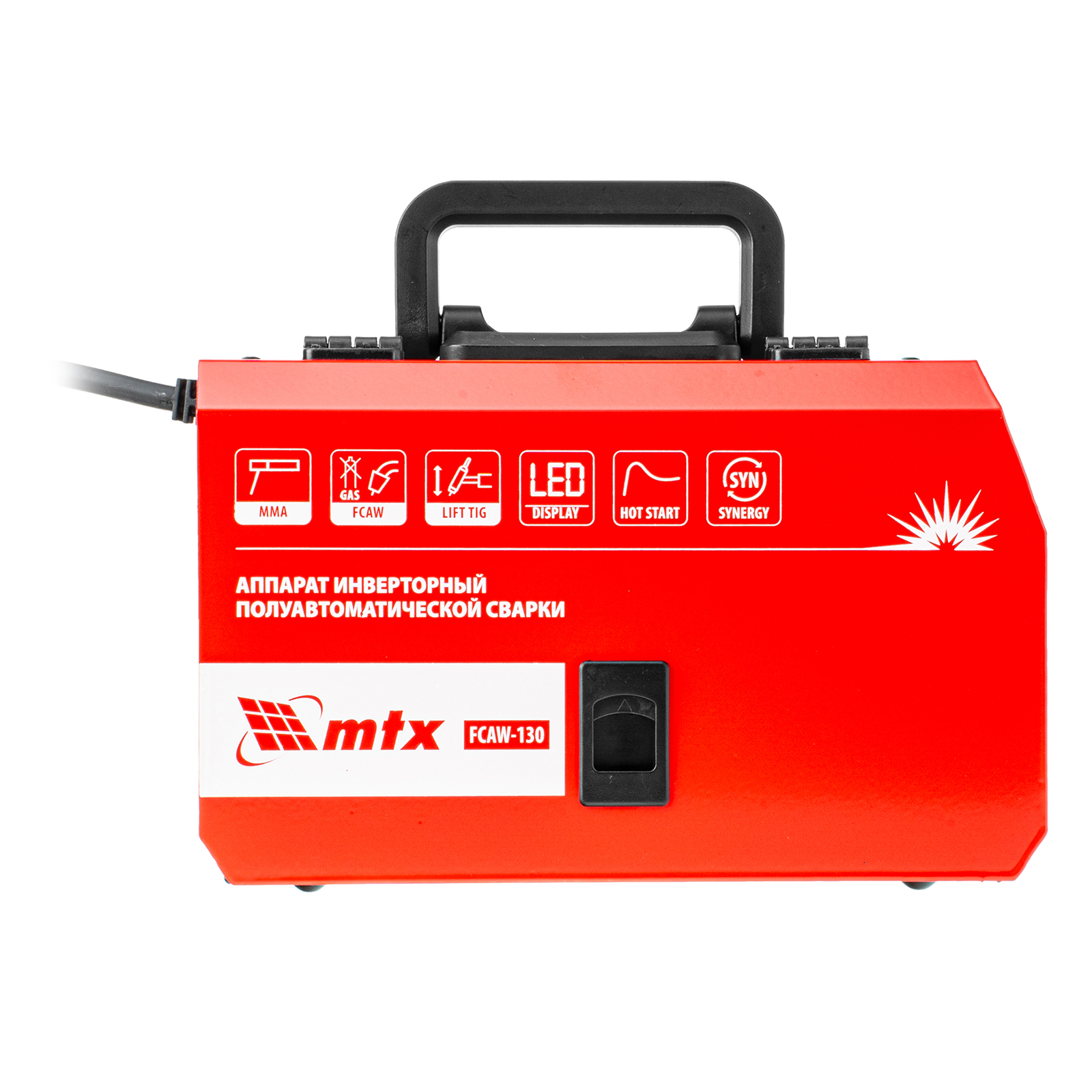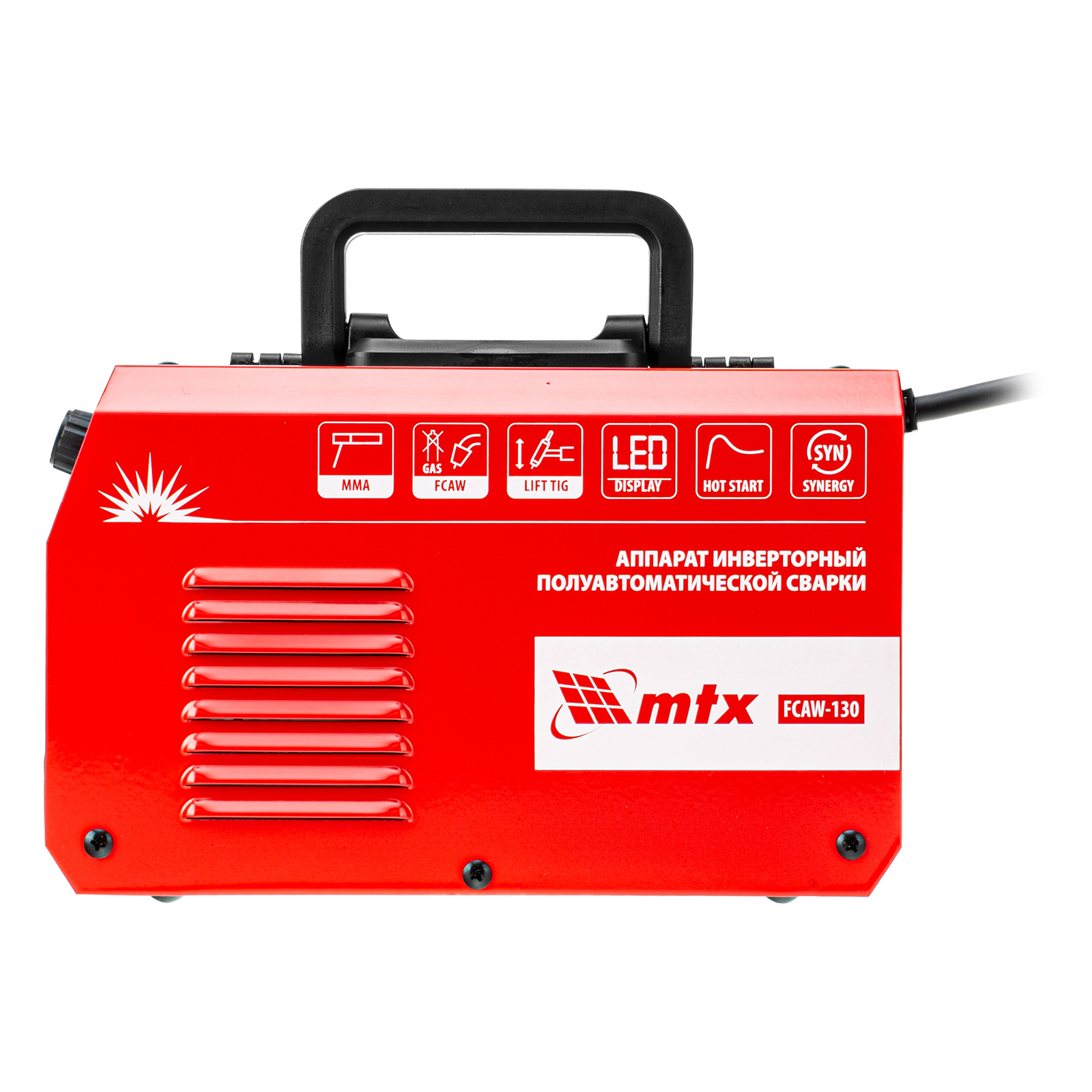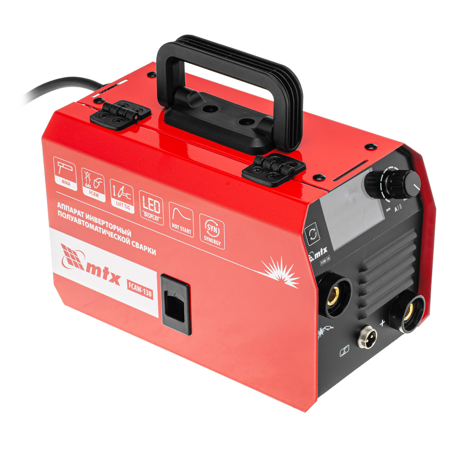 Инверторный аппарат полуавтоматической сварки MTX FCAW-130 94300 работает с постоянным сварочным током до 130 A, продолжительность включения составляет 60%. Доступна сварка покрытым электродом (MMA), порошковой (или флюсовой) проволокой диаметром 0,8 / 1 мм (FCAW), а также аргонодуговая сварка неплавящимся электродом Lift TIG (горелка не входит в комплект поставки). Аппарат подходит для сварки конструкционных и нержавеющих сталей, а также цветных металлов.