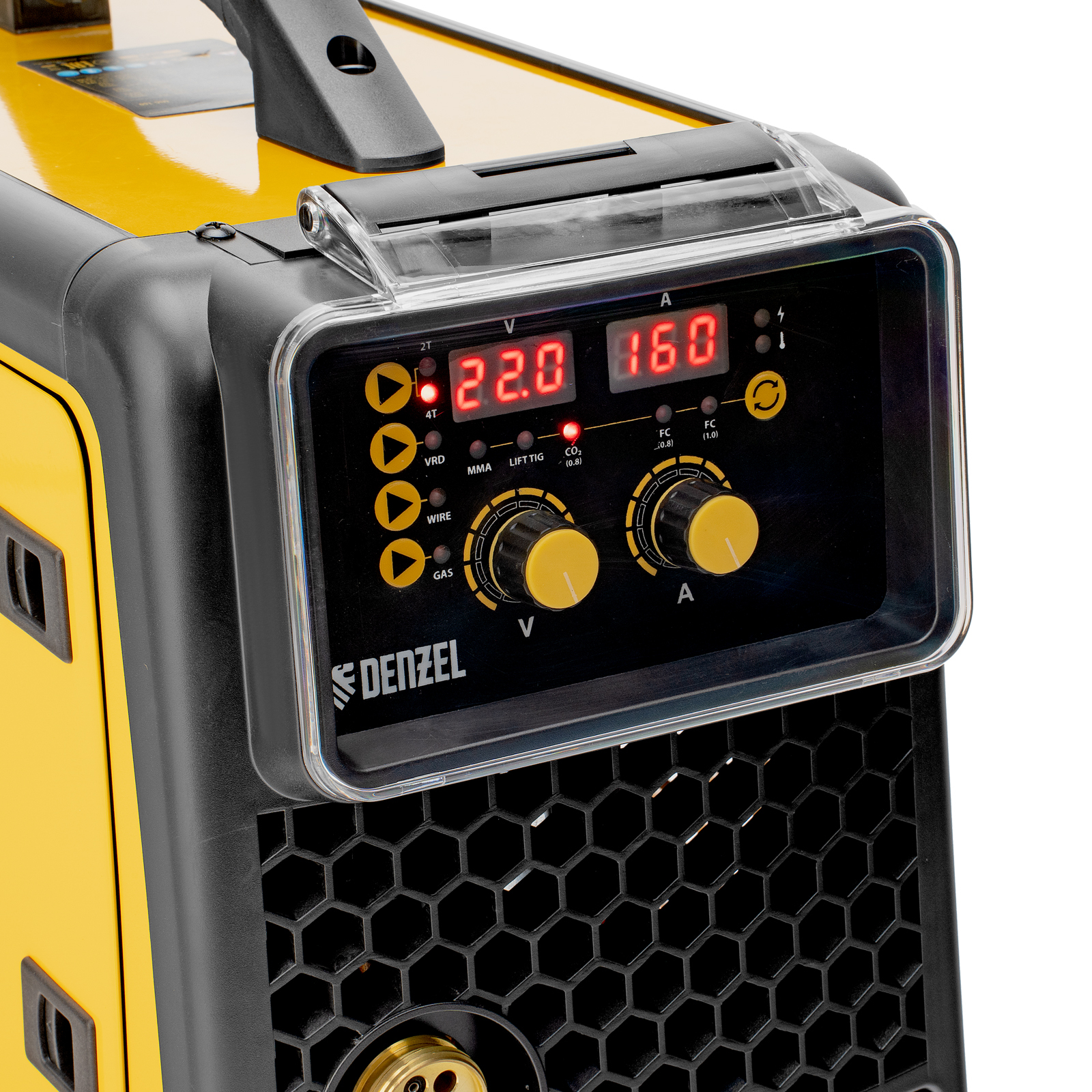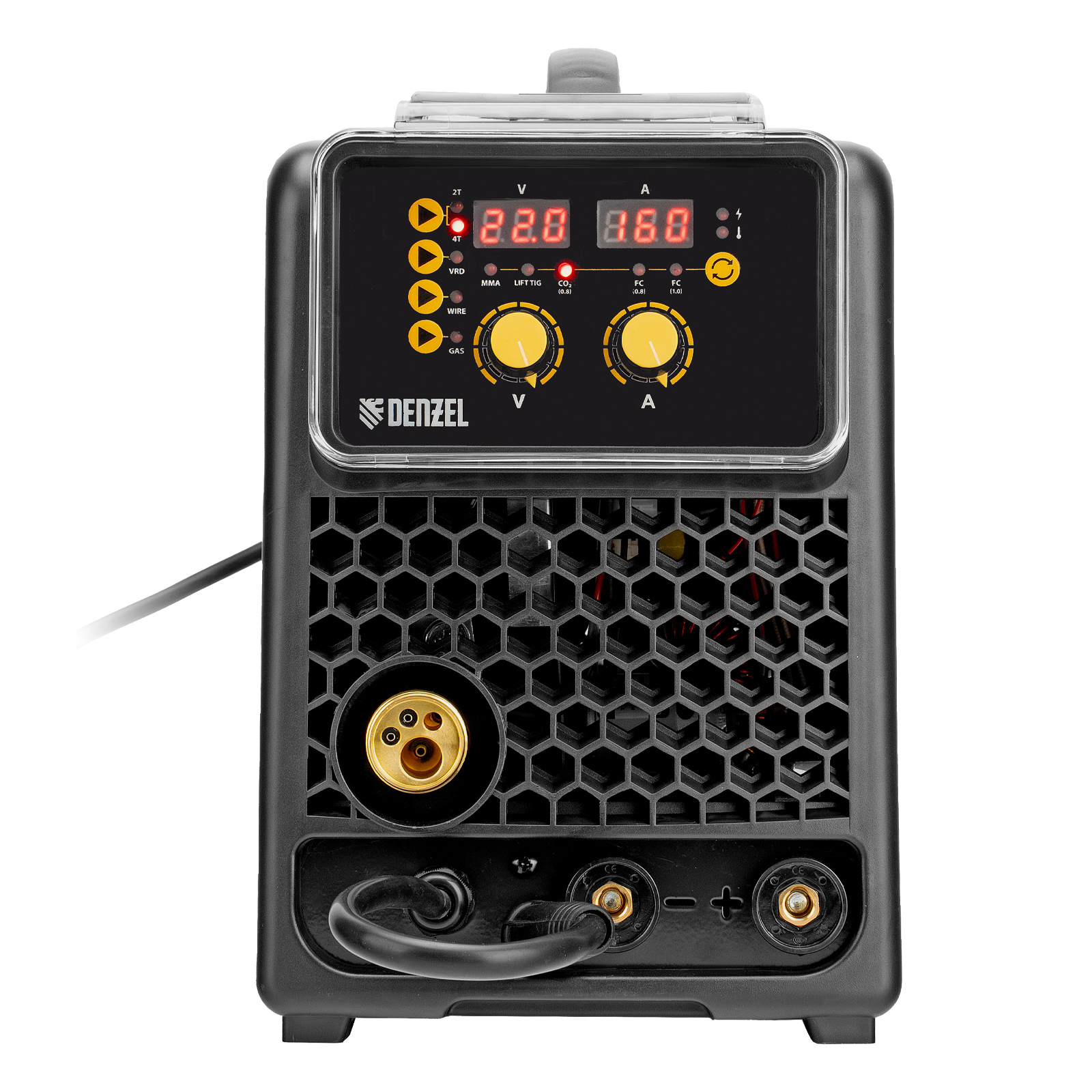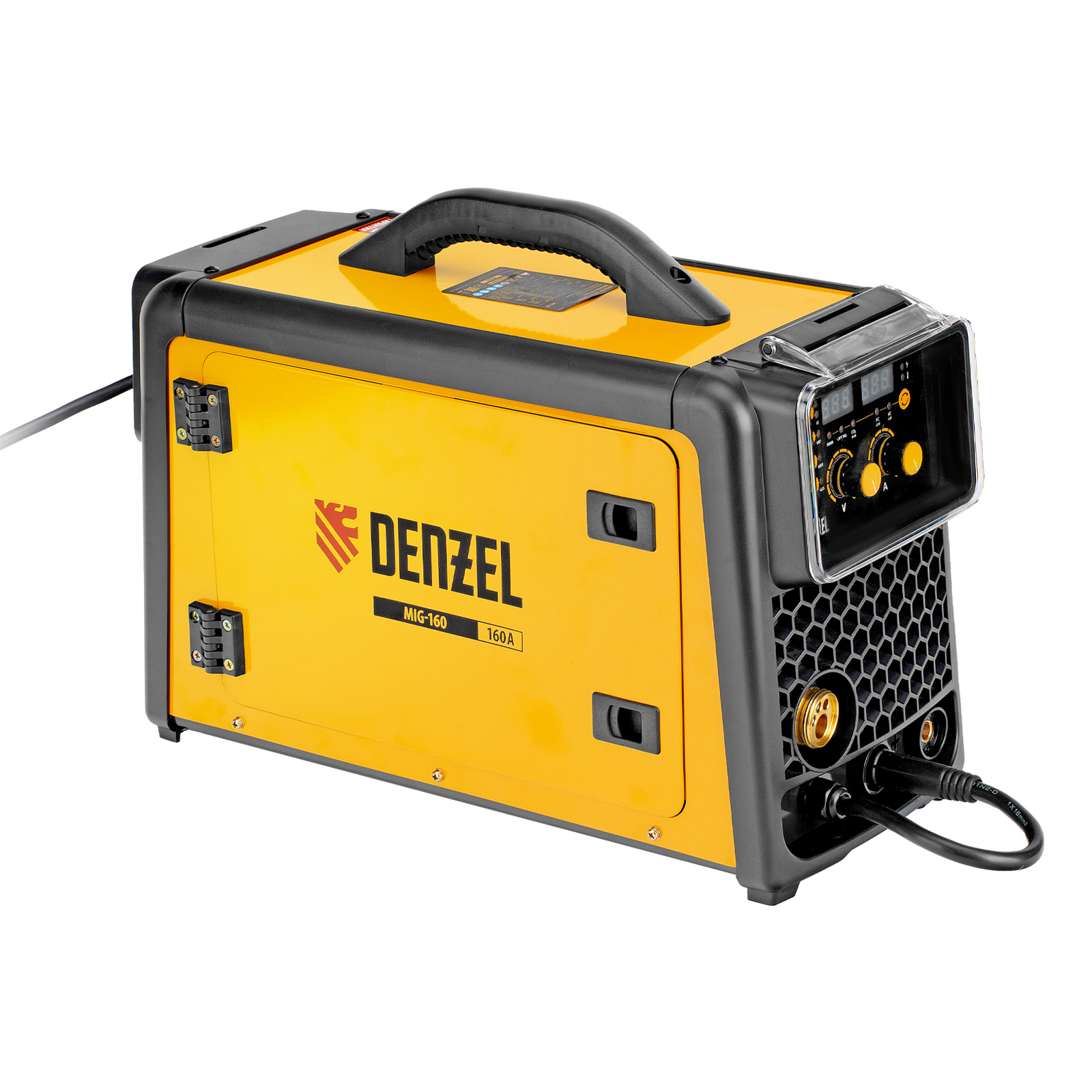 Инверторный аппарат полуавтоматической сварки Denzel MIG-160 94309 совместим с катушками массой до 5 кг, работает со максимальным сварочным током 160 A, продолжительность включения составляет 60%. Возможна сварка в среде защитного газа (MIG), порошковой проволокой (FCAW), аргонодуговая сварка неплавящимся электродом (Lift TIG, горелка приобретается отдельно), а также ручная дуговая сварка покрытым электродом (MMA).