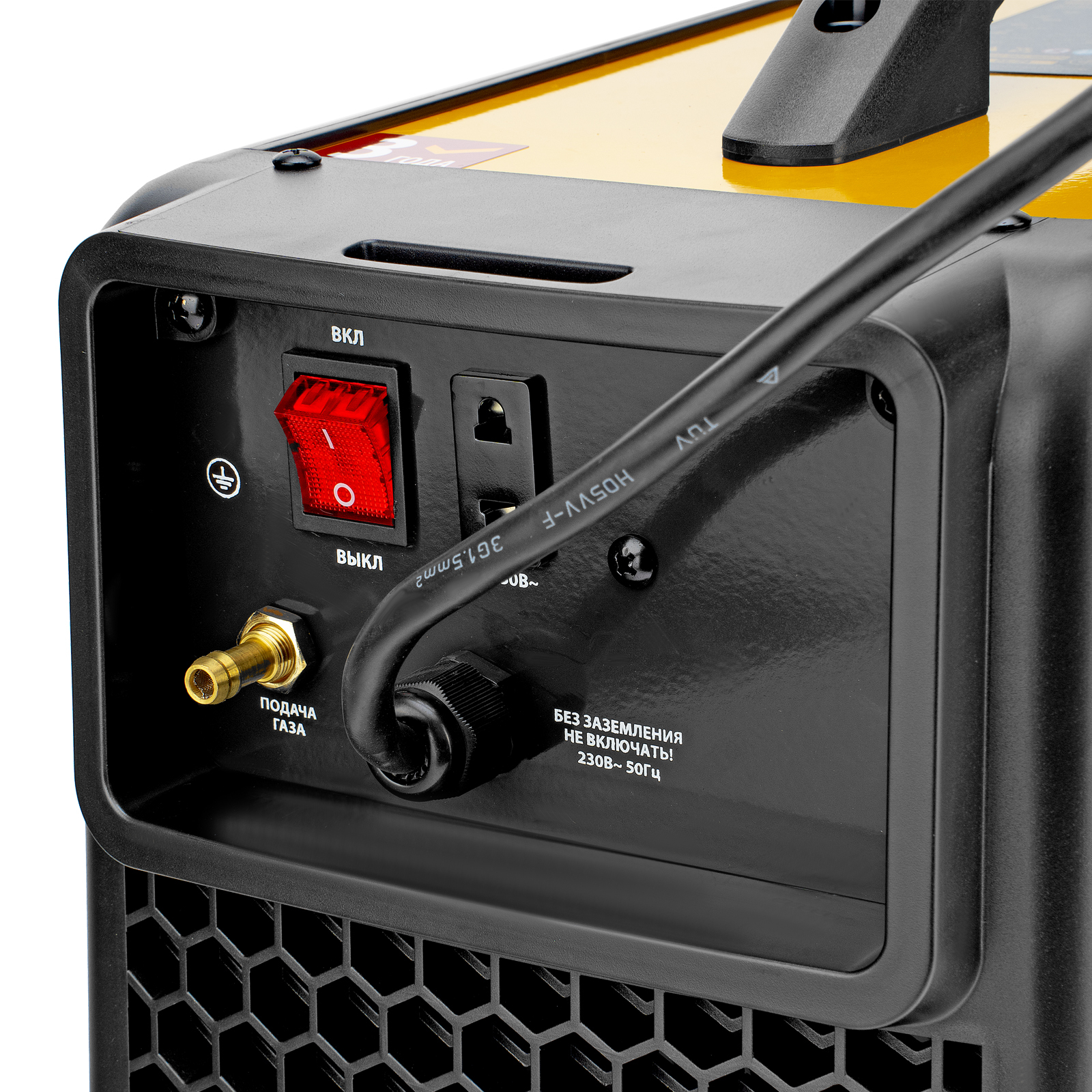- Удобный контроль рабочих параметров — на двух дисплеях отображаются значения заданного и текущего напряжения, а также установленного и сварочного тока.