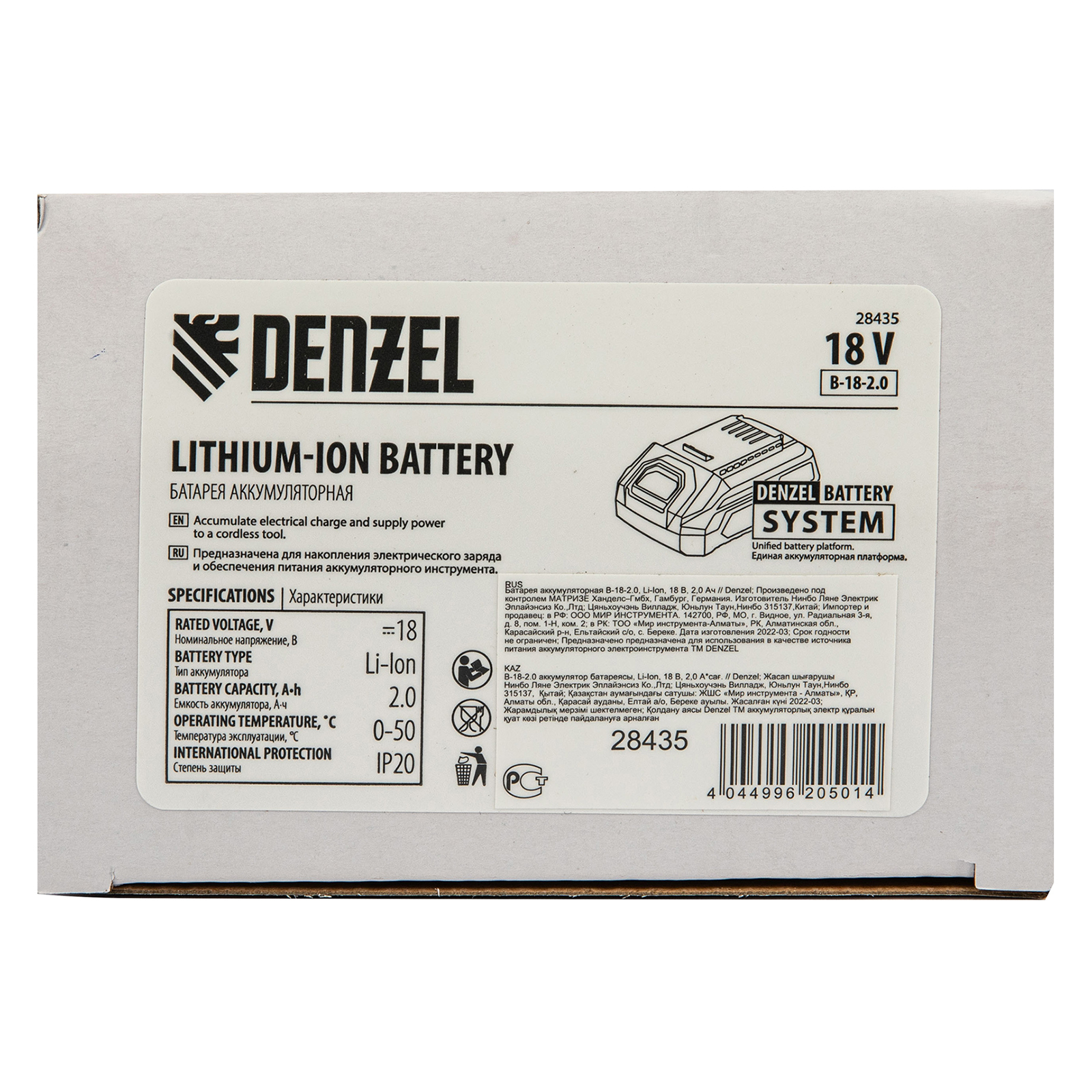 Батарея Li-Ion Denzel B-18-2.0 28435 на 2,0 Ач, номинальным напряжением 18 В, предназначена для обеспечения бесперебойной работы аккумуляторного инструмента. Совместима со всеми инструментами 18V Denzel battery system серии IB и соответствующими зарядными устройствами. Благодаря отсутствию эффекта памяти аккумулятор сохраняет максимальную эффективность на протяжении всего срока службы.