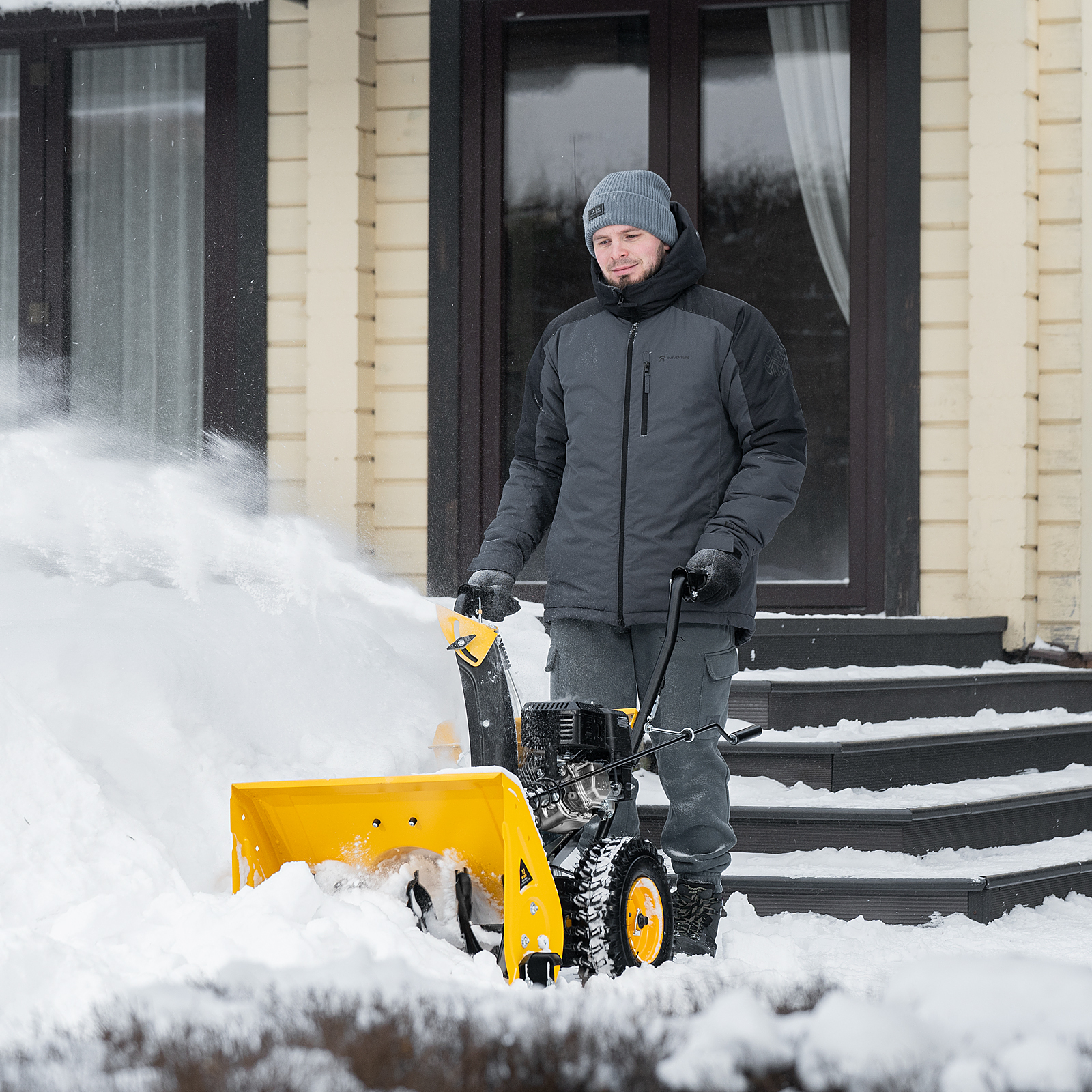 - Экономия сил и времени — снегоуборочная машина оснащена приводом на колеса, а значит, ее не придется толкать во время работы.
