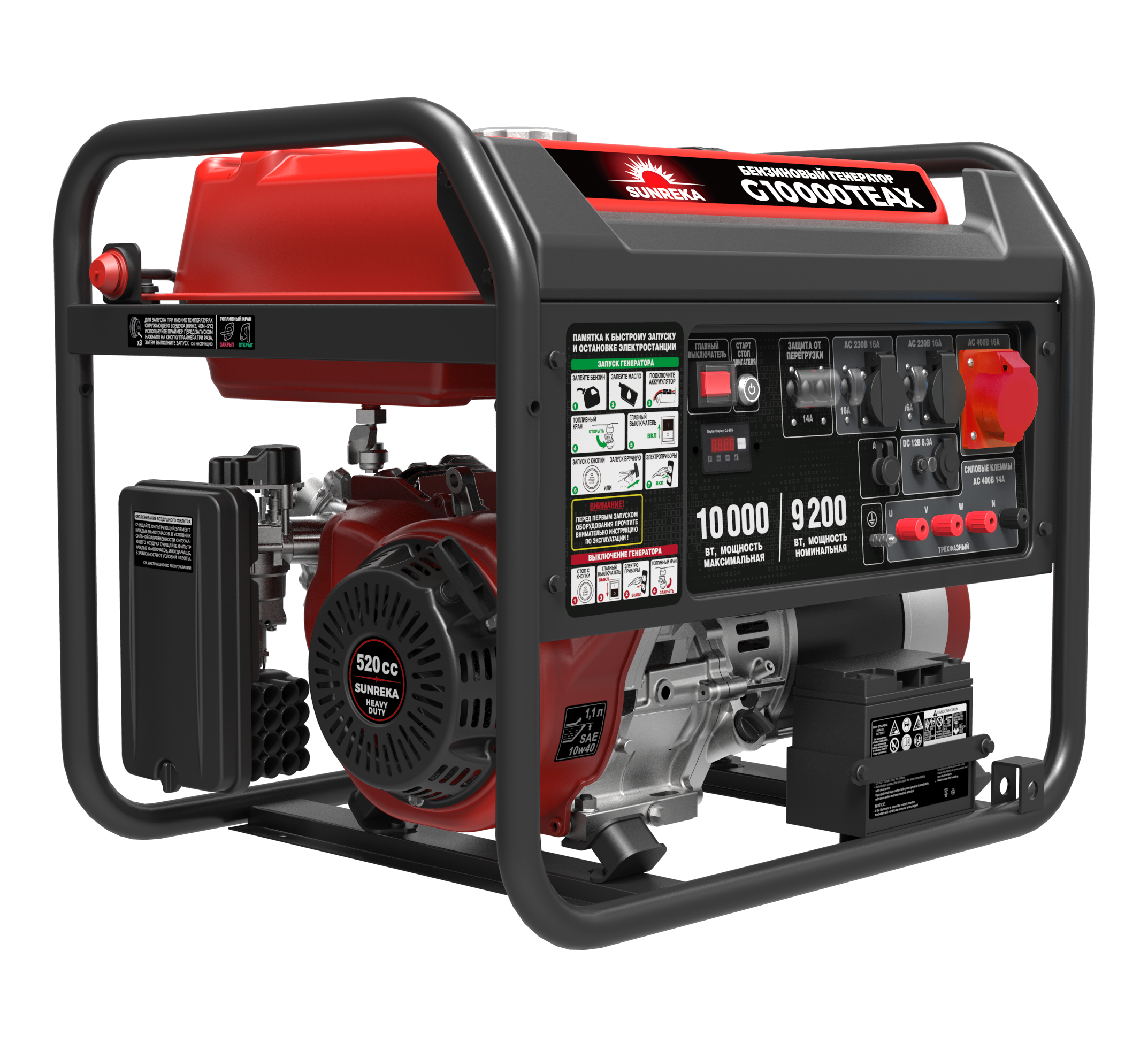 Генератор G10000TEAX номинальной мощностью 9,2 кВт с возможностью организации автоматического ввода резерва идеально подходит в качестве резервной установки для обеспечения непрерывного электроснабжения загородного дома, мастерской, автосервиса. Также, его мощность, надежность и функционал покрывают все необходимые потребности для использования в качестве электростанции для коммунальных, аварийных и строительных работ: функция высоких пусковых токов обеспечит стабильность запуска компрессоров, сильно нагруженного инструмента и строительного оборудования.
