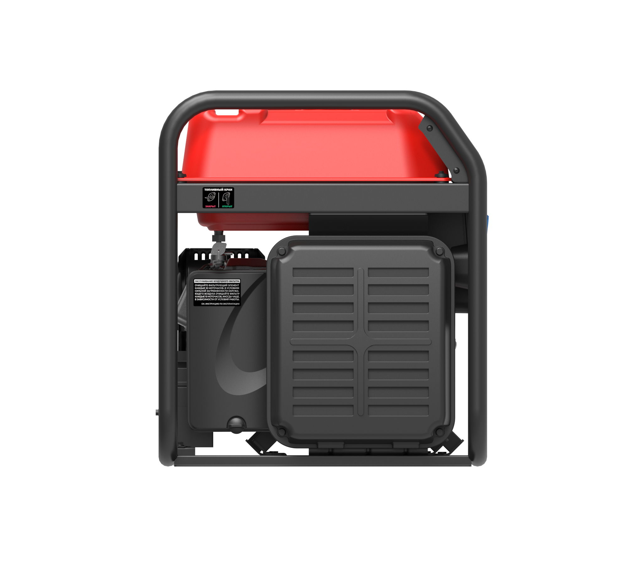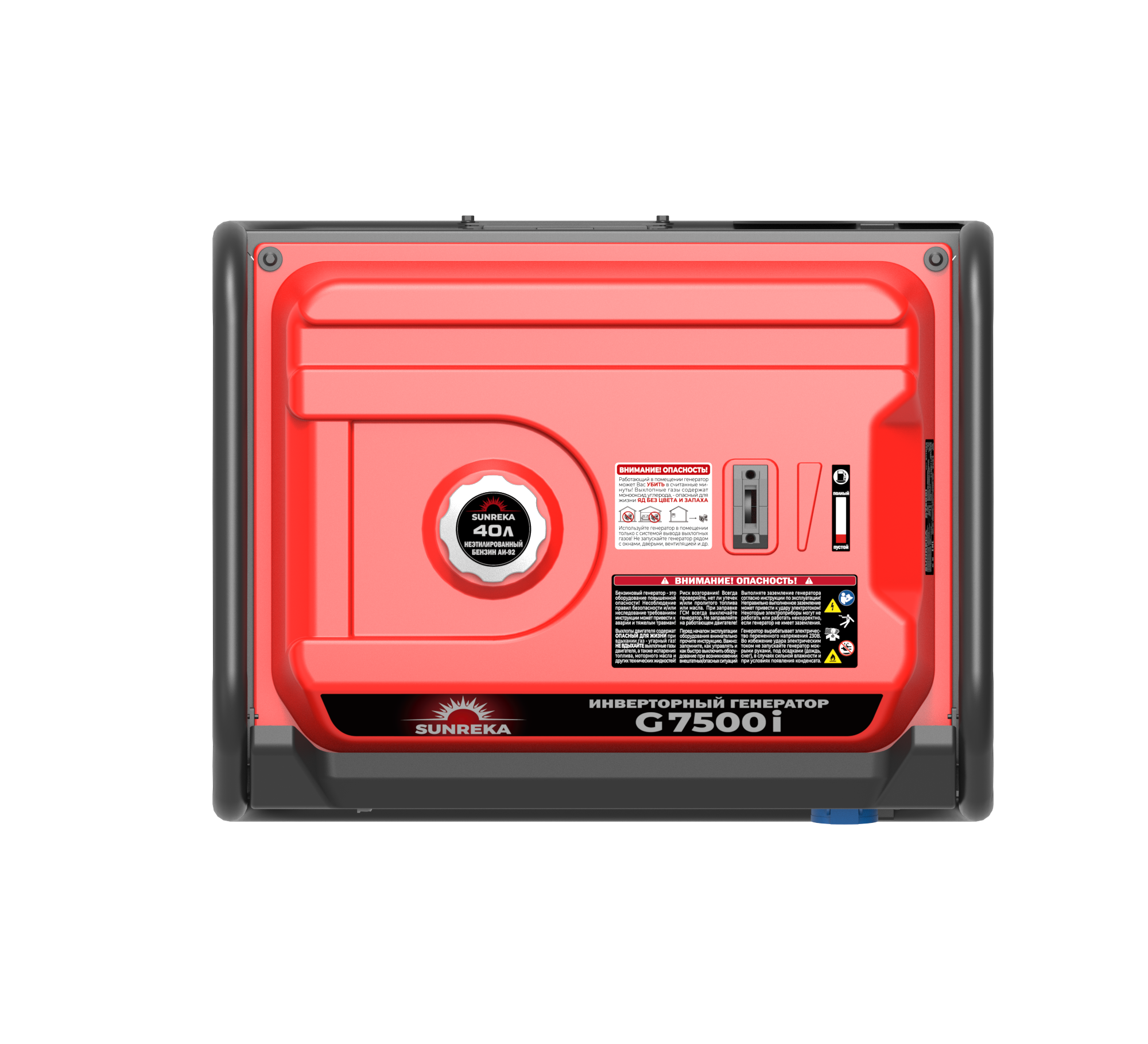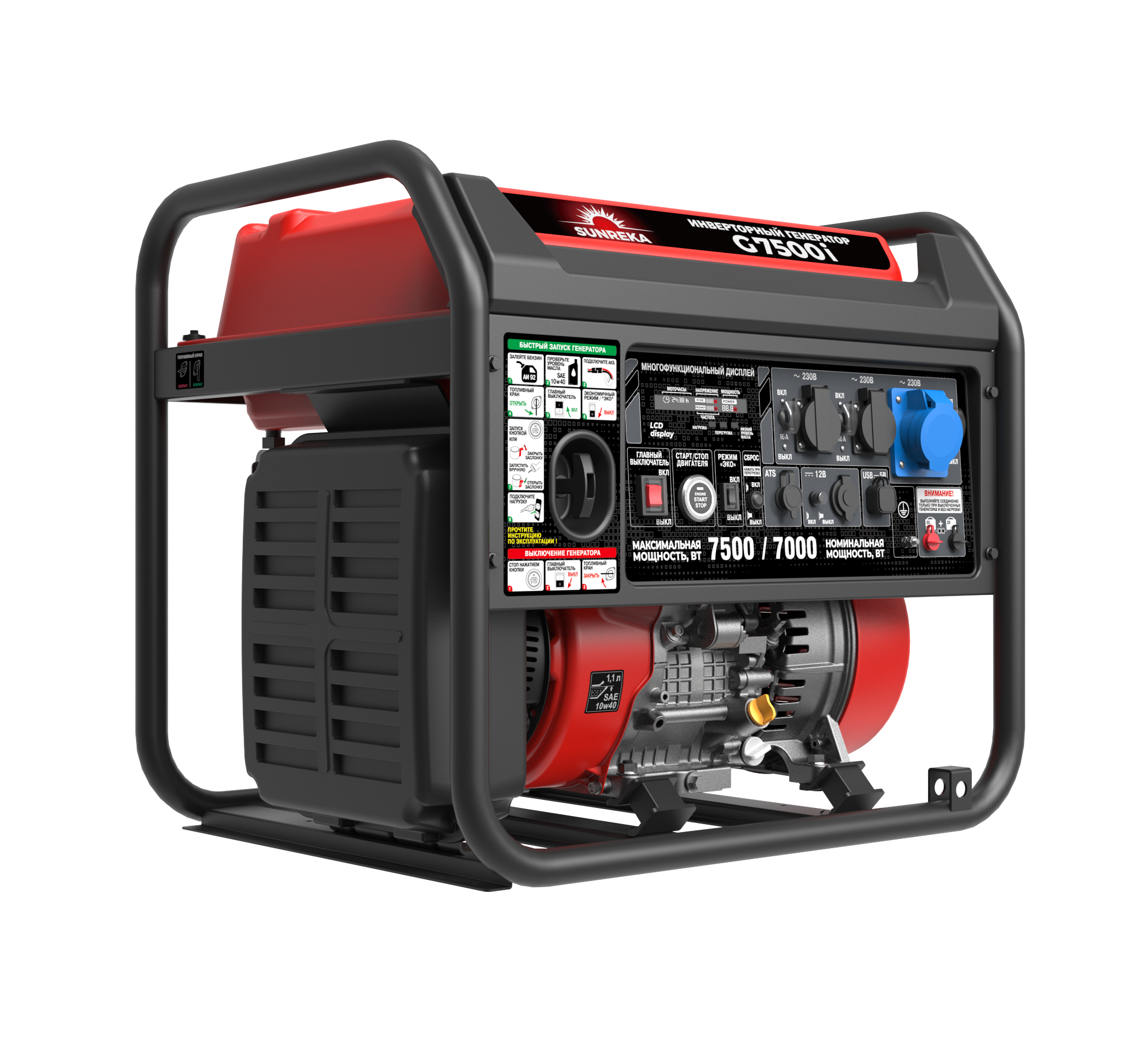 Прочная рама G7500i обеспечивает сохранность основных узлов, уровень шума на расстоянии 7 метров во время работы генератора: не более 73 дБ(А), что значительно тише обычного синхронного бензинового генератора. Двигатель генератора G7500i рабочим объемом 458 см³ запускается ручным стартером быстро и легко, а карбюратор с рычагом управления воздушной заслонкой позволяет контролировать запуск и прогрев двигателя при низких температурах. А также, генератор оснащен электростартером – запустить генератор можно простым нажатием кнопки START!
