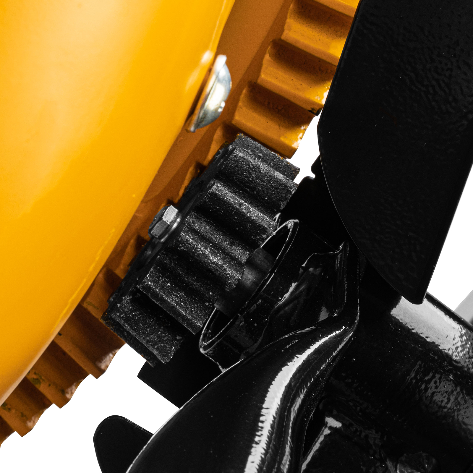 - Фиксация угла наклона барабана — в конструкции бетоносмесителя предусмотрена педаль, позволяющая фиксировать бак в нужном положении и дозировать выгрузку готовой смеси.