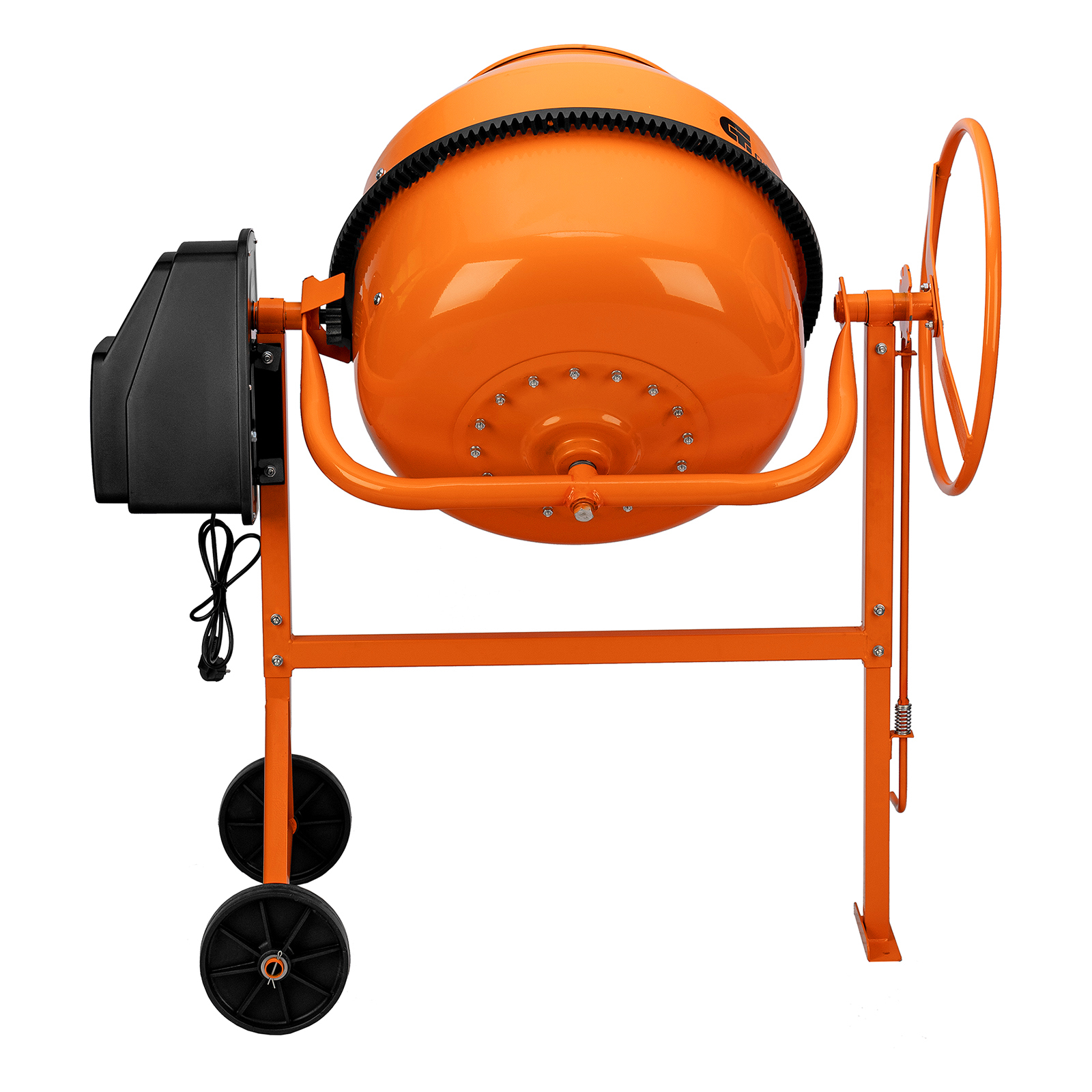 - Продуманная конструкция — увеличенный диаметр колес обеспечивает устойчивость бетоносмесителя во время работы, а также упрощает его перемещение по рабочей площадке.