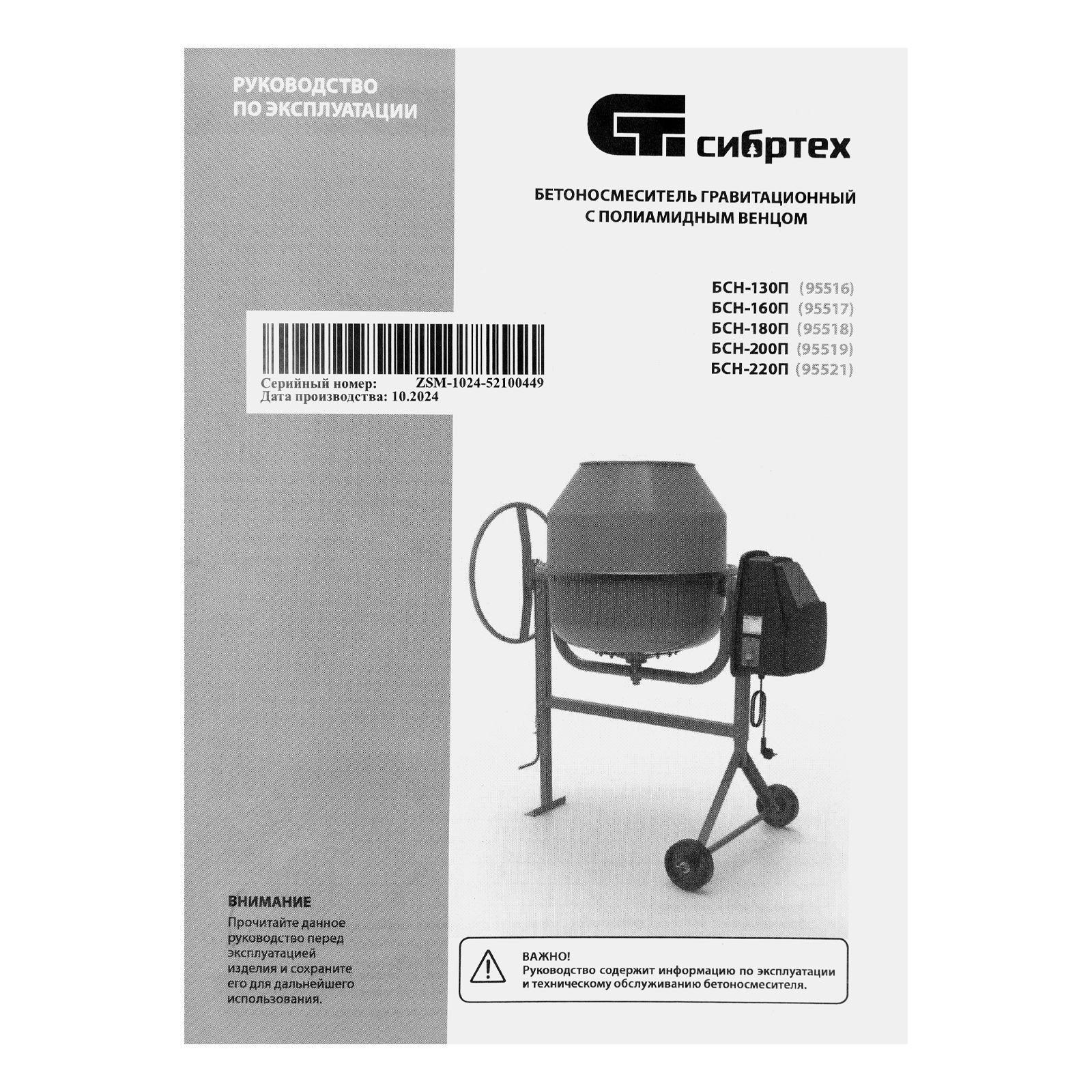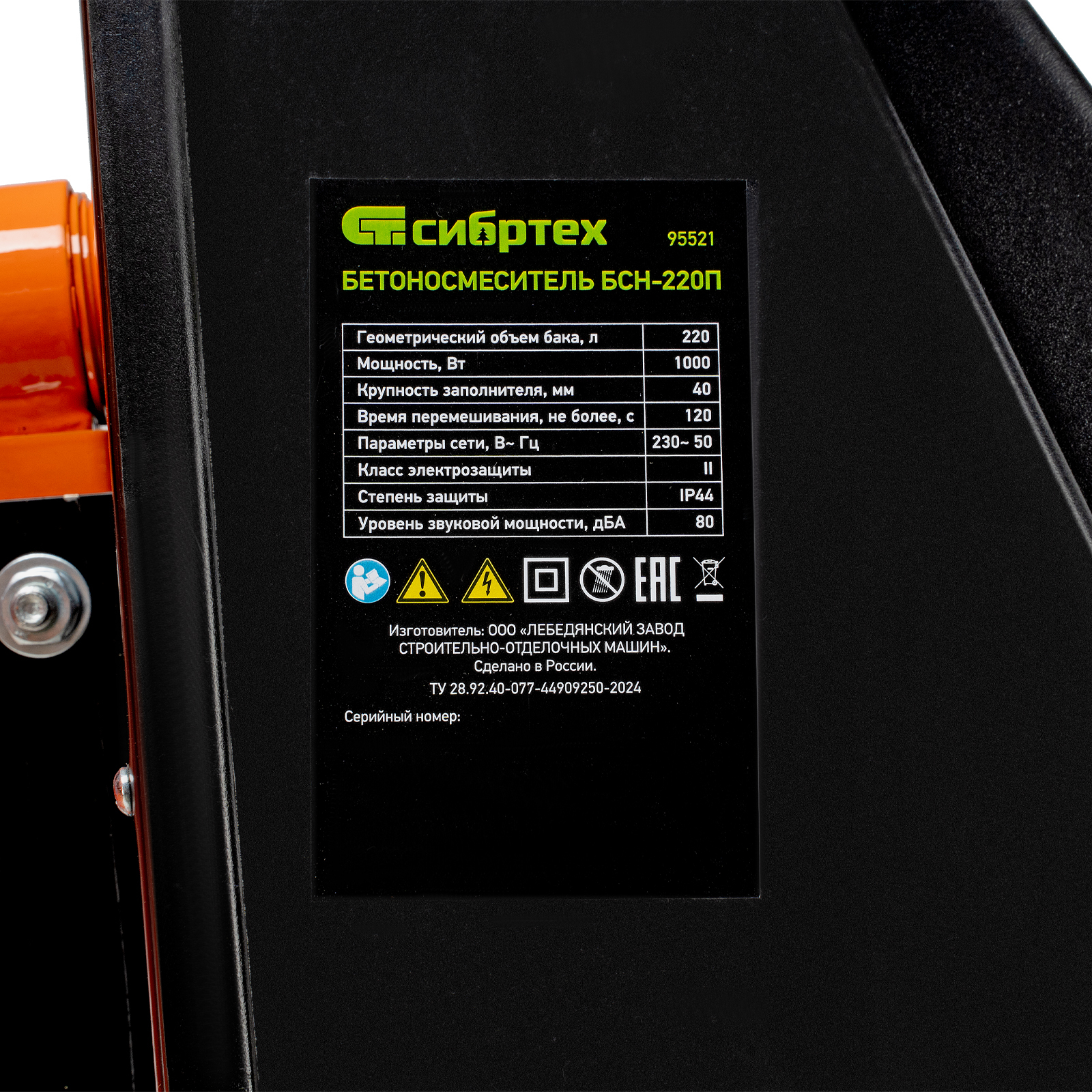 Бетоносмеситель БСН-220П, мощность 1000 Вт, полиамидный венец Сибртех