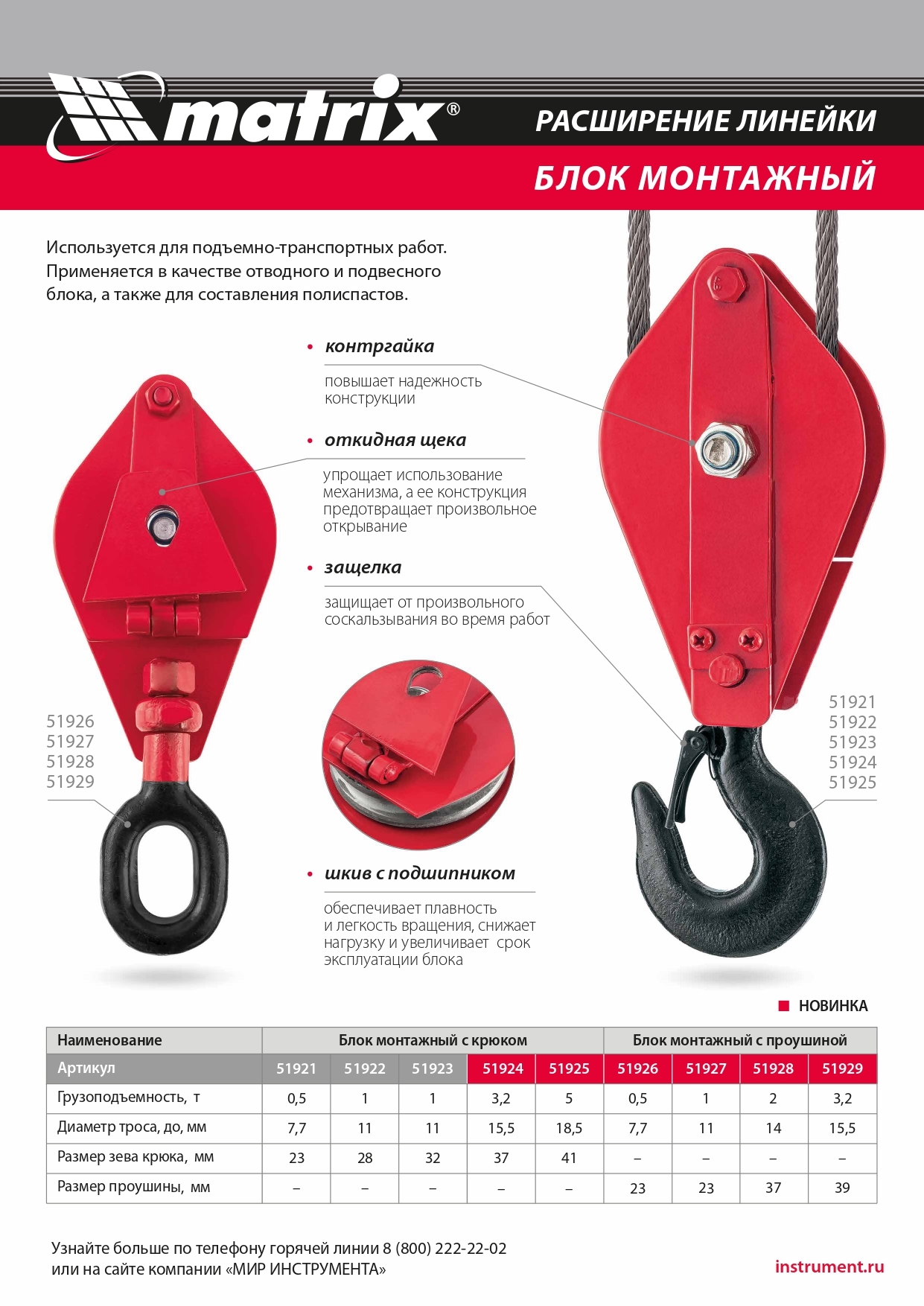 <p>Монтажный блок с проушиной Matrix 51926 грузоподъемностью 0,5 т расширяет функциональные возможности ручного и электрического грузоподъемного оборудования. Он позволяет менять направление движения груза, а также увеличивает подъемную силу.</p><h2>Преимущества</h2><ul><li>Откидная щека позволяет удобно установить трос или канат.</li></ul><ul><li>Блок пригодится при выполнении погрузочно-разгрузочных и монтажных работ на стройке, производстве и т.д.</li></ul>
