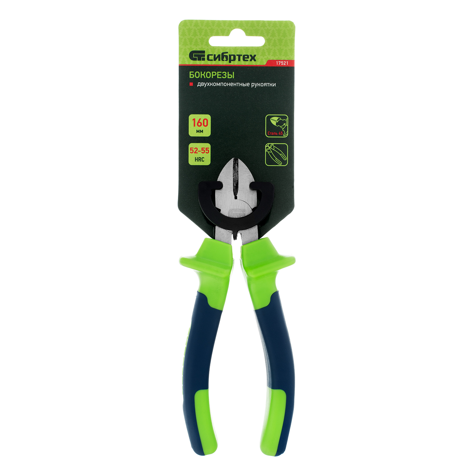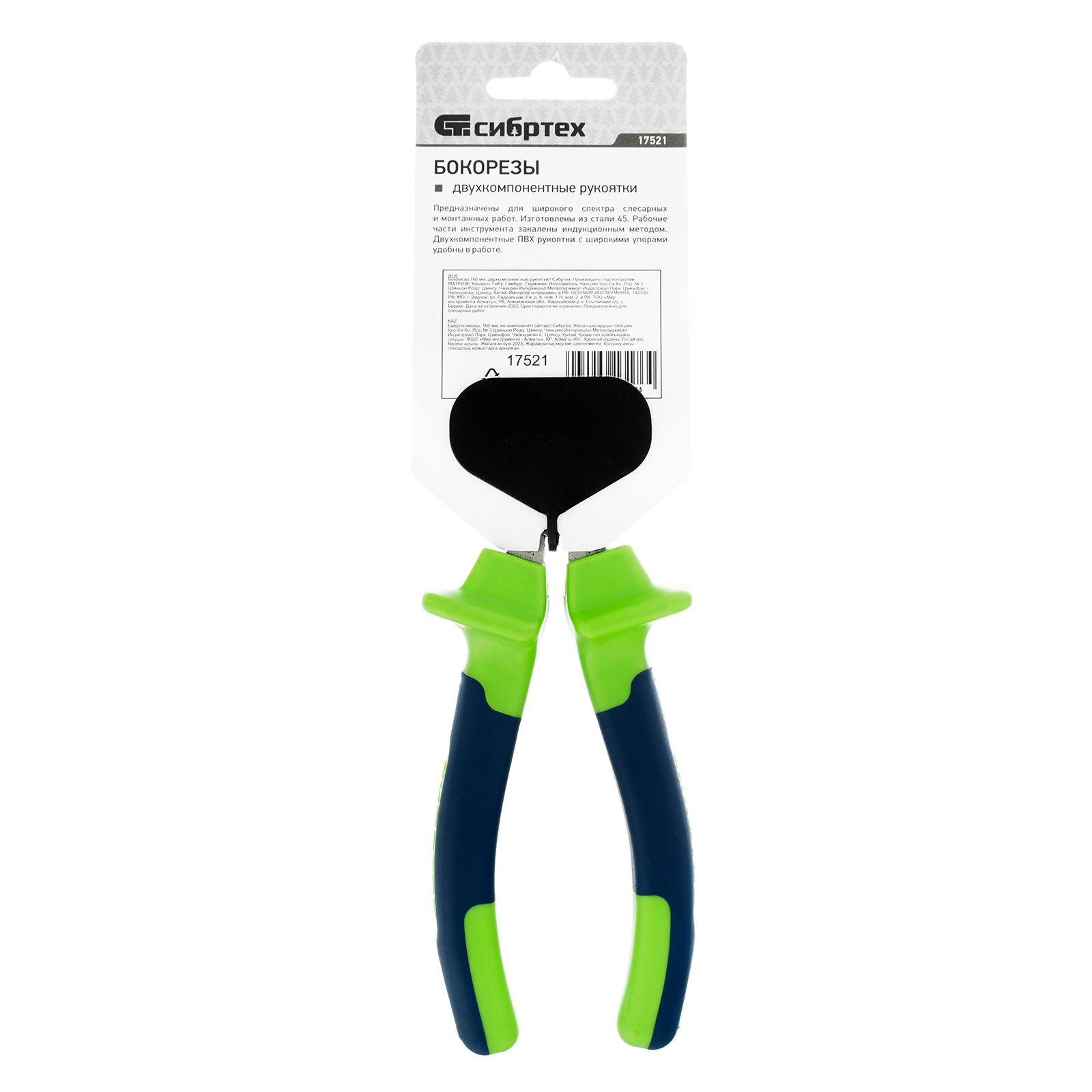 <p>Бокорезы Сибртех 17521 длиной 160 мм, с двухкомпонентными рукоятками, используются для перерезания проволоки, стержней, пластиковых прутков и других материалов. Пригодятся для слесарных и монтажных работ на строительной площадке, в мастерской, а также дома и в гараже.</p><h2>Преимущества</h2><ul><li>Прочность и износостойкость — рабочие части из выполнены легированной стали 45, прошли индукционную закалку и шлифовку.</li><li>Безопасная работа — благодаря широким ограничительным выступам на рукоятках пальцы не соскальзывают к рабочим частям.</li><li>Эргономичность — двухкомпонентные рукоятки из ПВХ обеспечивают надежный хват и снижают нагрузку на руки.</li></ul>