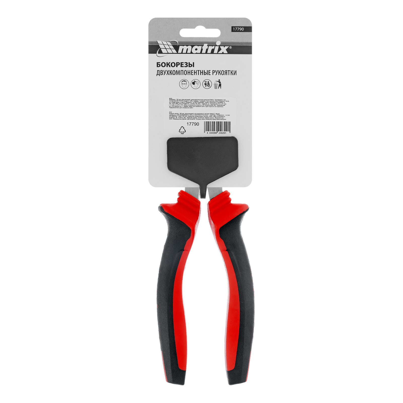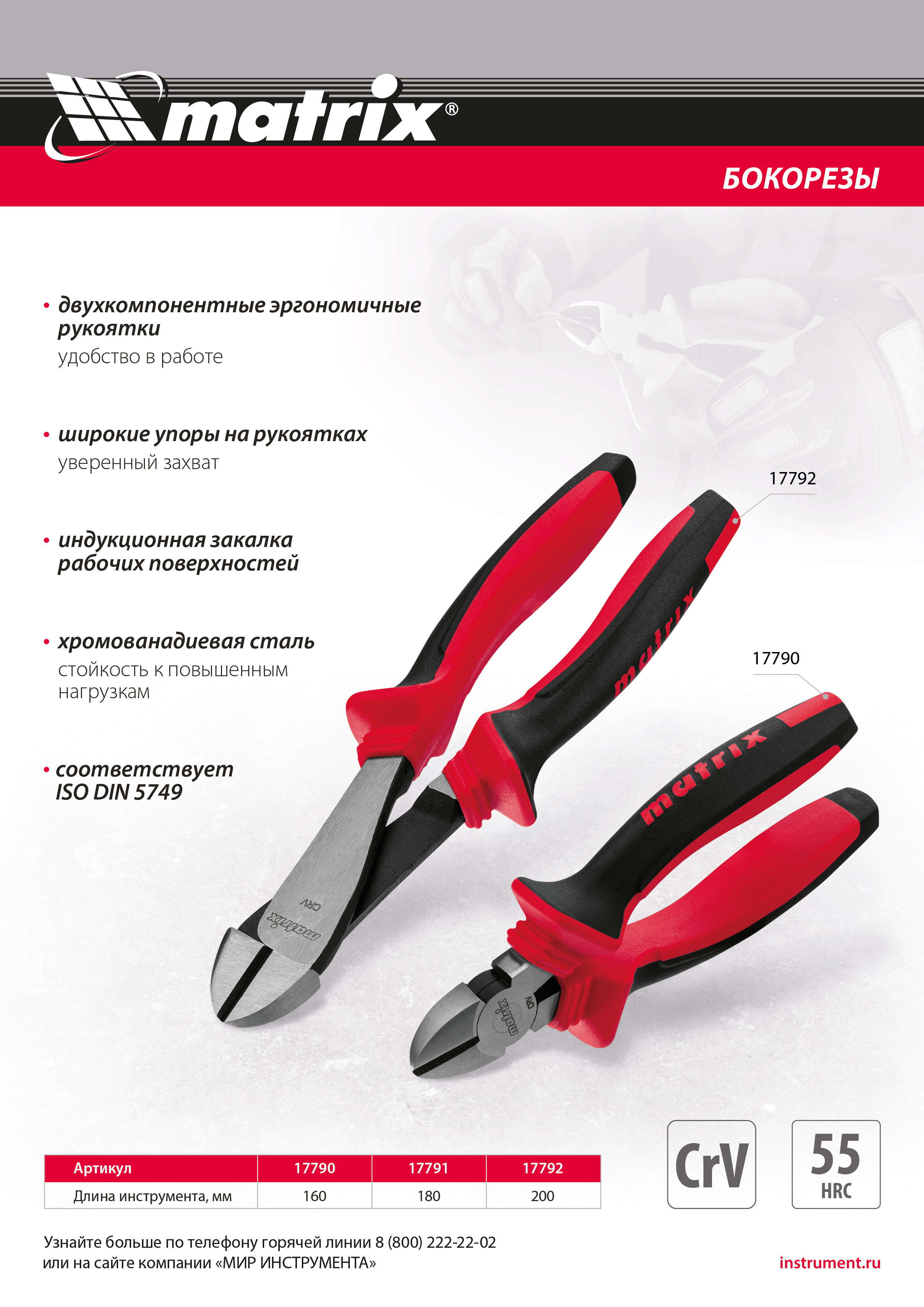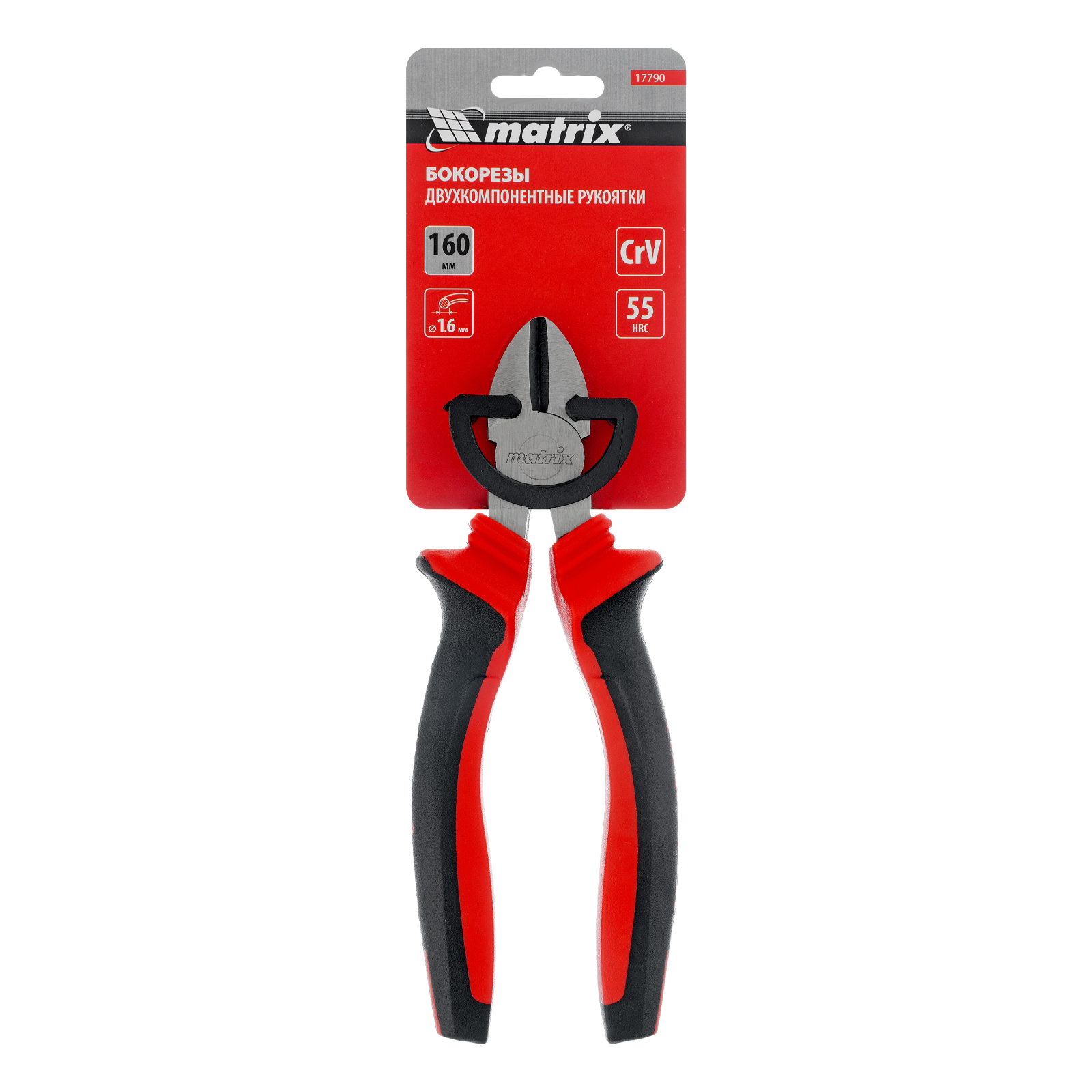 <p>Бокорезы Matrix 17790 длиной 160 мм, из хромованадиевой стали, с двухкомпонентными рукоятками, предназначены для выполнения слесарных и ремонтно-монтажных работ: разрезания проводов, кабелей, стальной проволоки и гвоздей диаметром до 1,6 мм. Пригодятся в частной мастерской или на строительной площадке, будут полезны не только начинающему мастеру, но и профессионалу.</p><h2>Преимущества</h2><ul><li>Надежность — губки выполнены из прочной стали 40 CrV и прошли лазерную закалку до твердости 52-58 HRC.</li><li>Защита от разрушения — отполированные рабочие части фосфатированы для предотвращения образования коррозии.</li><li>Комфортная работа — эргономичные двухкомпонентные рукоятки с упорами и антискользящим покрытием обеспечивают надежный хват.</li></ul>