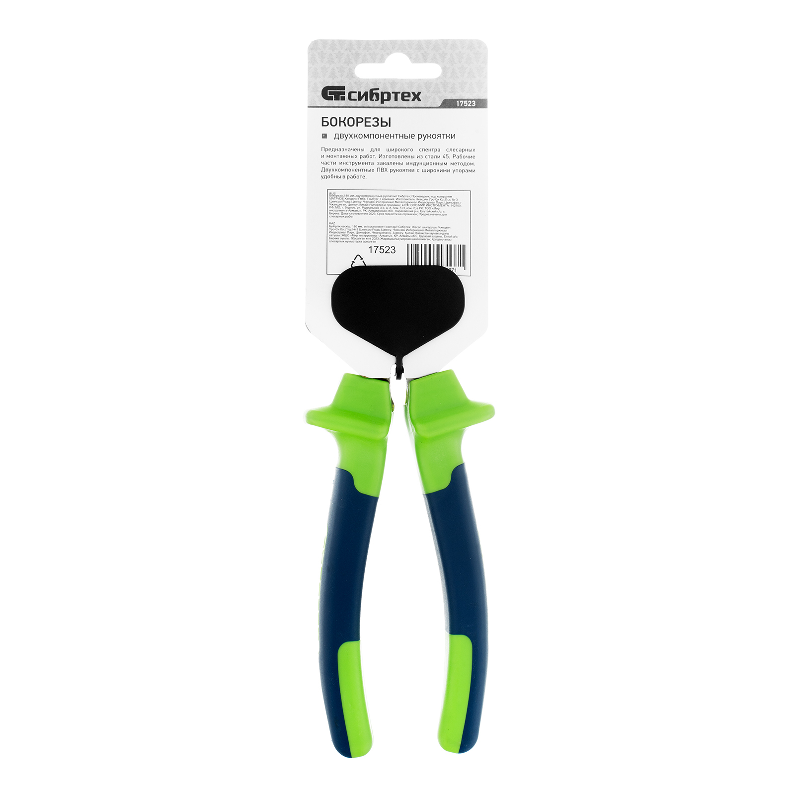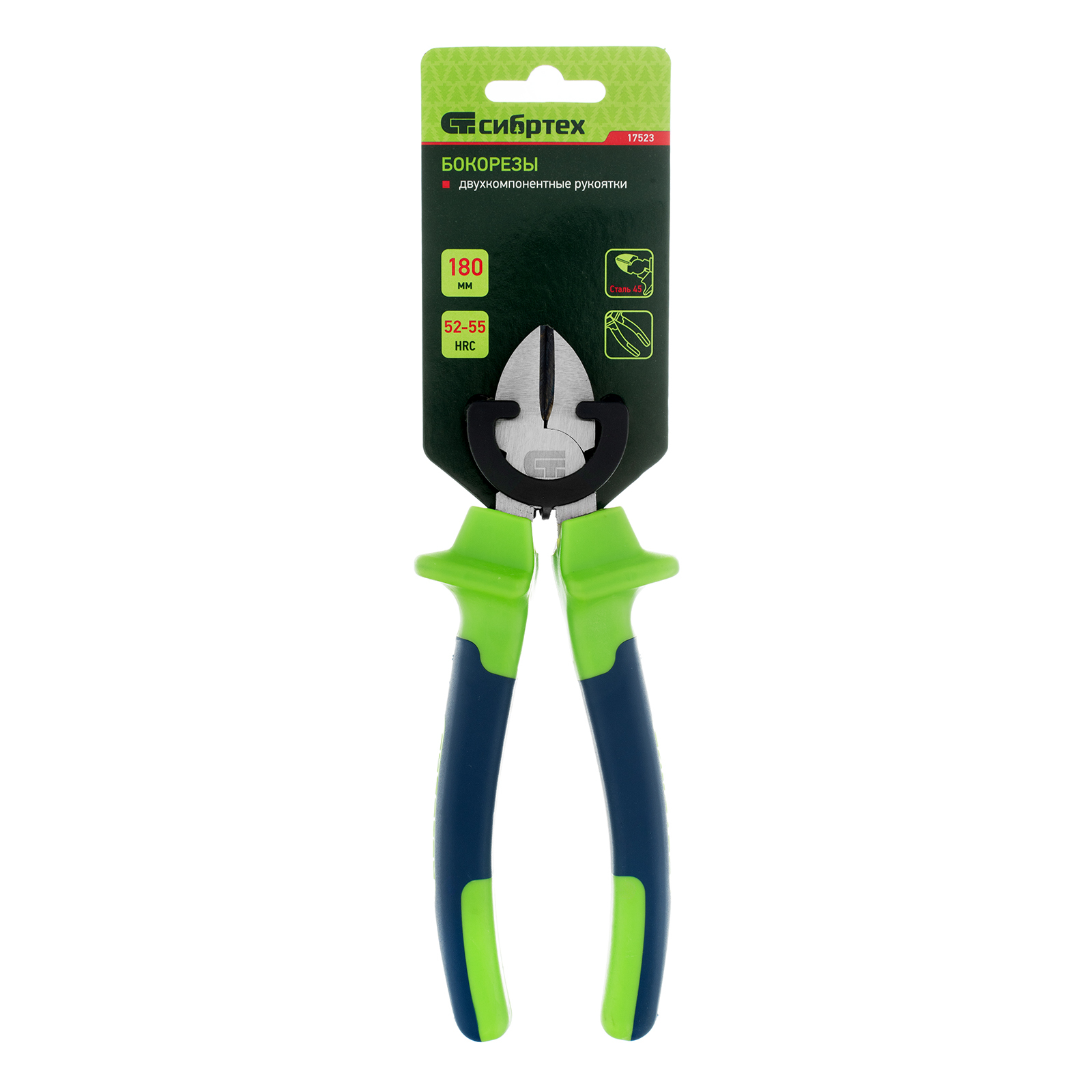 <p>Бокорезы Сибртех 17523 длиной 180 мм, с двухкомпонентными рукоятками, используются для перерезания проволоки, стержней, пластиковых прутков и других материалов. Пригодятся для слесарных и монтажных работ на строительной площадке, в мастерской, а также дома и в гараже.</p><h2>Преимущества</h2><ul><li>Прочность и износостойкость — рабочие части из выполнены легированной стали 45, прошли индукционную закалку и шлифовку.</li><li>Безопасная работа — благодаря широким ограничительным выступам на рукоятках пальцы не соскальзывают к рабочим частям.</li><li>Эргономичность — двухкомпонентные рукоятки из ПВХ обеспечивают надежный хват и снижают нагрузку на руки.</li></ul>
