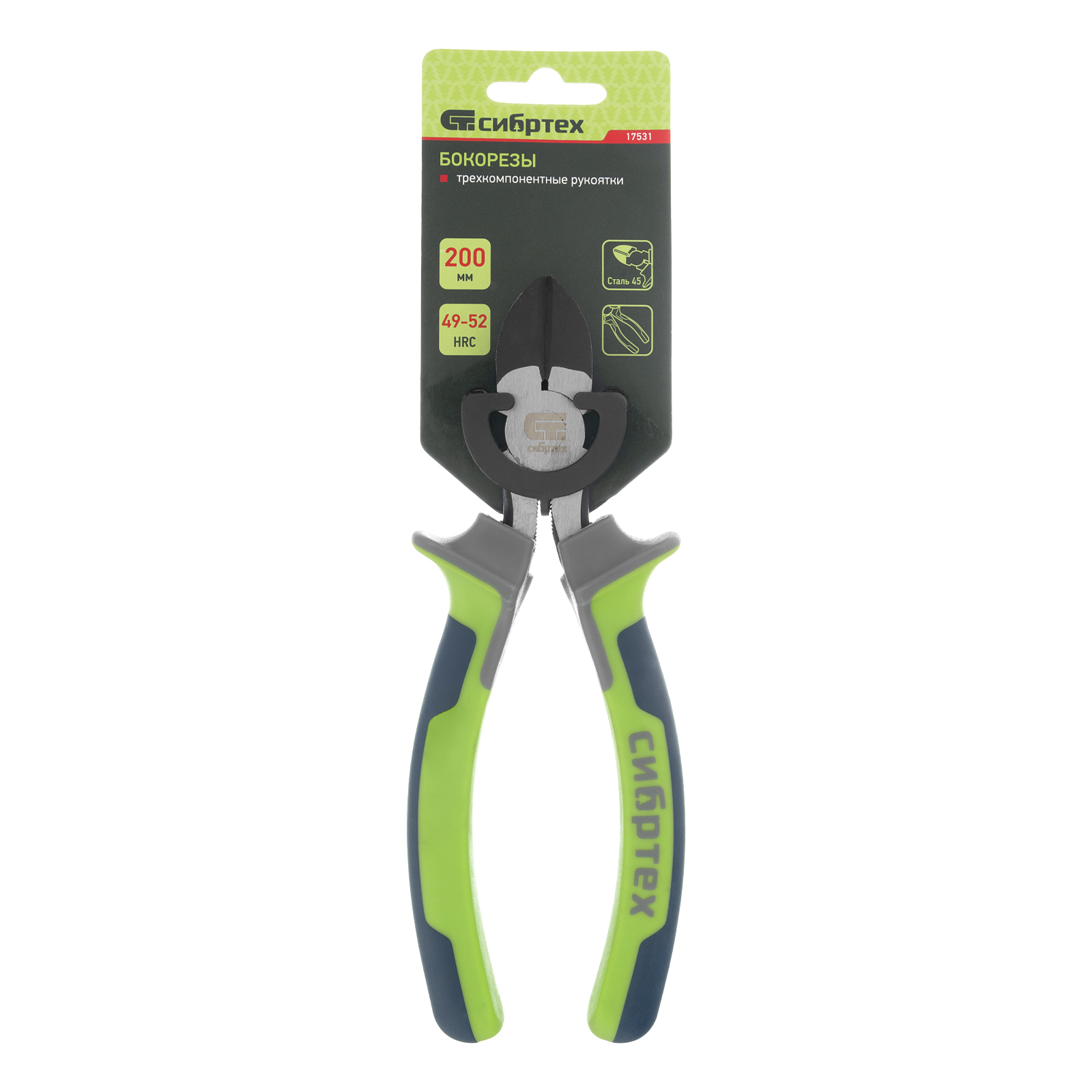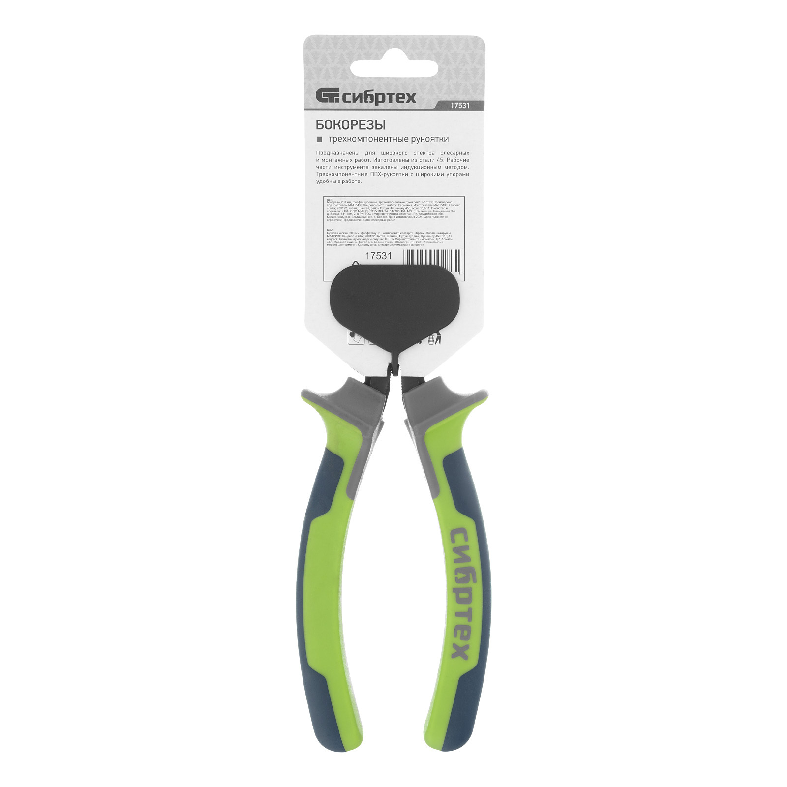 <p>Фосфатированные бокорезы Сибртех 17531 длиной 200 мм, с трехкомпонентными рукоятками, применяются для перекусывания проводов, проволоки и стержней, резки металлических и пластмассовых деталей. Будут полезны при проведении монтажных и слесарных работ дома, в гараже, а также в мастерской и на строительной площадке.</p><h2>Преимущества</h2><ul><li>Прочность и высокий ресурс — бокорезы выполнены из кованой и закаленной в масле стали 45, губки частично отшлифованы.</li><li>Защита от коррозии — фосфатированные рабочие части устойчивы к воздействию влаги.</li><li>Безопасная работа — широкие упоры препятствуют соскальзыванию руки к рабочим частям.</li><li>Эргономичность — трехкомпонентные рукоятки с антискользящим покрытием обеспечивают надежный хват.</li></ul>
