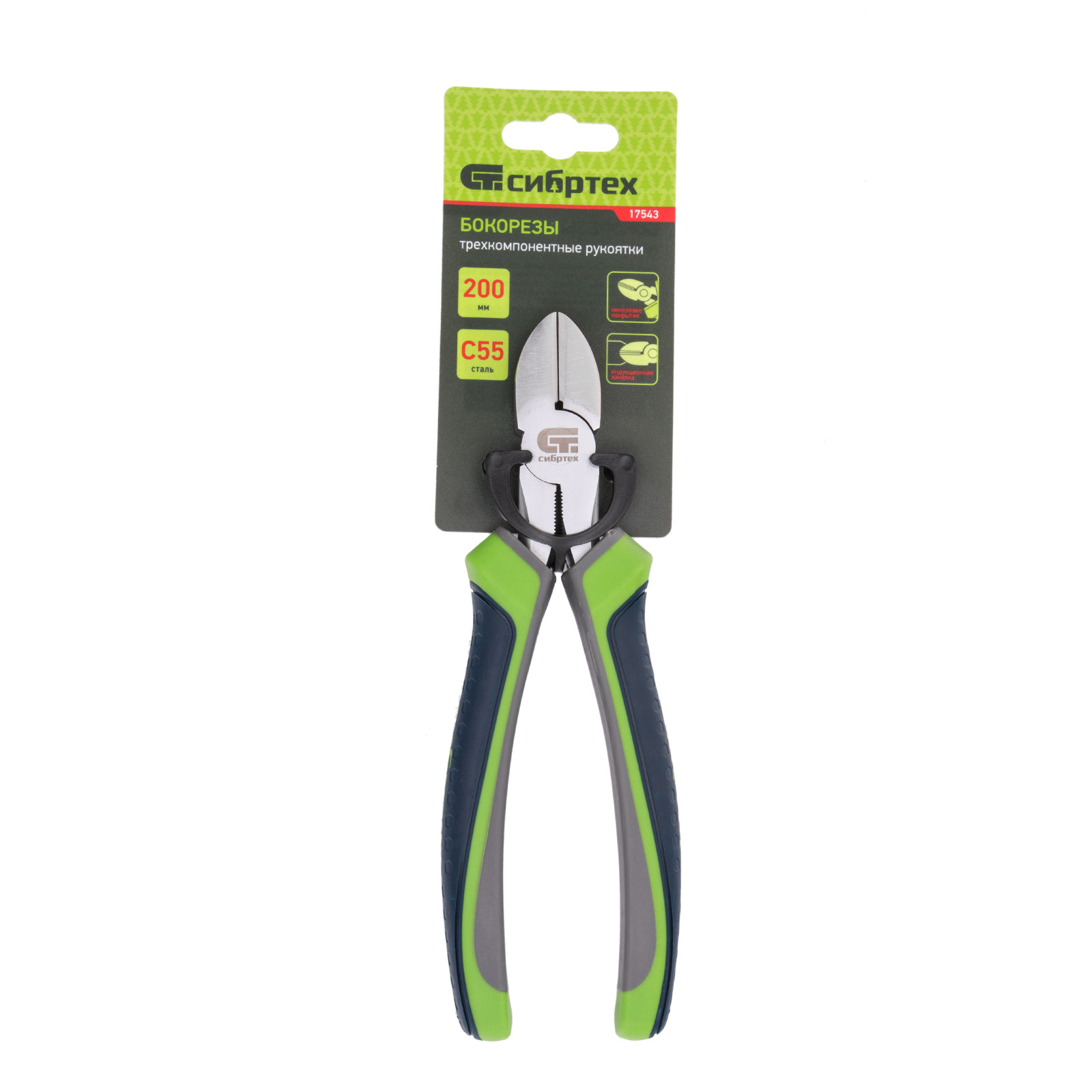 <p>Бокорезы Сибртех 17543 длиной 200 мм, с трехкомпонентными рукоятками, применяются при слесарных, монтажных и хозяйственных работах. Они позволяют быстро перекусить проволоку, кабели, провода, пластиковые прутки и другие детали. </p><h2>Преимущества</h2><ul><li>Высокое качество — рабочие части сделаны из конструкционной стали С55 методом ковки, поэтому обладают прочностью и устойчивостью к износу.</li><li>Антикоррозийные свойства — никелевое покрытие обеспечивает защиту от разрушения и долгий срок службы инструмента.</li><li>Комфортная работа — трехкомпонентные обрезиненные рукоятки с рельефным покрытием обеспечивают удобный и надежный захват инструмента.</li></ul>