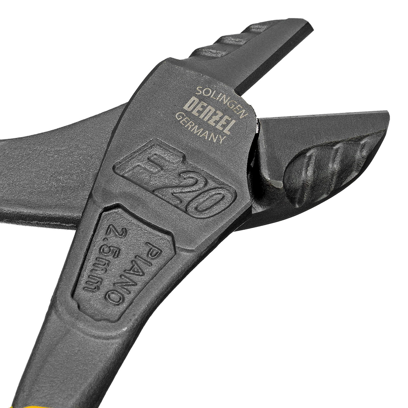 Усиленные бокорезы Denzel 17784 длиной 200 мм, с трехкомпонентными рукоятками, предназначены для разрезания кабелей, проводов, гвоздей и проволоки средней (750 Н/мм2) и высокой жесткости (1800 Н/мм2) диаметром 4 и 2,8 мм соответственно. Подходят для резки рояльных струн (предел прочности 2300 Н/мм2) диаметром до 2,5 мм. Успешно справляются не только с медными, алюминиевыми и пластмассовыми деталями, но и с более жесткими стальными элементами. Встроенный рычажный механизм и смещенный непосредственно к режущим кромкам шарнир увеличивают усилие реза на 20%.
