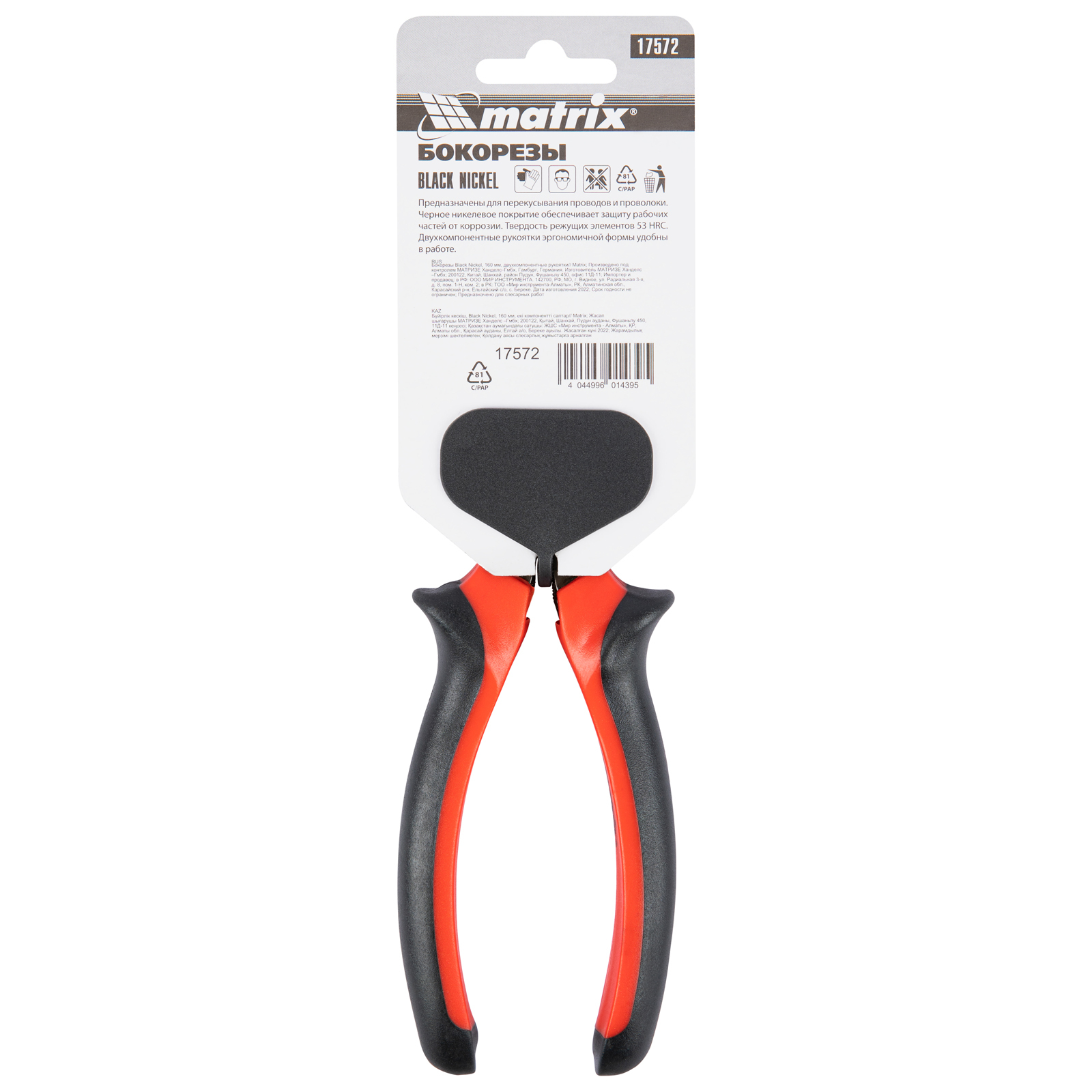 <p>Бокорезы Matrix Black Nickel 17572 длиной 160 мм, с двухкомпонентными рукоятками, используются для разрезания проводов, кабелей, проволоки и перекусывания гвоздей. Пригодятся как начинающим мастерам, так и профессионалам для проведения монтажных и ремонтных работ.</p><h2>Преимущества</h2><ul><li>Эффективность без лишних затрат — удлиненное шарнирное соединение позволяет выполнять работы с минимальными усилиями.</li><li>Прочность и высокий ресурс — губки выполнены из качественной углеродистой стали 45 твердостью 53 HRC.</li><li>Защита от коррозии и износоустойчивость — на рабочие части нанесено черное никелевое покрытие.</li><li>Безопасная эксплуатация — благодаря упорам на рукоятках пальцы не соскальзывают к режущим элементам.</li><li>Комфортная работа — двухкомпонентные эргономичные рукоятки обеспечивают надежный хват.</li></ul>