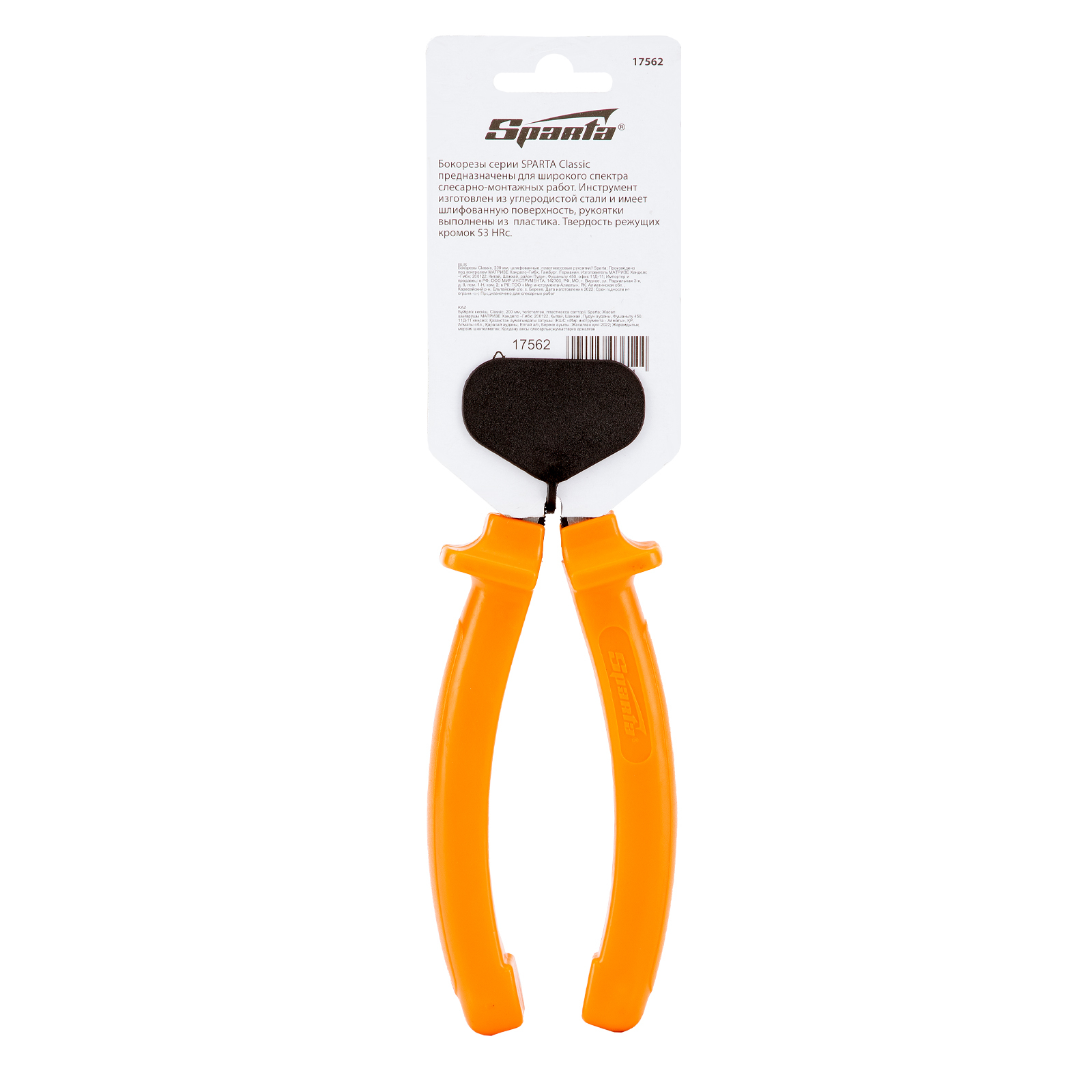 <p>Шлифованные бокорезы Sparta Classic 17562 длиной 200 мм, с пластмассовыми рукоятками, для проведения слесарно-монтажных работ. Успешно справляются с перекусыванием проволоки, алюминиевых и медных проводов, а также снятием изоляции с кабельных изделий. Инструмент пригодится не только в домашнем хозяйстве, но и на строительной площадке.</p><h2>Преимущества</h2><ul><li>Прочность и износостойкость — бокорезы выполнены из углеродистой стали марки У7, закаленной до твердости 45,5 HRC.</li><li>Быстрая и аккуратная работа без риска поломки— режущие кромки дополнительно закалены до твердости 53 HRC.</li><li>Высокое качество реза — рабочая поверхность отшлифована, что обеспечивает плотное прилегание губок.</li><li>Комфортная и безопасная работа — пластиковые рукоятки удобно лежат в руке, специальный выступы предотвращают соскальзывание пальцев на рабочую часть.</li></ul>