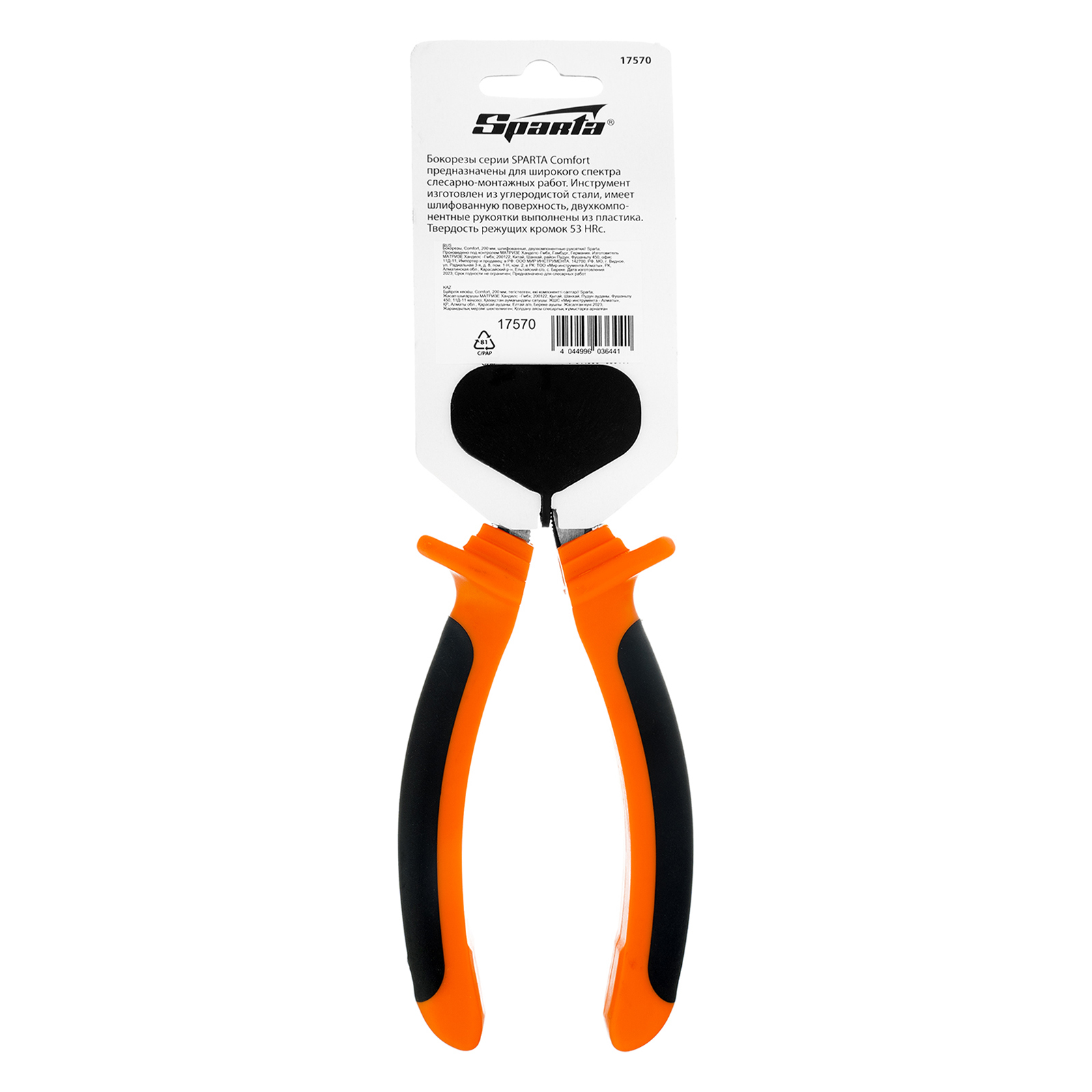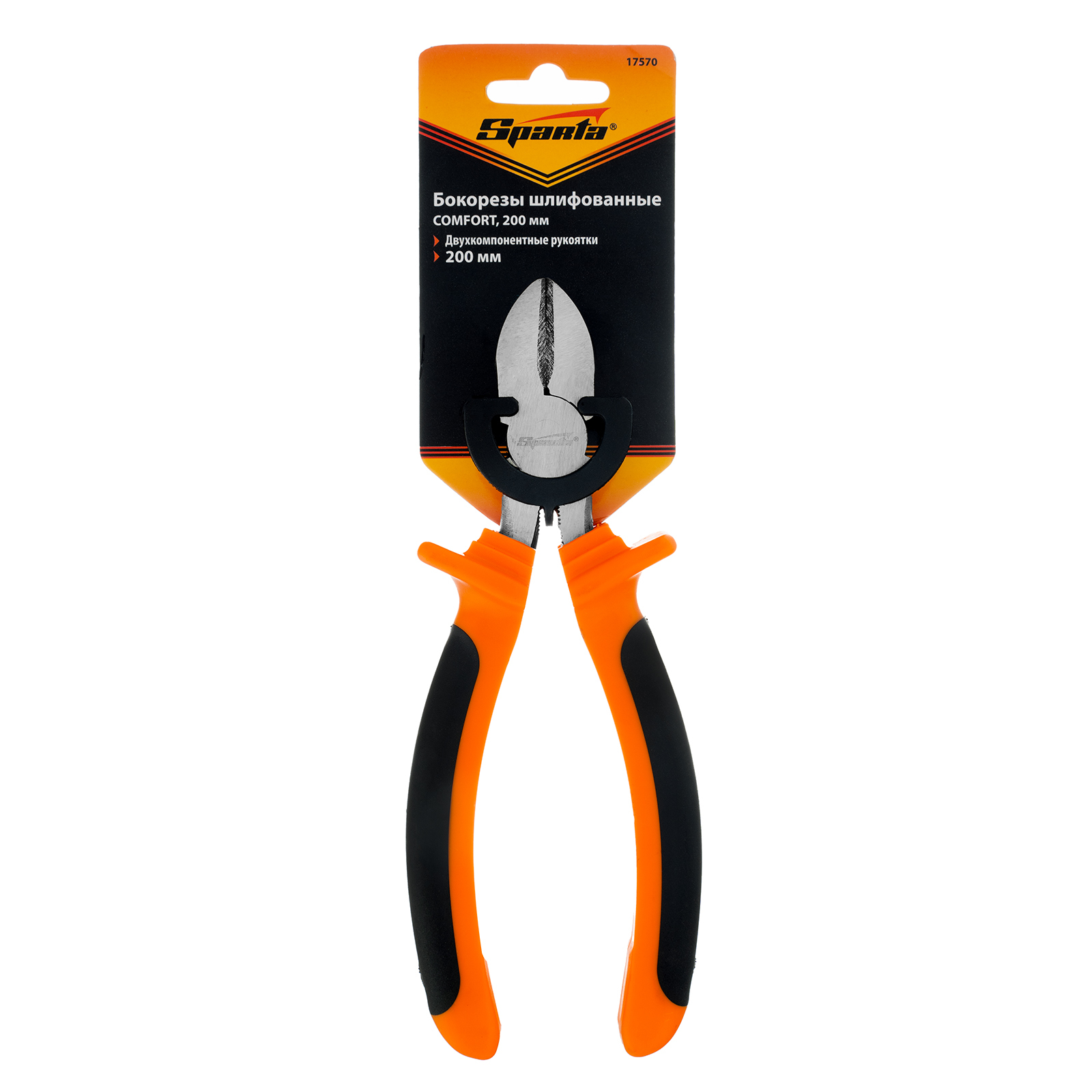 <p>Шлифованные бокорезы Sparta Comfort 17570 длиной 200 мм, с двухкомпонентными рукоятками, предназначены для проведения работ, связанных со разрезанием проводов или проволоки, — установки или демонтажа оборудования, прокладки сетей и т. д. Инструмент будет полезен не только новичку, но и профессионалу.</p><h2>Преимущества</h2><ul><li>Прочность и долговечность — бокорезы выполнены из инструментальной углеродистой стали С45.</li><li>Эффективная работа — твердость режущих кромок составляет 53 HRC, зажимных частей — 45,5 HRC.</li><li>Устойчивость к коррозии и износу — рабочие части отшлифованы и хромированы.</li><li>Безопасность пользователя — благодаря ограничительным упорам рука не соскальзывает к режущим частям.</li><li>Комфортная эксплуатация — двухкомпонентные пластмассовые рукоятки удобно лежат в руке.</li></ul>
