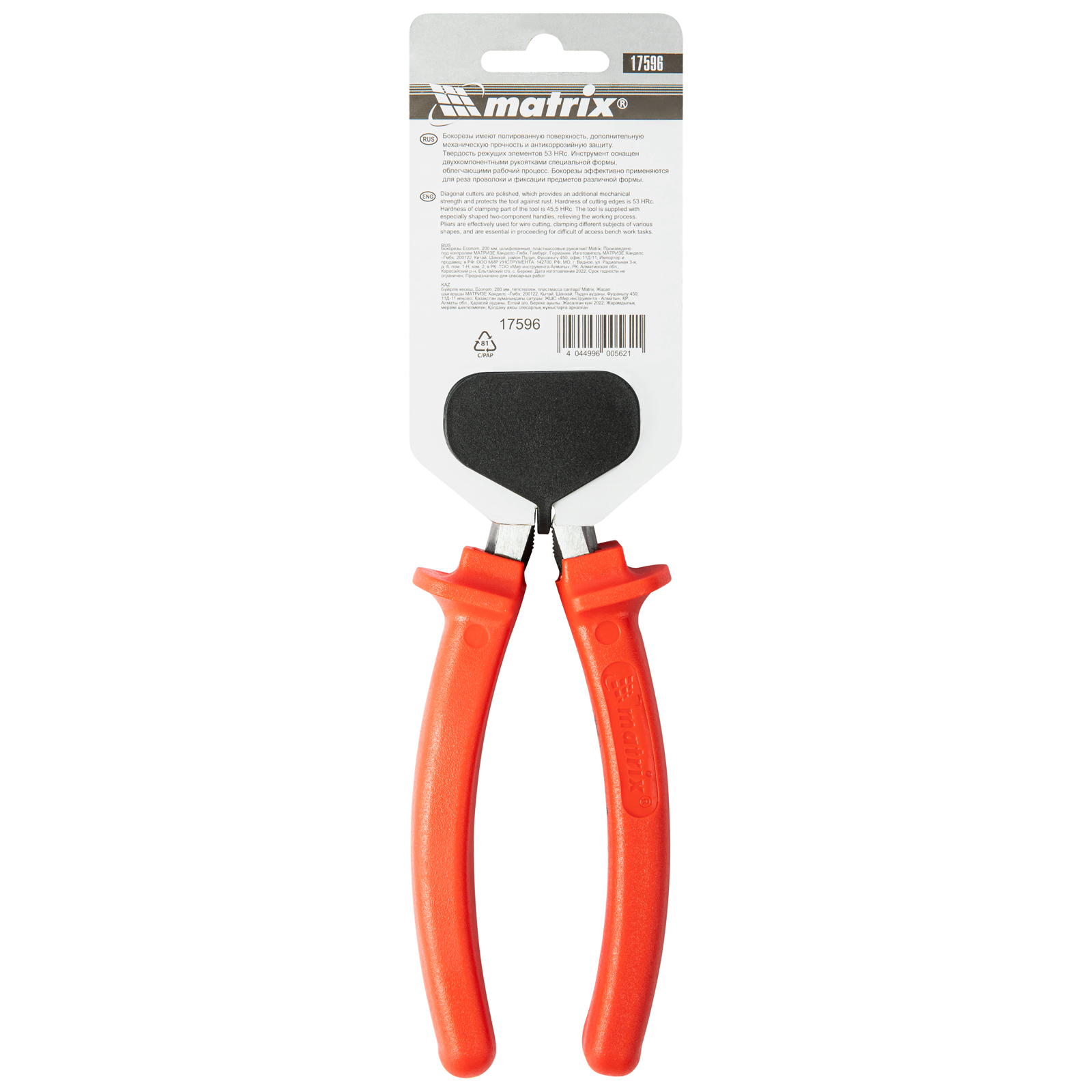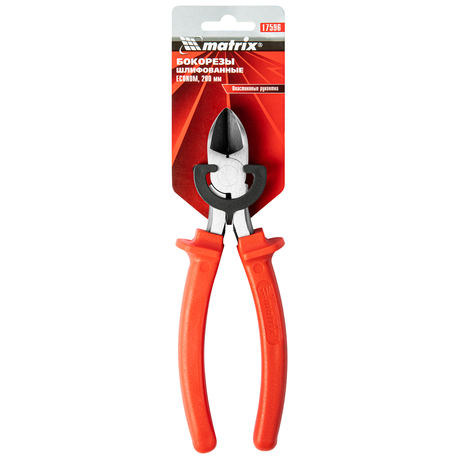 <p>Шлифованные бокорезы Matrix Econom 17596 длиной 200 мм, с пластмассовыми рукоятками, предназначены для разрезания проводов, кабелей и проволоки диаметром до 2,5 мм. Инструмент пригодится при проведении монтажных, строительных и слесарных работ. Бокорезы используются как начинающими мастерами, так и профессионалами на строительных площадках и в домашних мастерских.</p><h2>Преимущества</h2><ul><li>Прочность — бокорезы изготовлены из конструкционной углеродистой стали 45.</li><li>Надежность — рукоятки из ударопрочной пластмассы устойчивы к механическим повреждениям.</li><li>Безопасность — благодаря выступам-ограничителям на рукоятках рука не соскальзывает к рабочим частям.</li><li>Высокое качество — губки прошли шлифовку для удаления неровностей, повреждений и трещин.</li></ul>