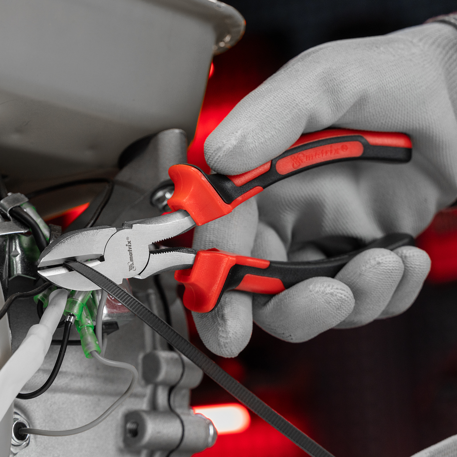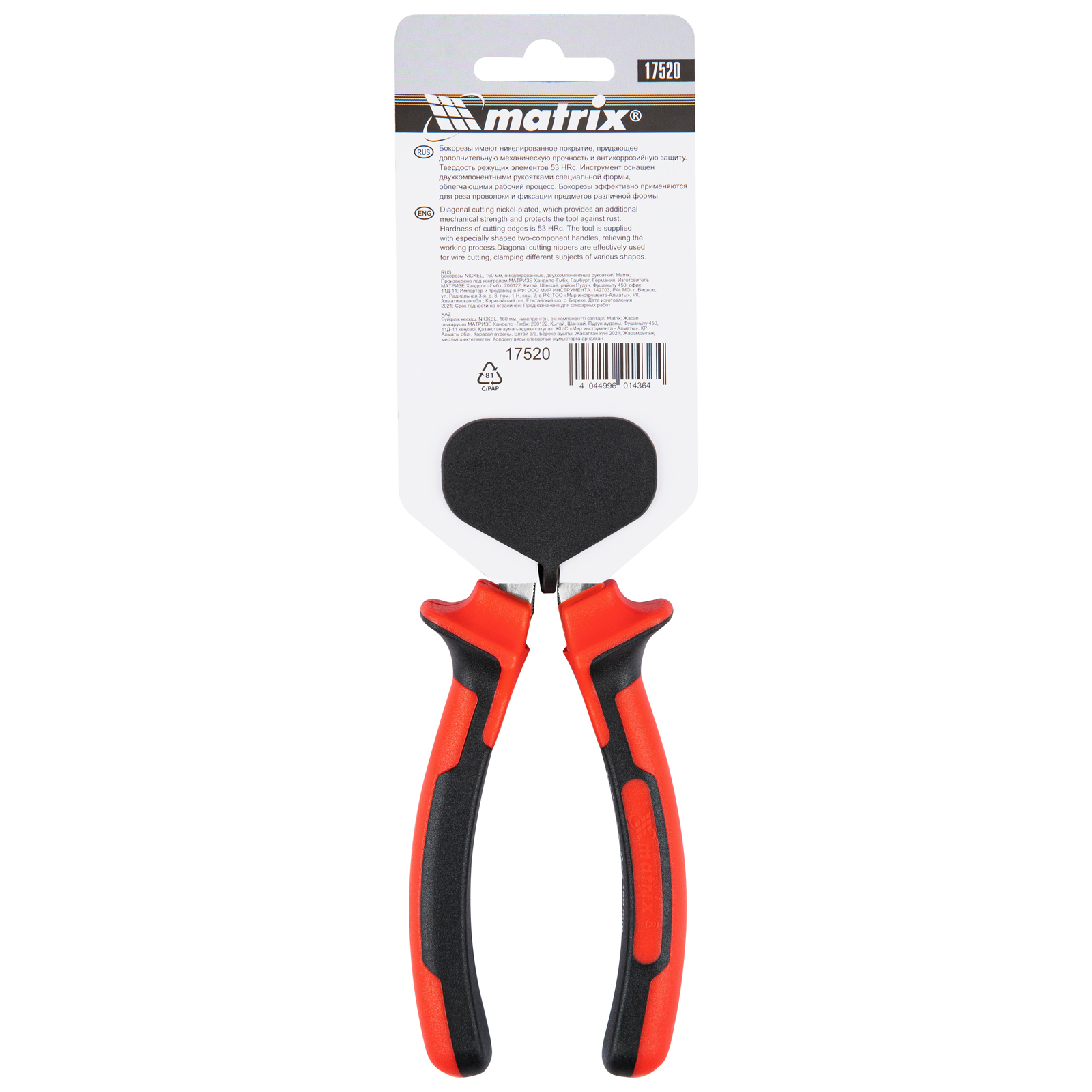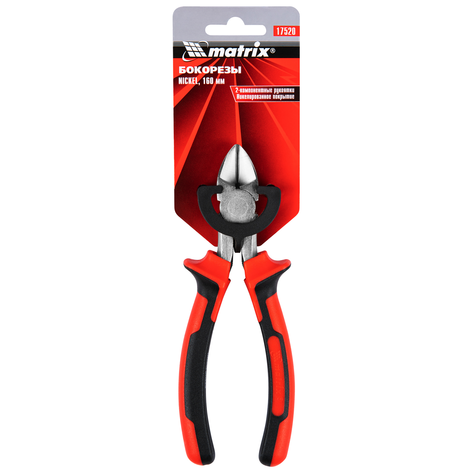 <p>Никелированные бокорезы Matrix NICKEL 17520 длиной 160 мм, с двухкомпонентными рукоятками, используются для перекусывания проводов и проволоки. Пригодятся частным мастерам и профессионалам для проведения монтажных, строительных и слесарных работ.</p><h2>Преимущества</h2><ul><li>Эффективная работа — режущие кромки прошли закалку высокочастотными токами до 53 HRC и легко справляются с твердыми материалами.</li><li>Устойчивость к износу и коррозии — на рабочие поверхности нанесено защитное никелевое покрытие.</li><li>Безопасность — на рукоятках имеются выступы, благодаря которым пальцы не соскальзывают к рабочим частям.</li><li>Комфортная эксплуатация — двухкомпонентные рукоятки обеспечивают надежный захват, даже если мастер испачкает руки в масле.</li></ul>