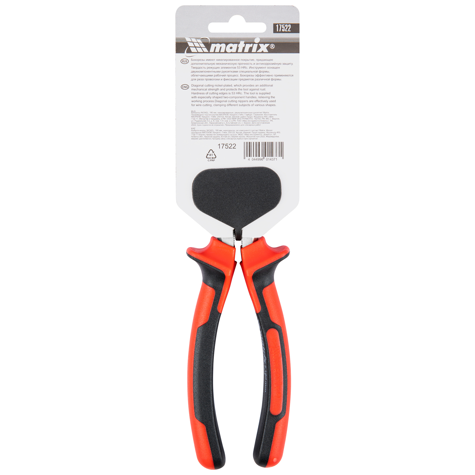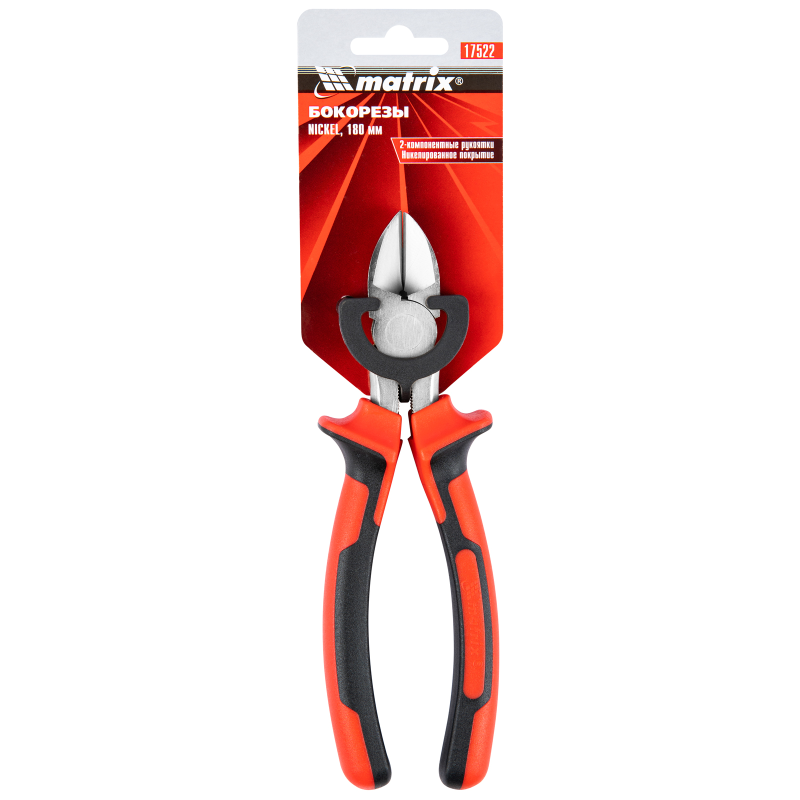 <p>Никелированные бокорезы Matrix NICKEL 17522 длиной 180 мм, с двухкомпонентными рукоятками, используются для перекусывания проводов и проволоки. Пригодятся частным мастерам и профессионалам для проведения монтажных, строительных и слесарных работ.</p><h2>Преимущества</h2><ul><li>Эффективная работа — режущие кромки прошли закалку высокочастотными токами до 53 HRC и легко справляются с твердыми материалами.</li><li>Устойчивость к износу и коррозии — на рабочие поверхности нанесено защитное никелевое покрытие.</li><li>Безопасность — на рукоятках имеются выступы, благодаря которым пальцы не соскальзывают к рабочим частям.</li><li>Комфортная эксплуатация — двухкомпонентные рукоятки обеспечивают надежный захват, даже если мастер испачкает руки в масле.</li></ul>
