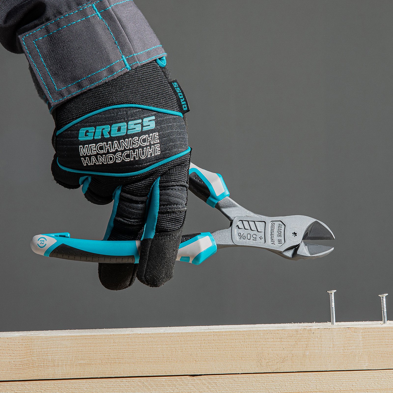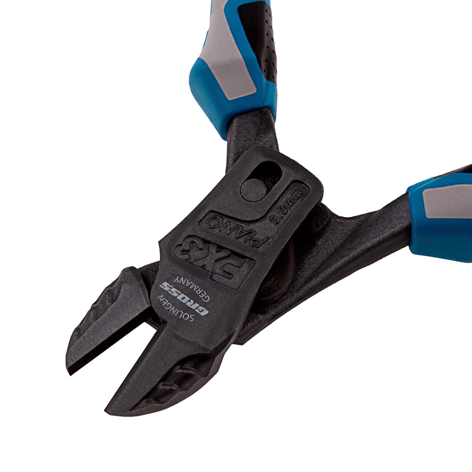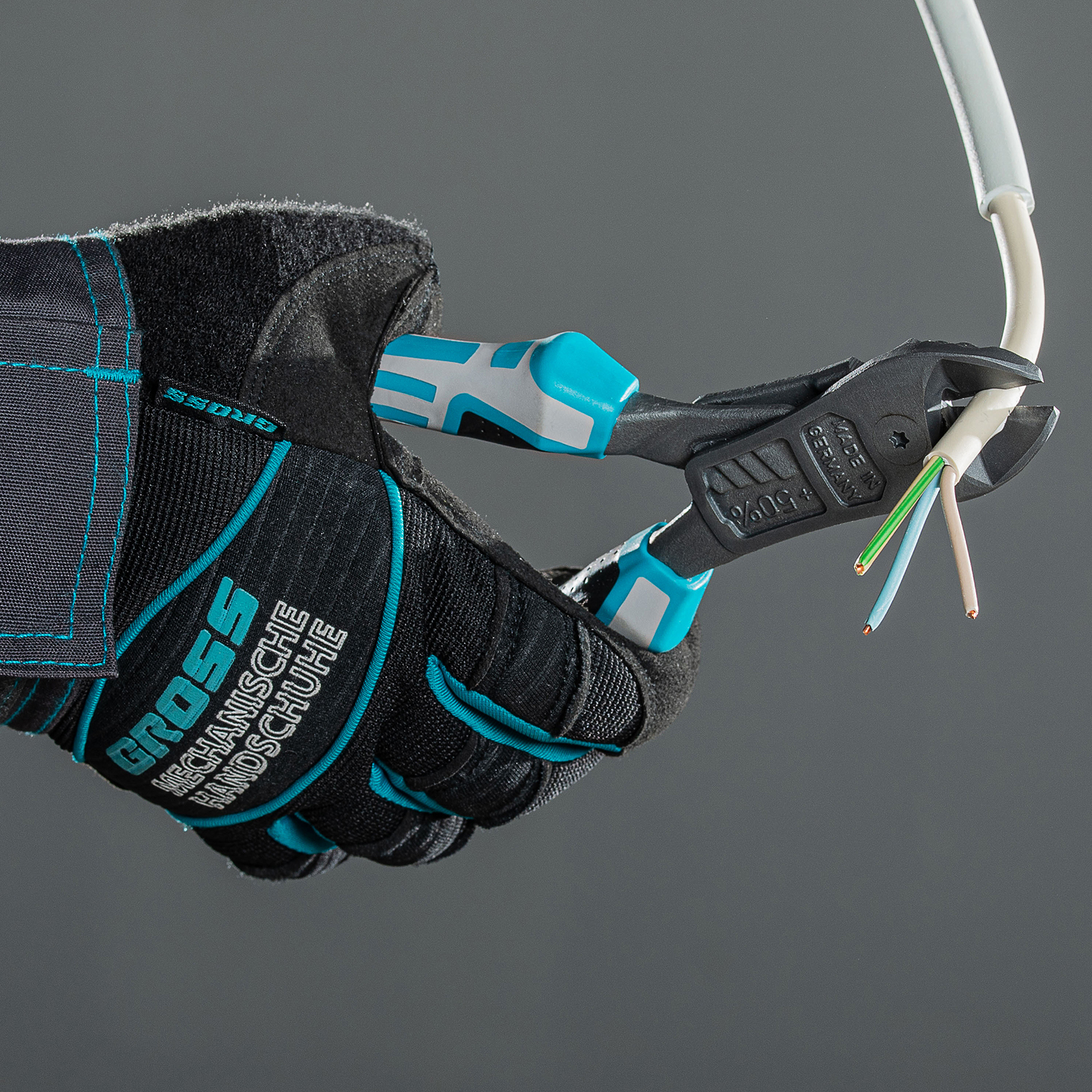 Усиленные бокорезы Gross 17575 длиной 215 мм, с трехкомпонентными рукоятками, предназначены для разрезания кабелей, проводов, проволоки, рояльных струн и т.д. Усиленная конструкция позволяет бокорезам перекусывать не только алюминий, медь, пластмассу, но и более жесткие материалы из стали диаметром до 3,5 мм. Встроенный рычажный механизм и смещенный непосредственно к режущим кромкам шарнир увеличивают усилие реза на 50%.