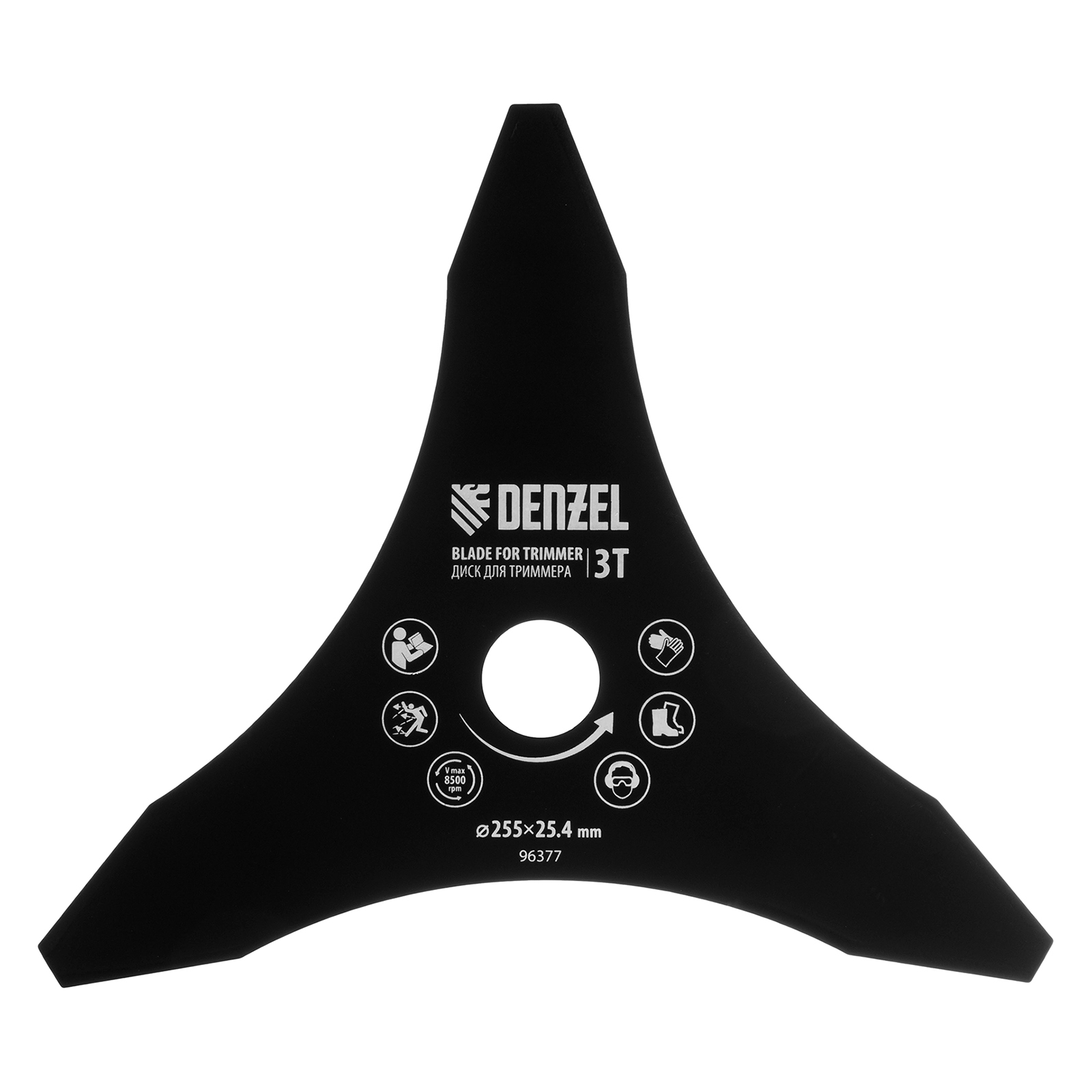 <p>Диск для триммера Denzel 96377 с 3 лезвиями, толщиной 1,6 мм, с внешним диаметром 250 мм и посадочным — 25,4 мм, используется для скашивания травы и мелкого кустарника. Устанавливается на бензокосу или электротриммер с верхним расположением двигателя и прямой штангой. Позволяет быстро очистить от сорняков и крупностеблевой растительности территорию большой площади. Диск пригодится владельцам загородных участков.</p><h2>Преимущества</h2><ul><li>Прочность — диск из углеродистой стали выдерживает высокие динамические нагрузки и интенсивное использование.</li><li>Эффективность — 3 лезвия успешно справляются не только с травой, но и с мелкой порослью кустарников, например, малины.</li><li>Высокая производительность — остро заточенные кромки быстро срезают траву, сокращая время работы.</li></ul>