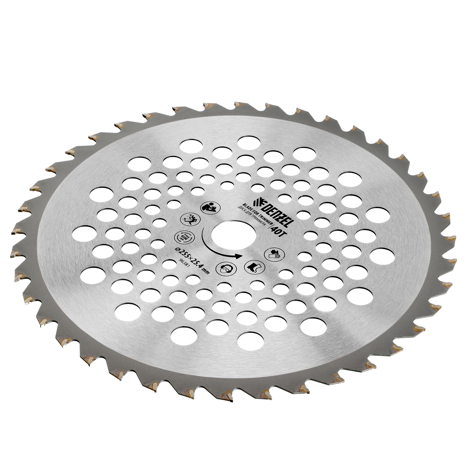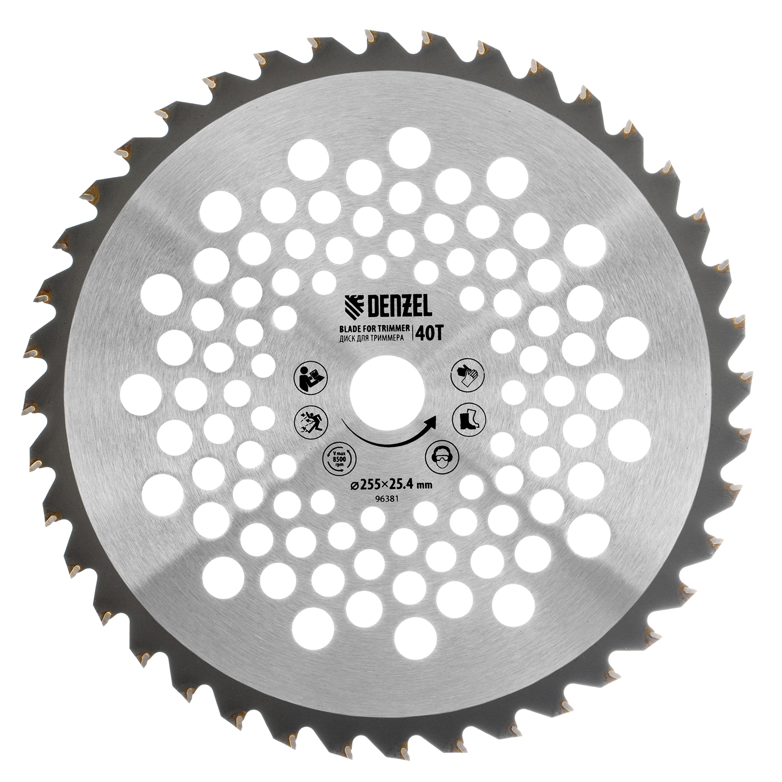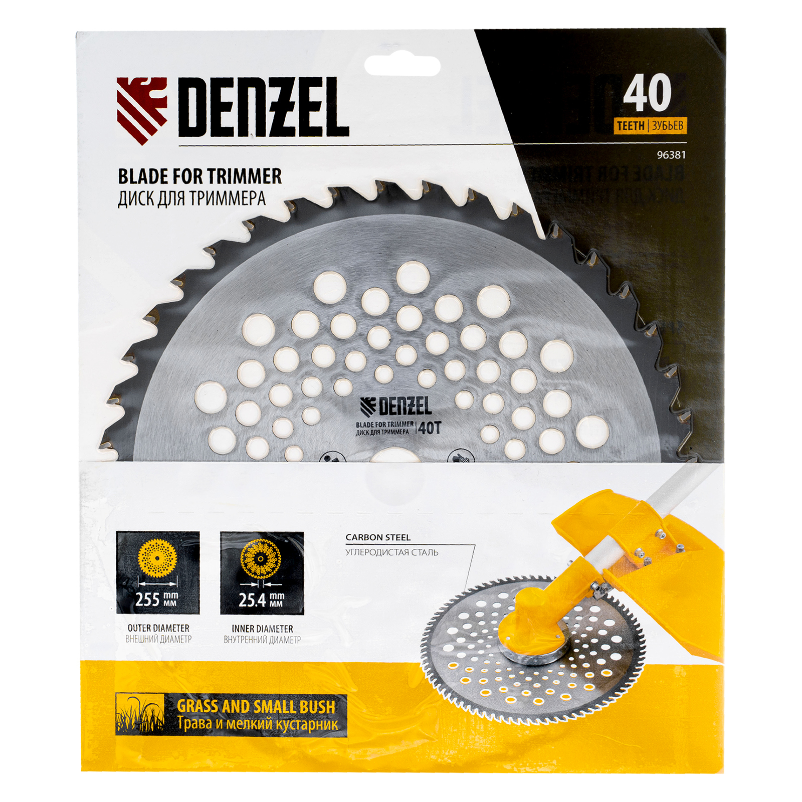 <p>Диск для триммера Denzel 96381 размером 255 х 25,4 мм, с 40 зубьями, предназначен для скашивания травы и мелкого кустарника. Устанавливается на вал бензинового триммера или электрических моделей с верхним расположением двигателя и прямой штангой. Будет полезен для ухода за дачным участком.</p><h2>Преимущества</h2><ul><li>Долговечность — выполнен из прочной углеродистой стали, устойчив к нагрузкам и рассчитан на длительное использование.</li><li>Универсальность — подходит как для аккуратного подравнивания газонной травы, так и для подпиливания мелких деревьев и кустарников.</li><li>Эффективность — режущие зубья с твердосплавными напайками из карбида вольфрама делают диск универсальным для скашивания всех видов растительности.</li></ul>