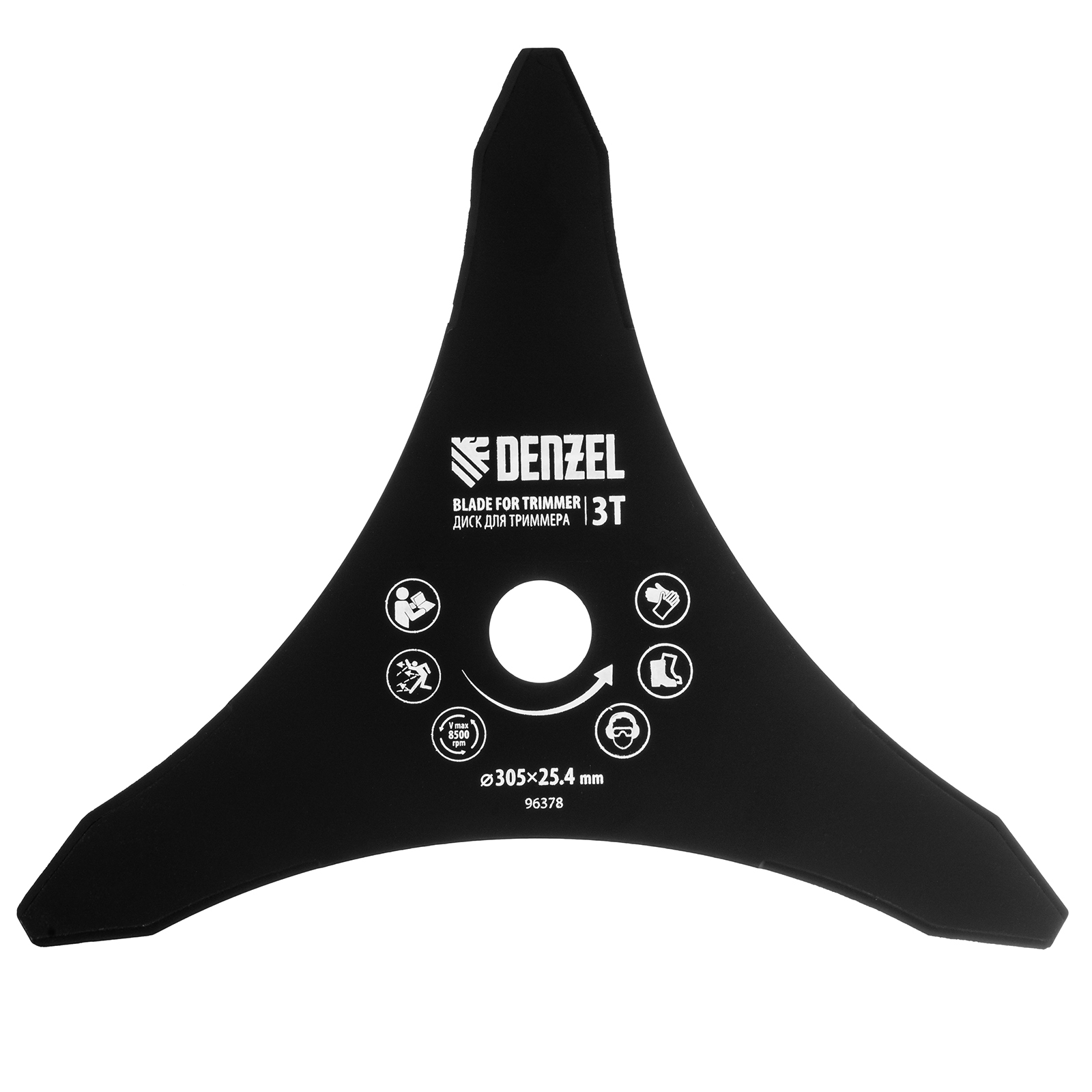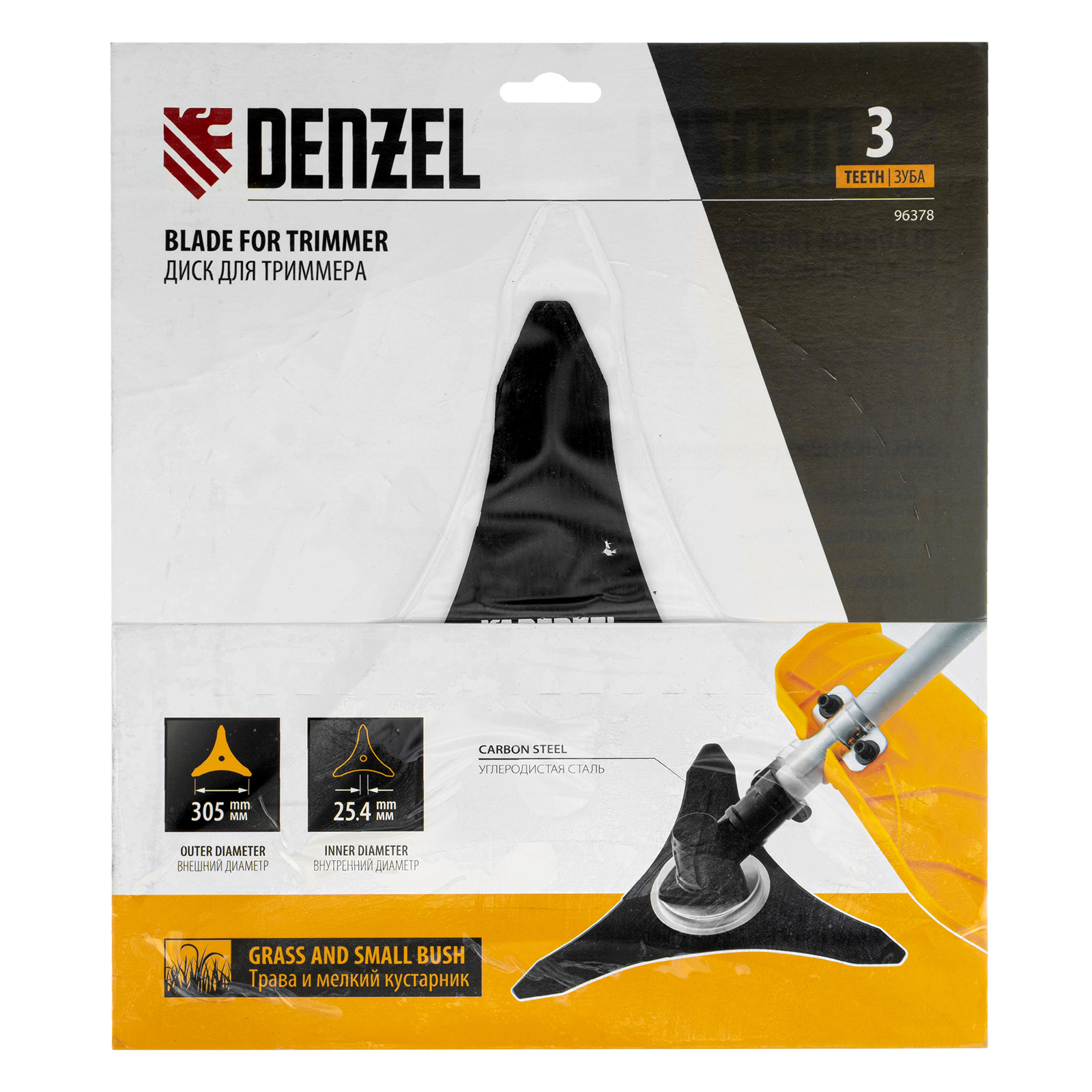 <p>Диск для триммера Denzel 96378 с 3 лезвиями, толщиной 1,6 мм, с внешним диаметром 305 мм и посадочным — 25,4 мм, используется для скашивания травы и мелкого кустарника. Устанавливается на бензокосу или электротриммер с верхним расположением двигателя и прямой штангой. Позволяет быстро очистить от сорняков и крупностеблевой растительности территорию большой площади. Диск пригодится владельцам загородных участков.</p><h2>Преимущества</h2><ul><li>Прочность — диск из углеродистой стали выдерживает высокие динамические нагрузки и интенсивное использование.</li><li>Эффективность — 3 лезвия успешно справляются не только с травой, но и с мелкой порослью кустарников, например, малины.</li><li>Высокая производительность — остро заточенные кромки быстро срезают траву, сокращая время работы.</li></ul>