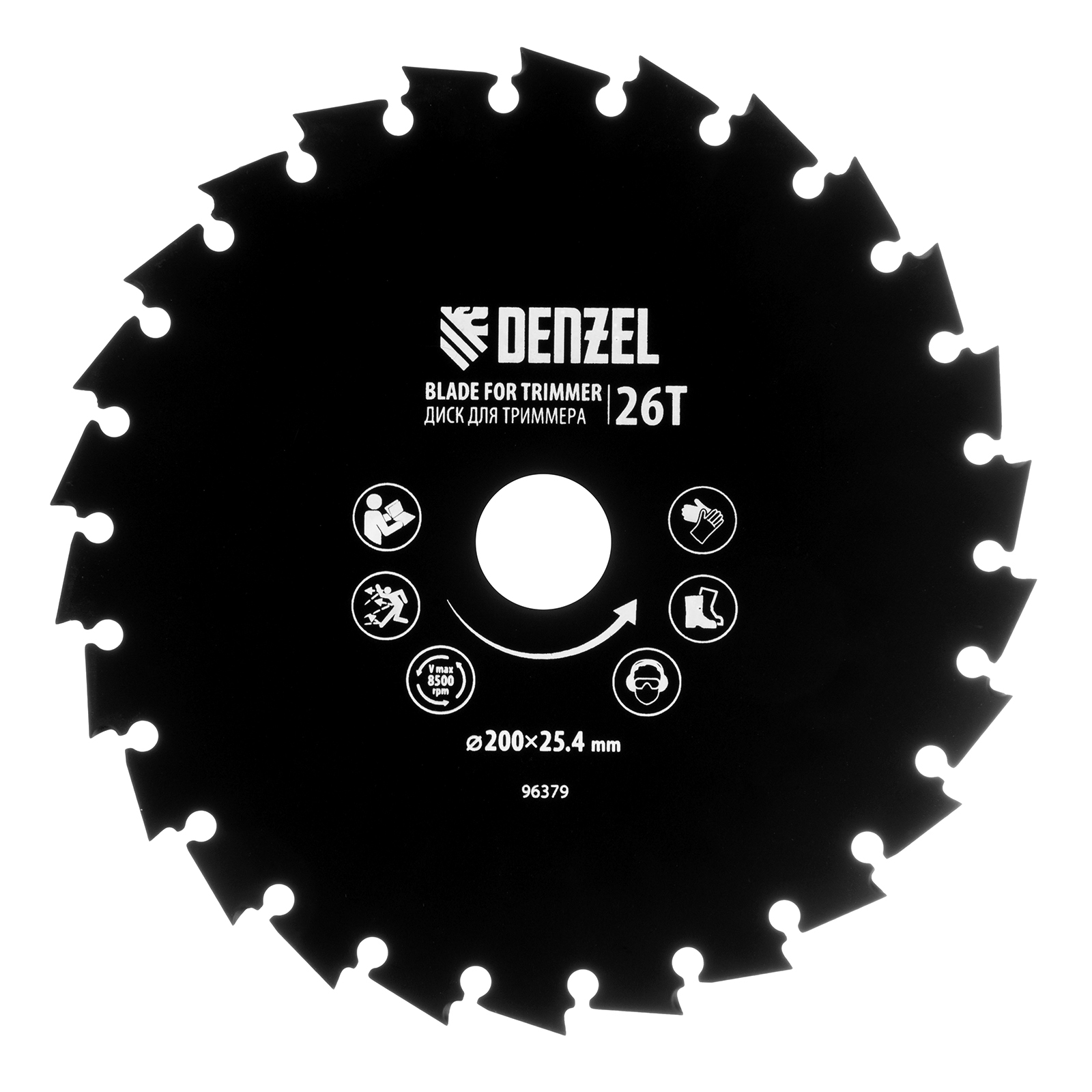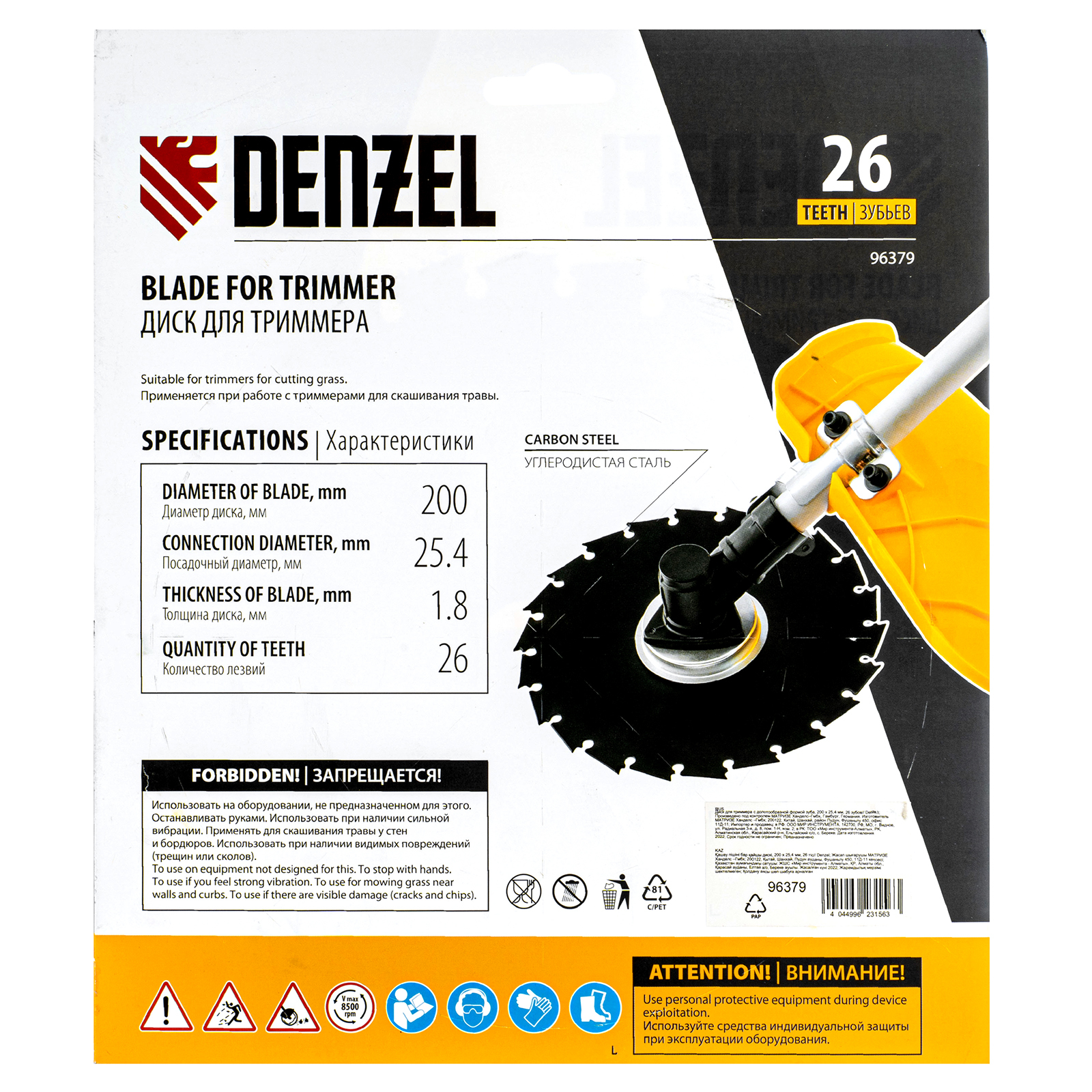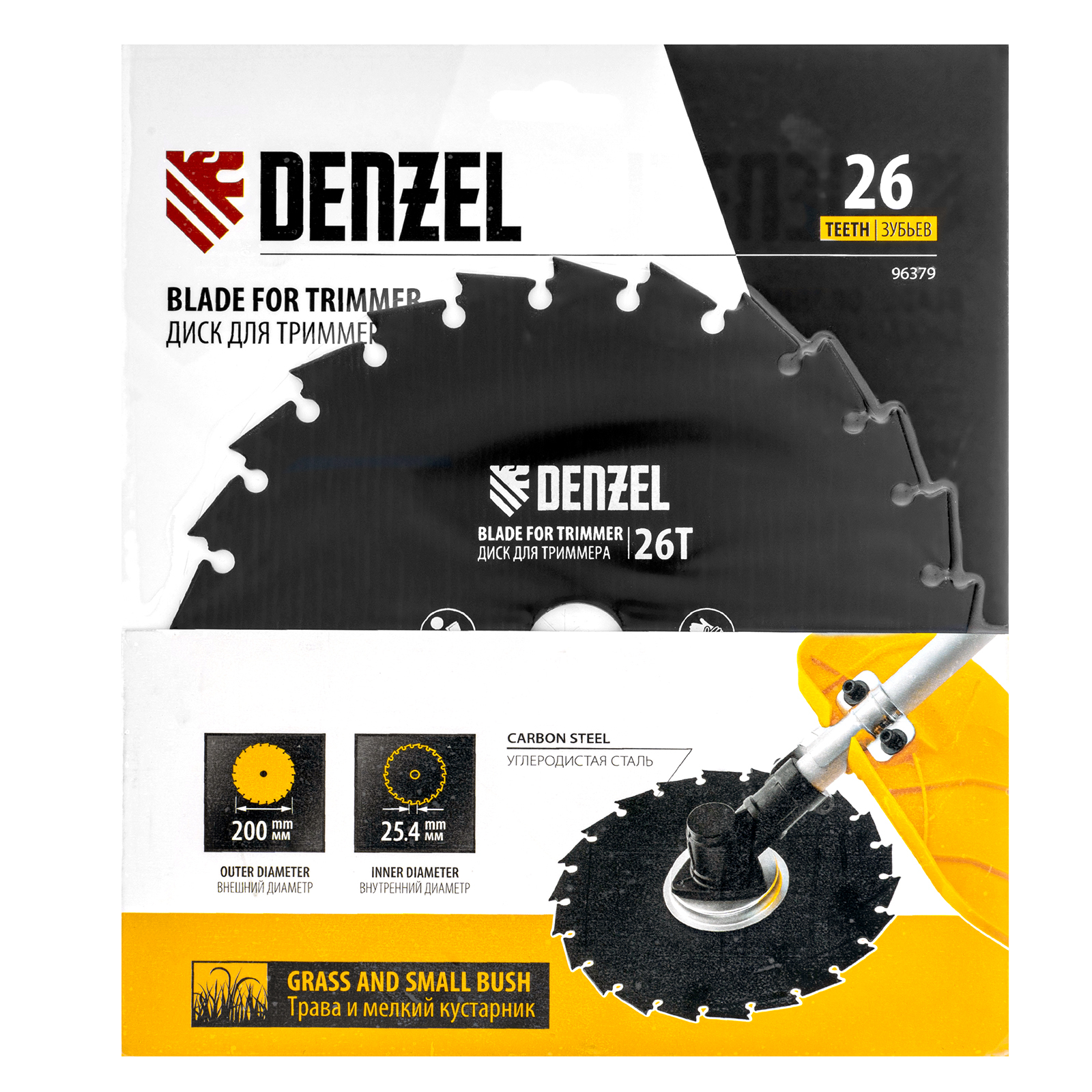 <p>Диск для триммера Denzel 96379 с внешним диаметром 200 мм и посадочным — 25,4 мм, с 26 зубьями долотообразной формы, предназначен для скашивания травы и мелкого кустарника. Устанавливается на вал триммера с бензиновым двигателем. Диск пригодится для ухода за дачным участком.</p><h2>Преимущества</h2><ul><li>Устойчивость к высоким динамическим нагрузкам — диск выполнен из прочной углеродистой стали толщиной 1,8 мм.</li><li>Агрессивная форма зубьев — благодаря уникальной форме режущей кромки зуба диск особенно эффективен при срезании побегов кустарника и молодых деревьев.</li><li>Эффективная расчистка территории — острые зубья быстро срезают растительность.</li></ul>
