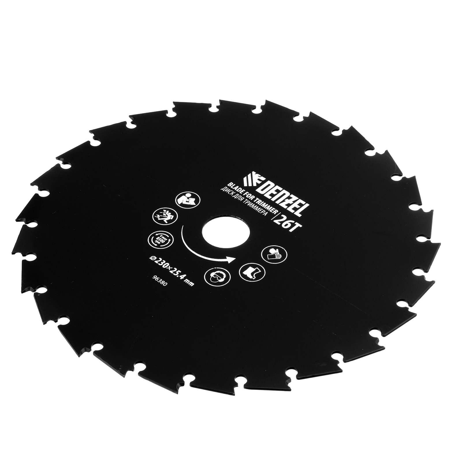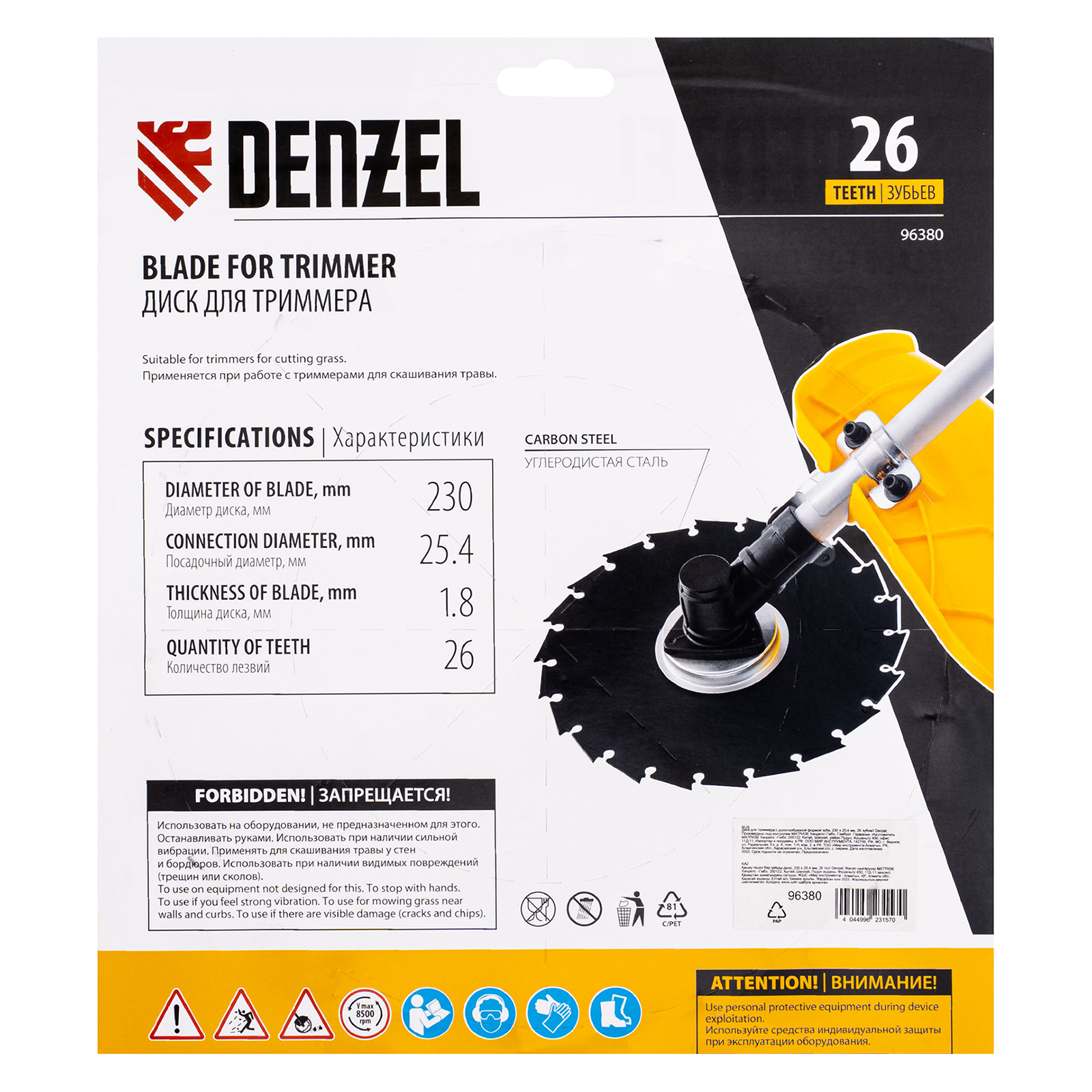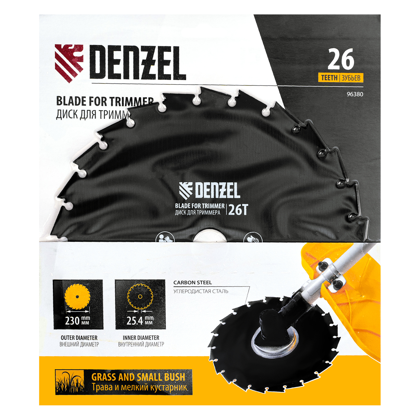 <p>Диск для триммера Denzel 96380 с внешним диаметром 230 мм и посадочным — 25,4 мм, с 26 зубьями долотообразной формы, предназначен для скашивания травы и мелкого кустарника. Устанавливается на вал триммера с бензиновым двигателем. Диск пригодится для ухода за дачным участком.</p><h2>Преимущества</h2><ul><li>Устойчивость к высоким динамическим нагрузкам — диск выполнен из прочной углеродистой стали толщиной 1,8 мм.</li><li>Агрессивная форма зубьев — благодаря уникальной форме режущей кромки зуба диск особенно эффективен при срезании побегов кустарника и молодых деревьев.</li><li>Эффективная расчистка территории — острые зубья быстро срезают растительность.</li></ul>