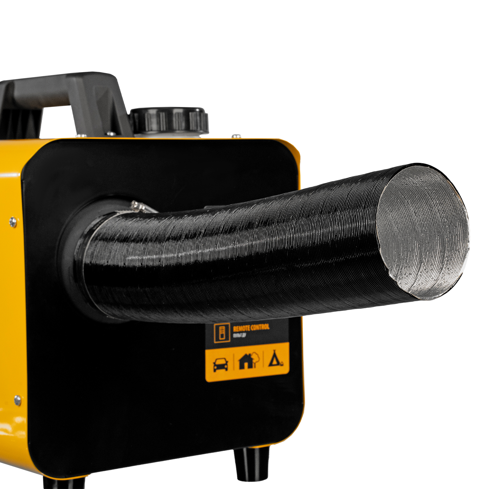 - Дистанционное управление — регулировать температуру нагрева, а также включать и выключать пушку можно на расстоянии при помощи пульта (входит в комплект поставки).