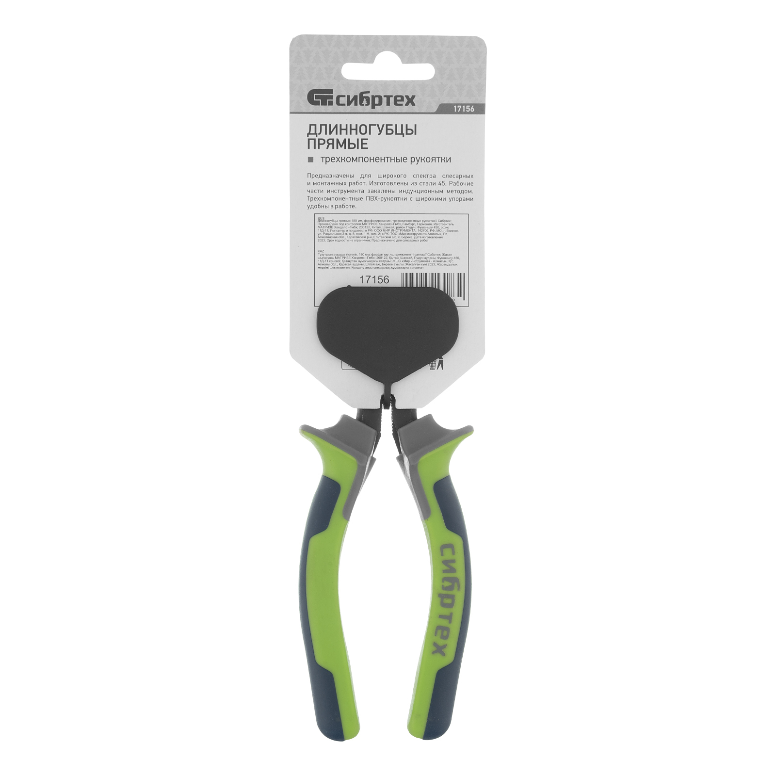 <p>Прямые длинногубцы Сибртех 17156 длиной 180 мм, с фосфатированными губками и трехкомпонентными рукоятками, позволяют удерживать мелкие детали, крепеж, проводки, а также перекусывать проволоку при помощи режущих кромок. Инструмент облегчает работу в труднодоступных местах. Длинногубцы будут полезны слесарю, электрику, сборщику мебели, мастеру по ремонту техники, радиолюбителю, а также подойдут для использования в быту.</p><h2>Преимущества</h2><ul><li>Прочность и износостойкость — инструмент изготовлен из стали 45, прошедшей закалку в масле.</li><li>Безопасная эксплуатация — упоры на рукоятках не допускают соскальзывания пальцев на рабочую часть.</li><li>Комфортная работа — трехкомпонентные рукоятки не выскальзывают из ладони.</li></ul>