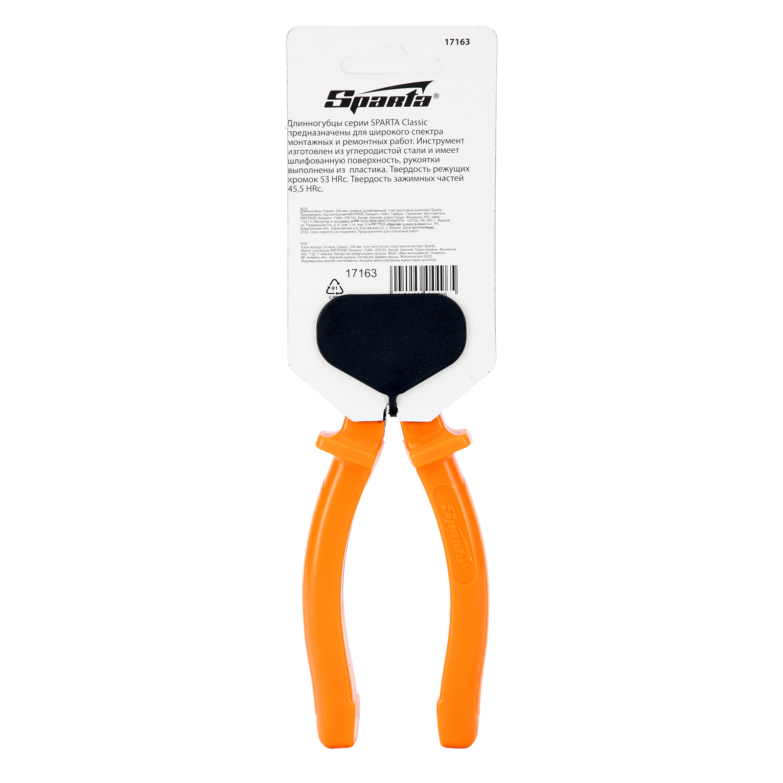 <p>Прямые шлифованные длинногубцы Sparta Classic 17163 длиной 200 мм, с пластмассовыми рукоятками, облегчают манипуляции с крепежом, мелкими деталями, проводами и проволокой. Удлиненные губки обеспечивают доступ в узкие места. Инструмент будет полезен во время строительства или ремонта, пригодится для монтажа и демонтажа оборудования, а также при починке бытовой техники и электроники.</p><h2>Преимущества</h2><ul><li>Износостойкость — длинногубцы изготовлены из инструментальной углеродистой стали C45.</li><li>Эффективное выполнение поставленных задач — губки имеют твердость около 45,5 HRC, режущими кромками твердостью 53 HRC можно перекусывать проволоку.</li><li>Эргономичность — пластмассовые рукоятки с широкими упорами удобно лежат в ладони.</li></ul>