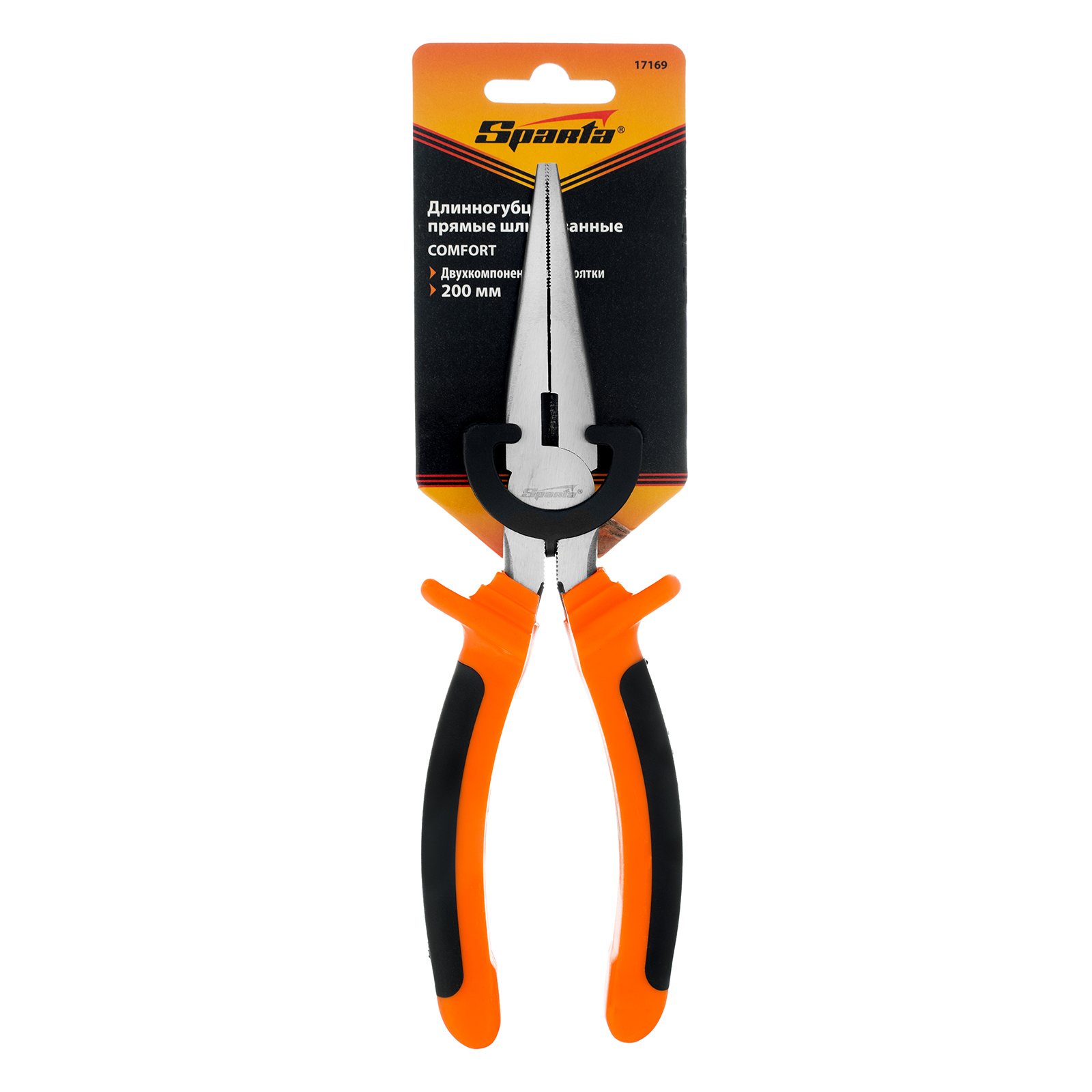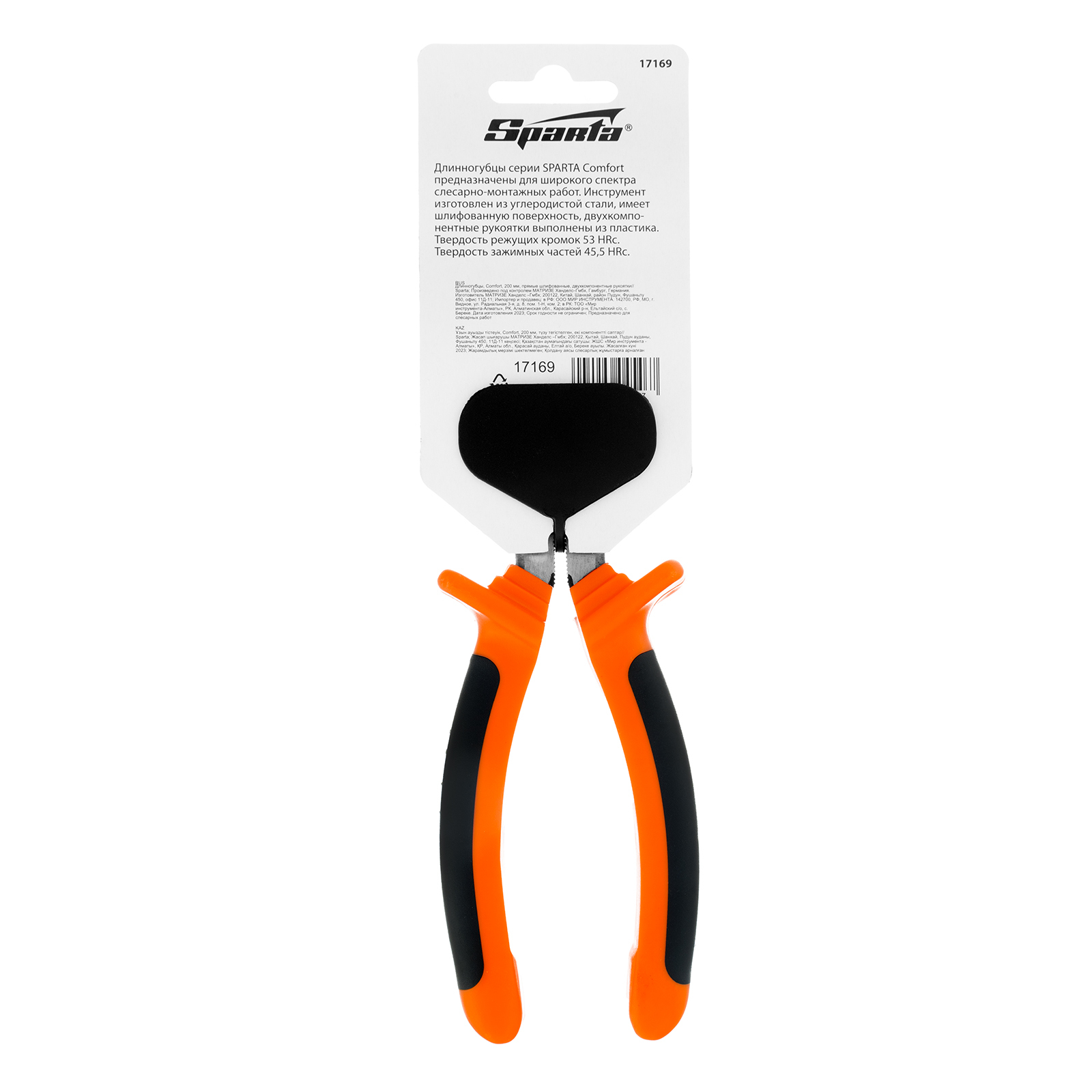 <p>Прямые шлифованные длинногубцы Sparta Comfort 17169 длиной 200 мм, с двухкомпонентными рукоятками, предназначены для выполнения слесарно-монтажных работ. Ими удобно удерживать крепеж и мелкие детали, зажимать провода, перекусывать проволоку. Инструмент используется в бытовой и профессиональной сфере.</p><h2>Преимущества</h2><ul><li>Прочность и долговечность — рабочие части изготовлены из инструментальной стали C45 и отшлифованы.</li><li>Устойчивость к нагрузкам — твердость режущих кромок составляет 53 HRC, а зажимных частей — 45,5 HRC.</li><li>Удобная и безопасная эксплуатация — двухкомпонентные пластиковые рукоятки снабжены широкими упорами.</li></ul>