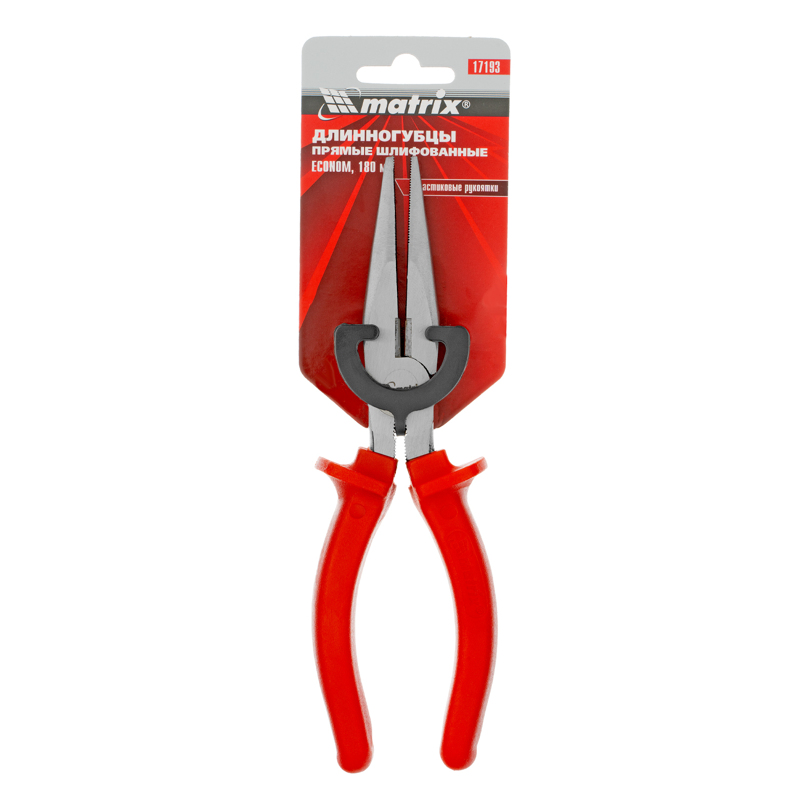 <p>Прямые шлифованные длинногубцы Matrix Econom 17193 длиной 180 мм, с пластмассовыми рукоятками, предназначены для захвата и надежного удержания гвоздей и других мелких деталей, перекусывания проводов, прутков, проволоки и решения широкого спектра ремонтных и монтажных задач. Будут полезны как начинающим мастерам, так и профессионалам.</p><h2>Преимущества</h2><ul><li>Прочность и износостойкость — губки изготовлены из углеродистой стали и отшлифованы, а пластмассовые рукоятки устойчивы к механическим повреждениям.</li><li>Безопасная эксплуатация — упоры на рукоятках предотвращают контакт пальцев с рабочей частью, защищая мастера от травмирования.</li><li>Комфортная работа — губки с мелкими зубцами крепко захватывают и надежно удерживают детали.</li></ul>