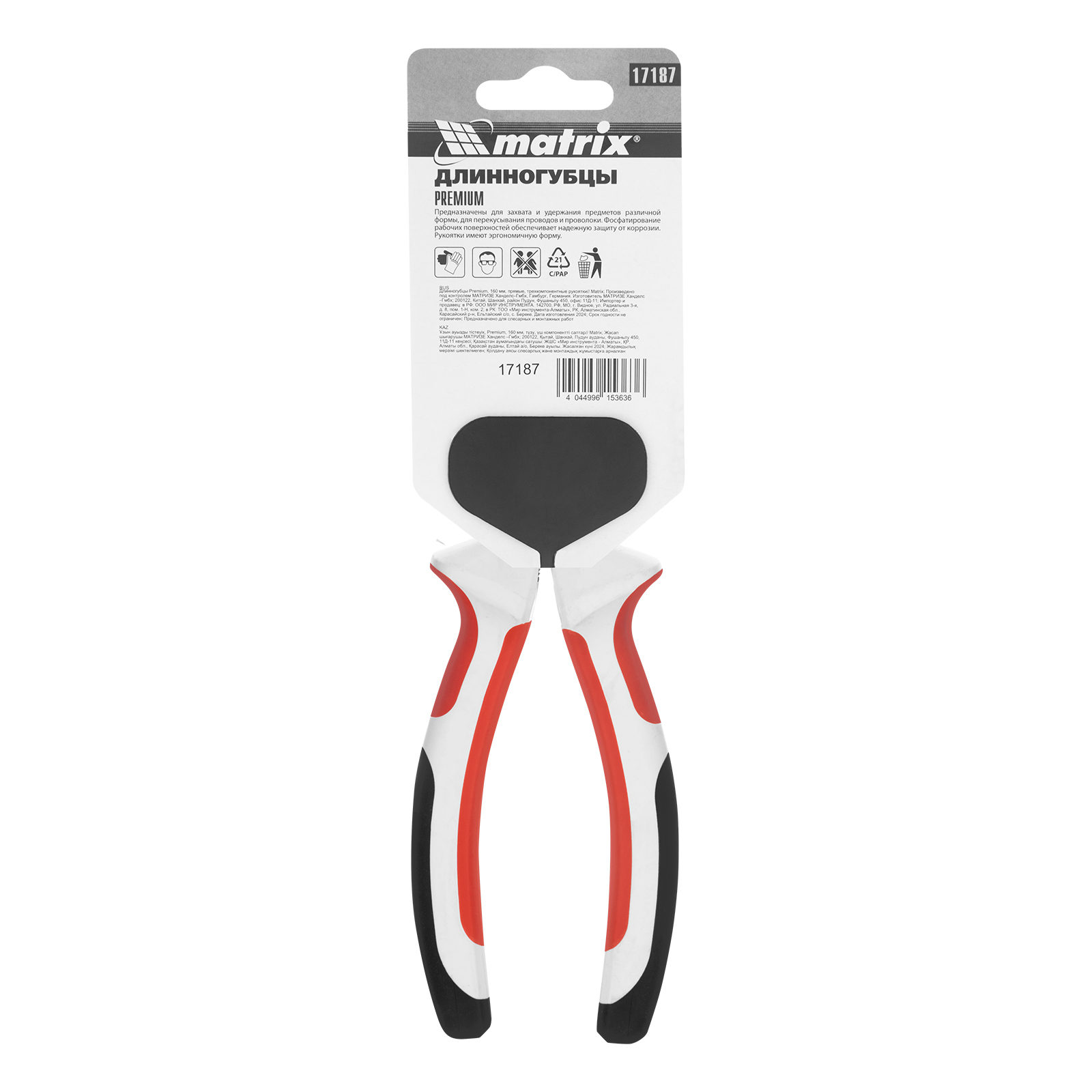 <p>Прямые длинногубцы Matrix Premium 17187 длиной 200 мм, с трехкомпонентными рукоятками, позволяют захватывать и удерживать мелкие детали разной формы, загибать и перекусывать проволоку, прутки, провода. Облегчают работу в труднодоступных местах. Длинногубцы пригодятся слесарям, монтажникам и строителям.</p><h2>Преимущества</h2><ul><li>Высокий ресурс — рабочие части прошли индукционную закалку до твердости 49-52 HRC.</li><li>Долговечность — металлическая фосфатированная поверхность частично отшлифована, поэтому инструмент устойчив к коррозии и износу.</li><li>Безопасность — широкие упоры на рукоятках предотвращают соскальзывание пальцев к рабочим частям и снижают риск травмирования.</li><li>Комфортная работа — эргономичные трехкомпонентные рукоятки обеспечивают надежный хват и снижают нагрузку на руку мастера.</li></ul>