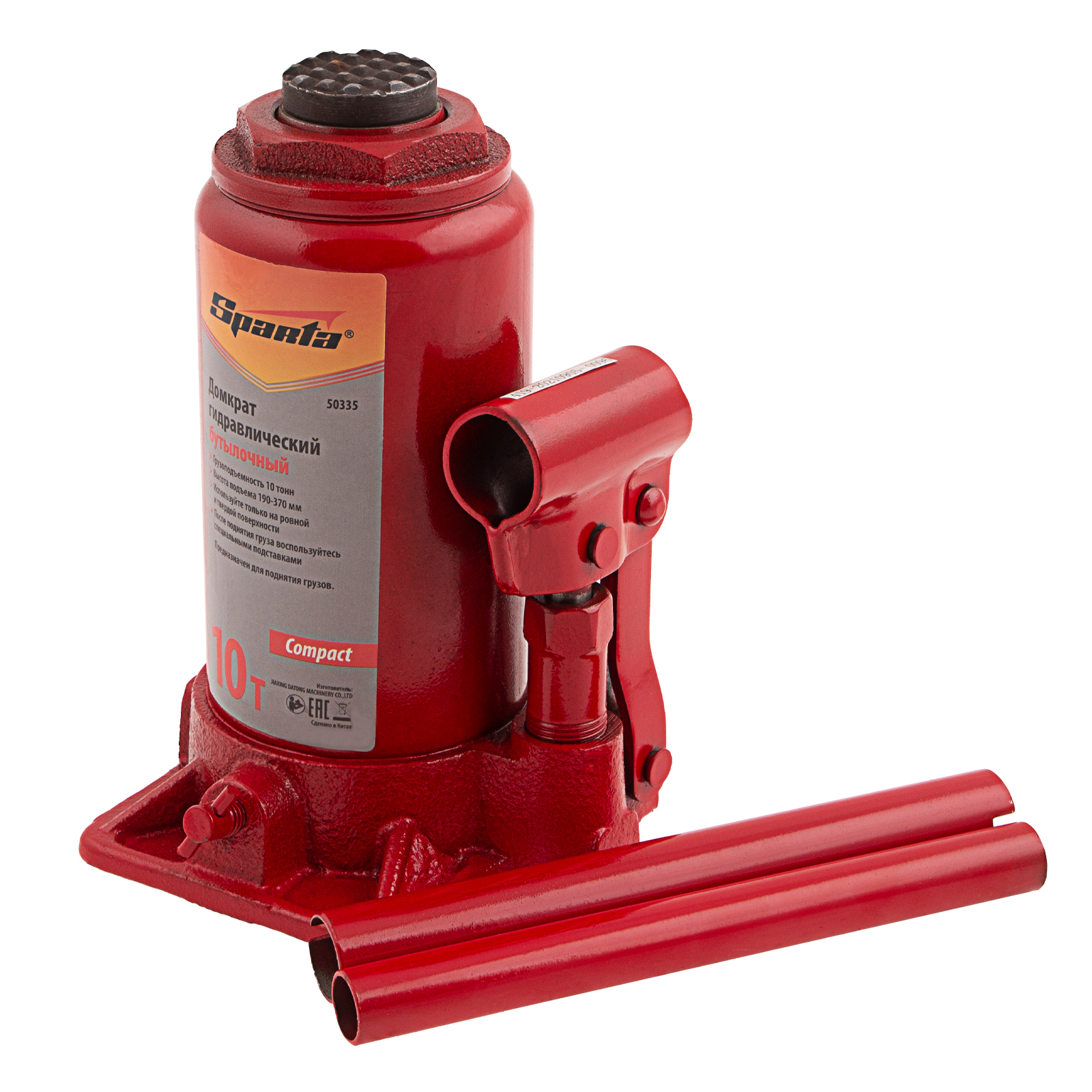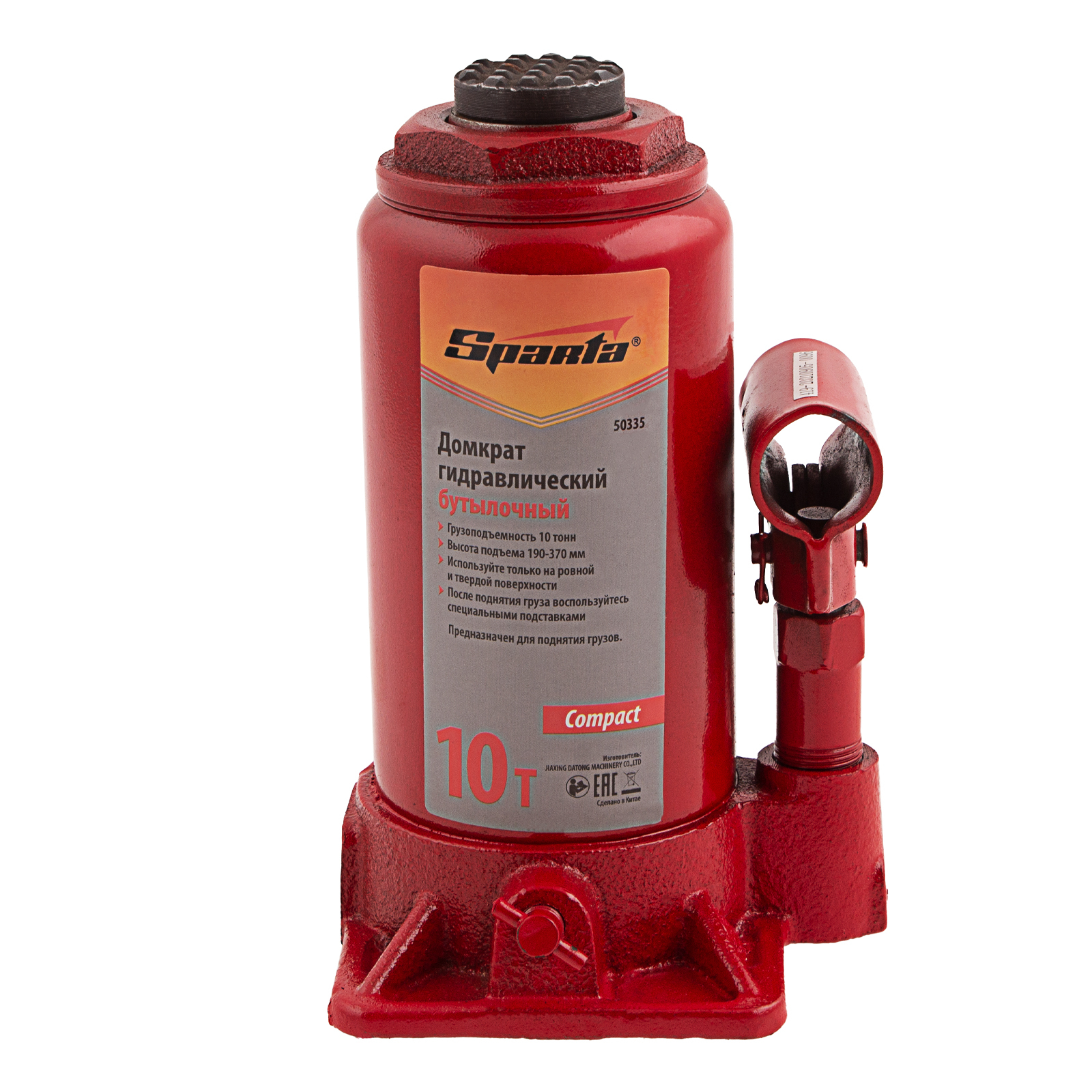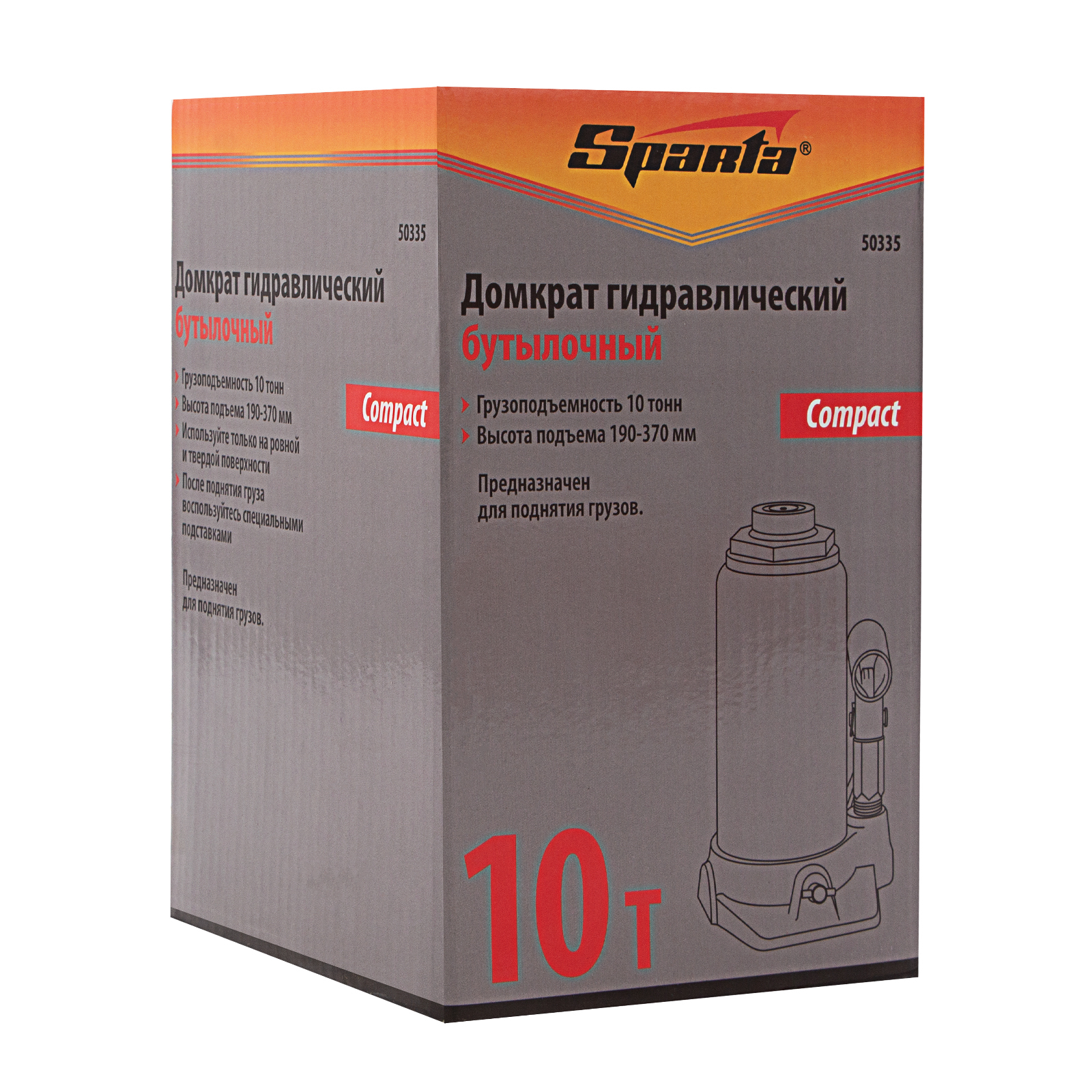 <p>Гидравлический бутылочный домкрат Sparta Compact 50335 предназначен для подъема грузов весом до 10 т на высоту 190-370 мм. Существенно облегчает рабочий процесс, т.к. не требует больших усилий от пользователя. Домкрат будет полезен в автосервисе и гараже для проведения технического обслуживания авто.</p><h2>Преимущества</h2><ul><li>Надежная конструкция — корпус домкрата выполнен из стали, а основание — из чугуна.</li><li>Ремонтопригодность — благодаря резьбовому соединению корпус легко снимается со станины.</li><li>Удобное хранение и транспортировка — домкрат весит 4,68 кг и не занимает много места благодаря съемному рычагу.</li></ul>
