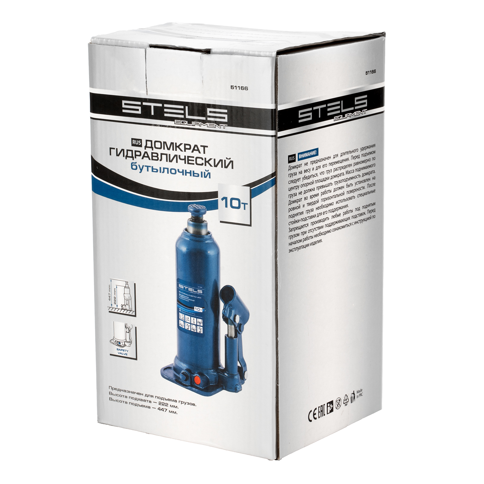 <p>Гидравлический бутылочный домкрат Stels 51166 применяется для быстрого поднятия грузов весом до 10 т на высоту 222-447 мм. Оптимален для автомобилей с большим клиренсом. Домкрат будет полезен автолюбителям и профессионалам для ремонта транспортного средства.</p><h2>Преимущества</h2><ul><li>Безопасная эксплуатация — благодаря предохранительному клапану домкрат не поднимает грузы тяжелее 10 т.</li><li>Прочность и долговечность — корпус выполнен из коррозионностойкой стали.</li><li>Надежная конструкция — домкрат не имеет резьбовых соединений, т.к. корпус приварен к станине.</li></ul>