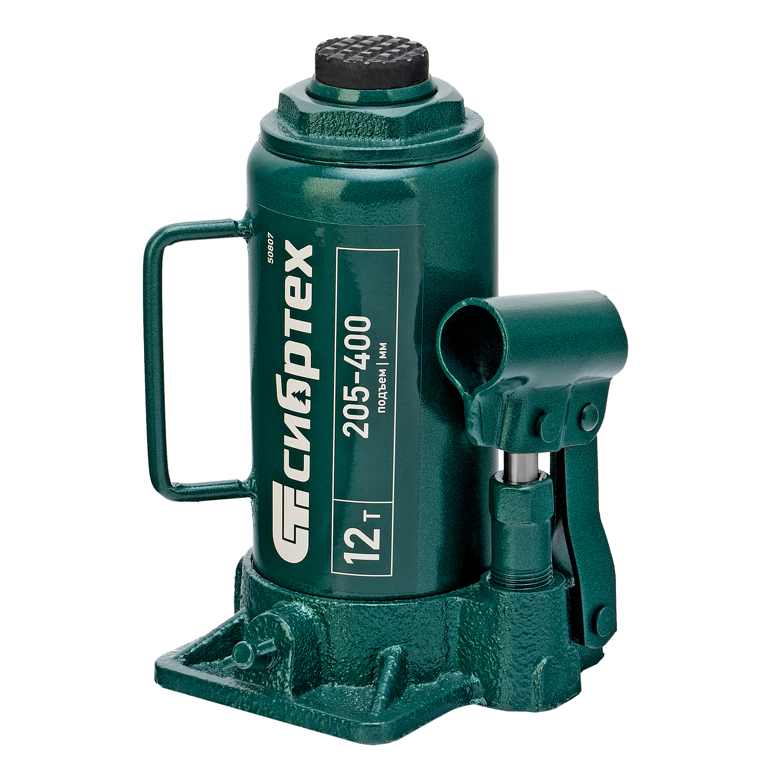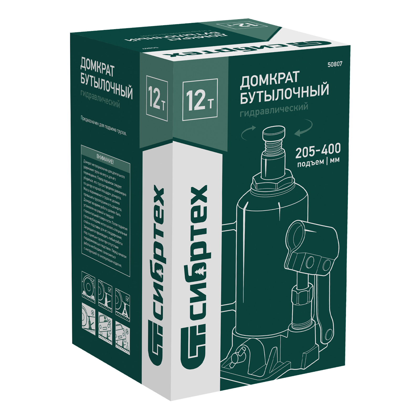 <p>Домкрат гидравлический бутылочный Сибртех 50807 предназначен для подъема грузов массой до 12 т на высоту от 205 до 400 мм. Не требует больших усилий от пользователя и значительно облегчает рабочий процесс. Домкрат будет полезен при проведении техобслуживания машины в автосервисе или гараже.</p><h2>Преимущества</h2><ul><li>Прочность и долговечность — корпус выполнен из стали, основание — из чугуна.</li><li>Разборная конструкция — корпус крепится к станине при помощи резьбового соединения, поэтому при необходимости домкрат можно отремонтировать.</li><li>Точная регулировка высоты подхвата — в конструкции предусмотрен выдвижной винт.</li><li>Удобное хранение и транспортировка — домкрат весит всего 4,9 кг, а благодаря съемному рычагу не занимает много места.</li></ul>