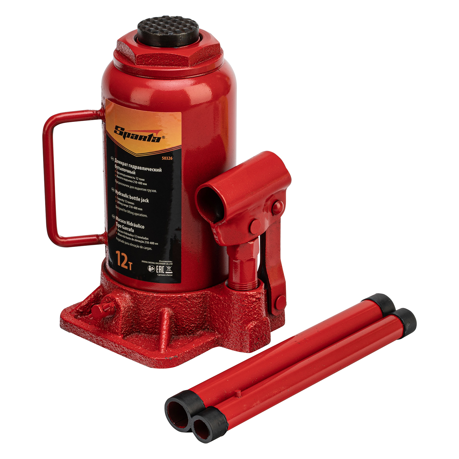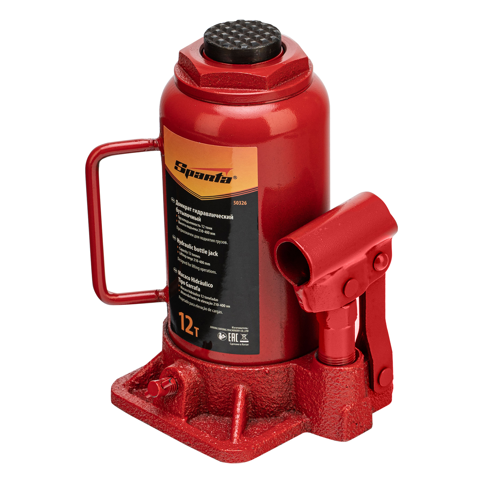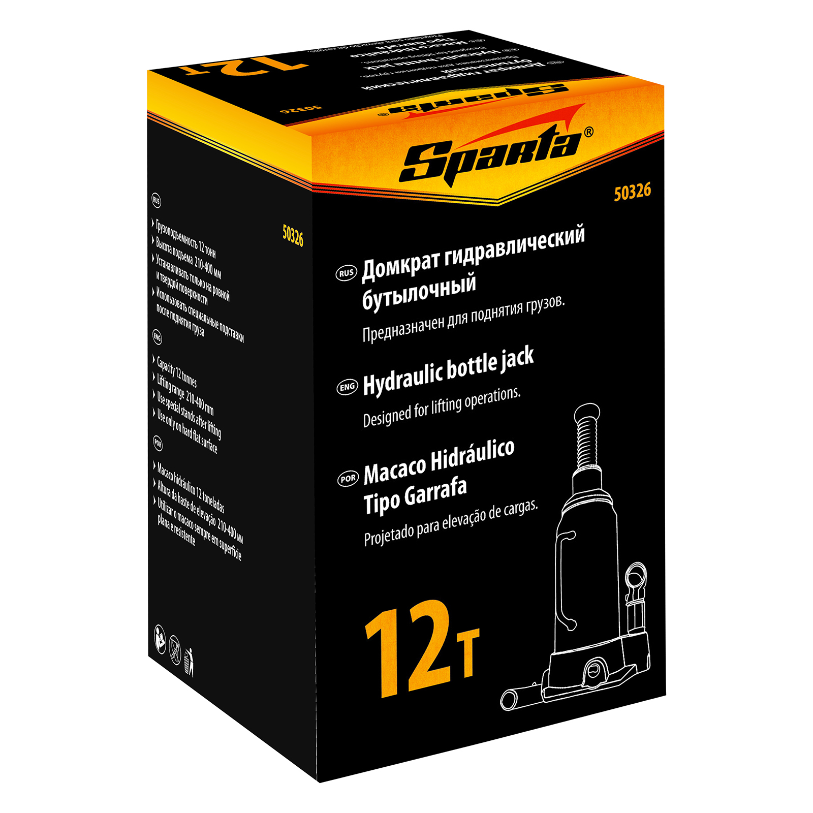 <p>Гидравлический бутылочный домкрат Sparta 50326 рассчитан на подъем грузов весом до 12 т на высоту от 210 до 400 мм. Он пригодится как автолюбителям в гараже, так и профессиональным мастерам в автосервисах. Домкрат обеспечивает плавный подъем груза без особых усилий со стороны пользователя.</p><h2>Преимущества</h2><ul><li>Надежность и долговечность — основание изготовлено из высокопрочного чугуна.</li><li>Ремонтопригодность — корпус крепится станине с помощью резьбового соединения.</li><li>Удобное хранение и транспортировка — домкрат оборудован съемным рычагом и весит 6,45 кг.</li></ul>