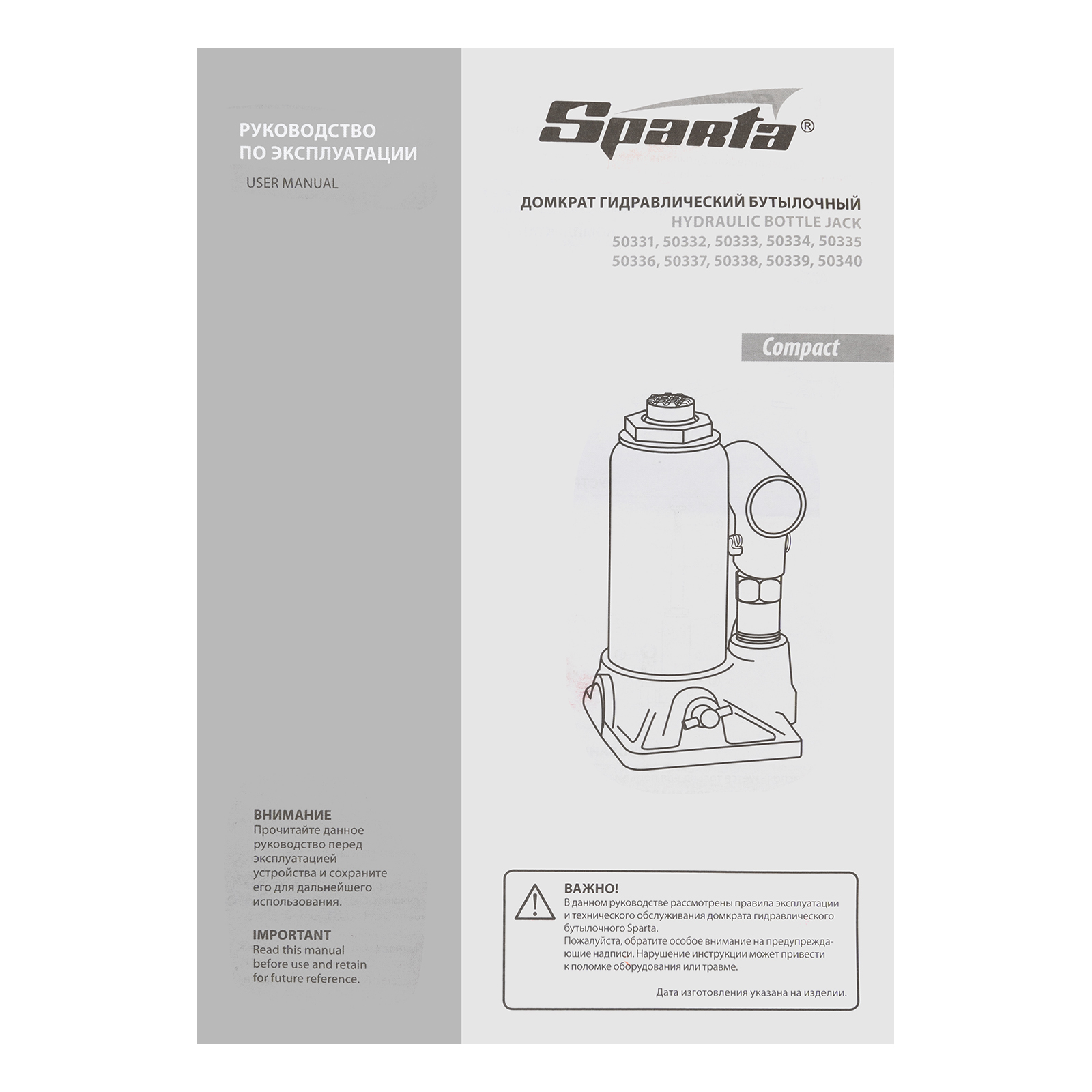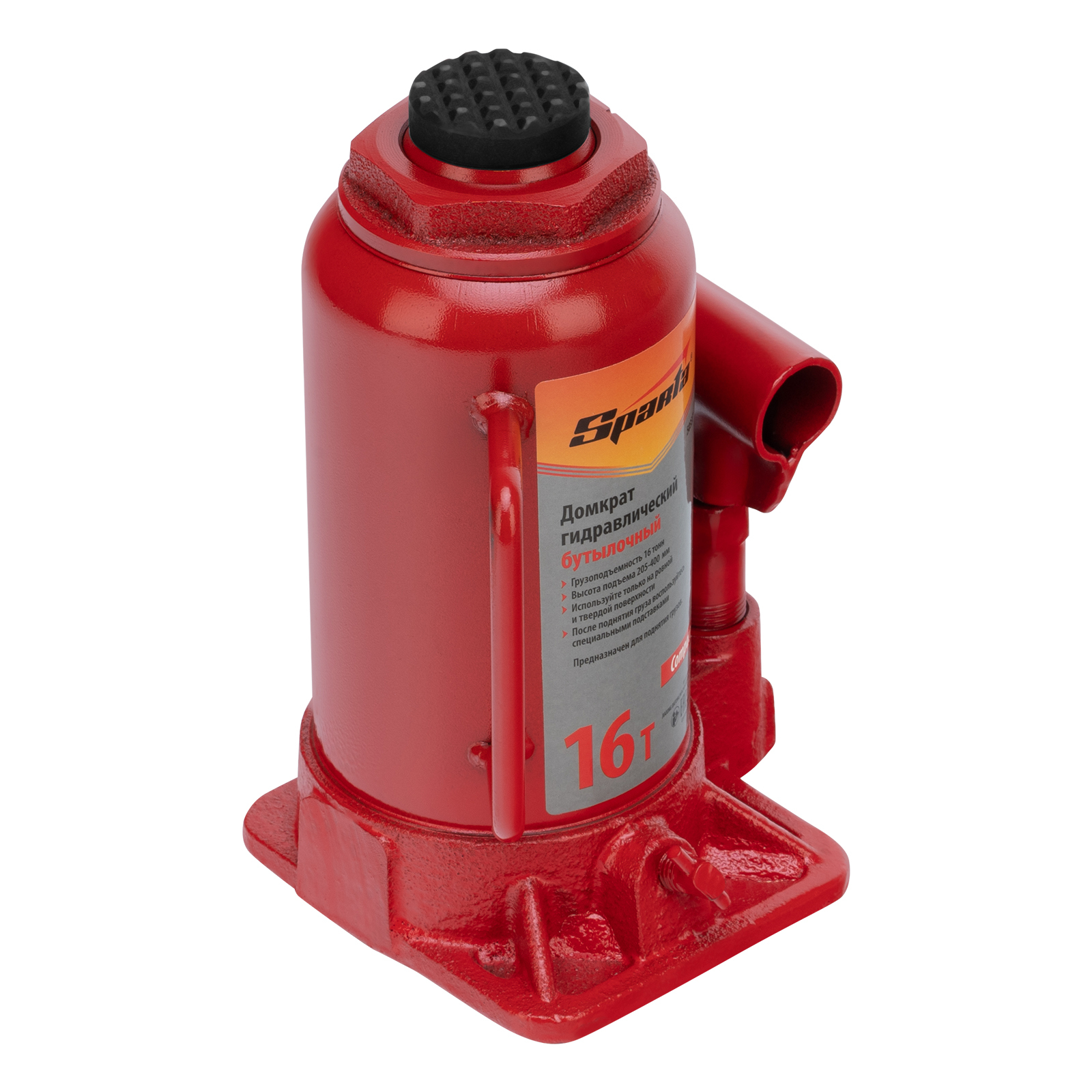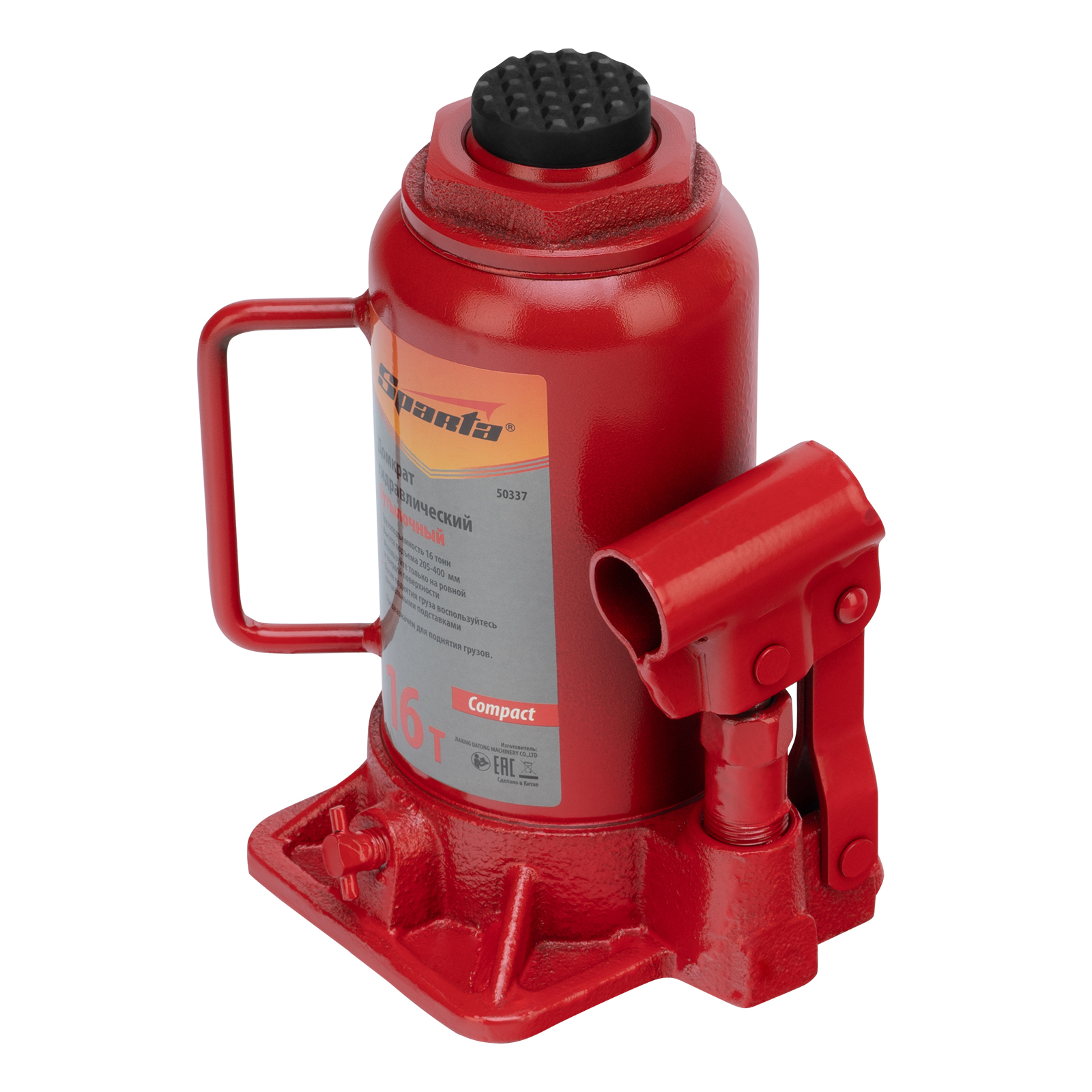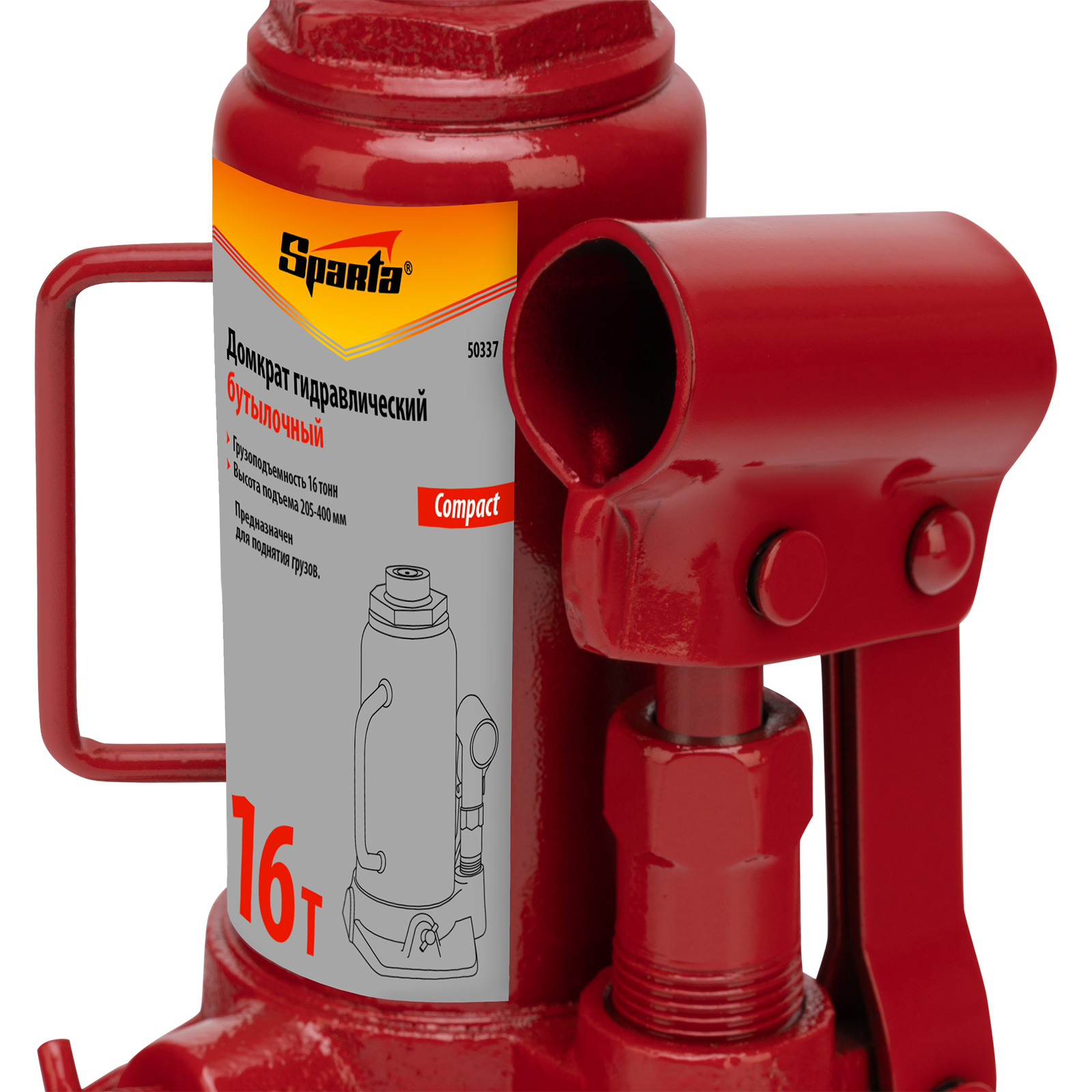 <p>Гидравлический бутылочный домкрат Sparta Compact 50337 предназначен для подъема грузов весом до 16 т на высоту 205-400 мм. Существенно облегчает рабочий процесс, т.к. не требует больших усилий от пользователя. Домкрат будет полезен в автосервисе и гараже для проведения технического обслуживания авто.</p><h2>Преимущества</h2><ul><li>Надежная конструкция — корпус домкрата выполнен из стали, а основание — из чугуна.</li><li>Ремонтопригодность — благодаря резьбовому соединению корпус легко снимается со станины.</li><li>Удобное хранение и транспортировка — домкрат не занимает много места благодаря съемному рычагу.</li></ul>