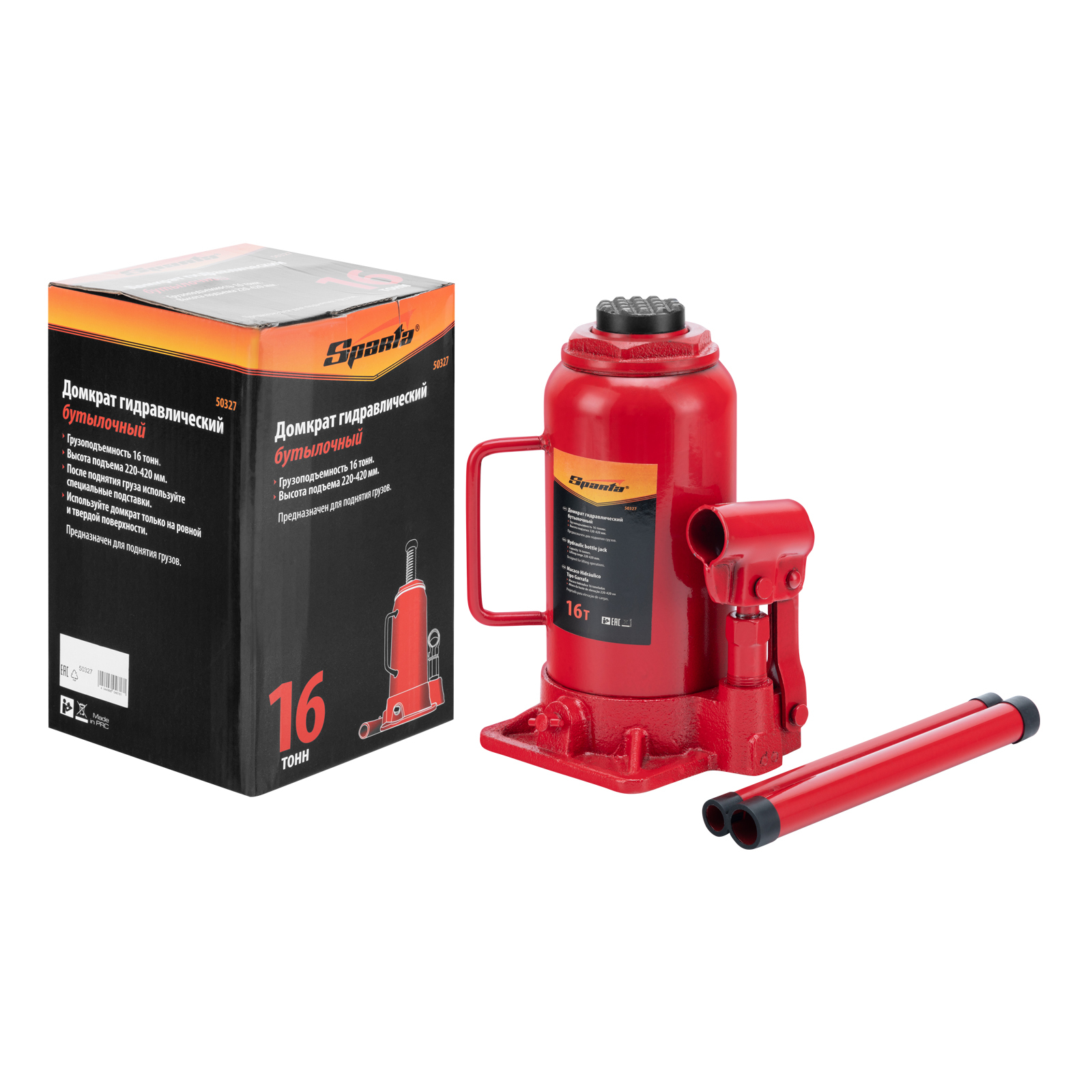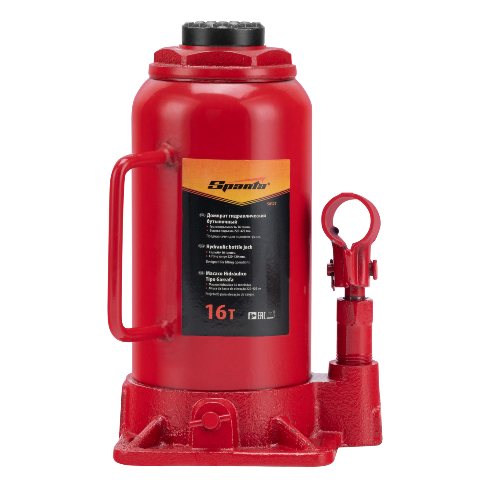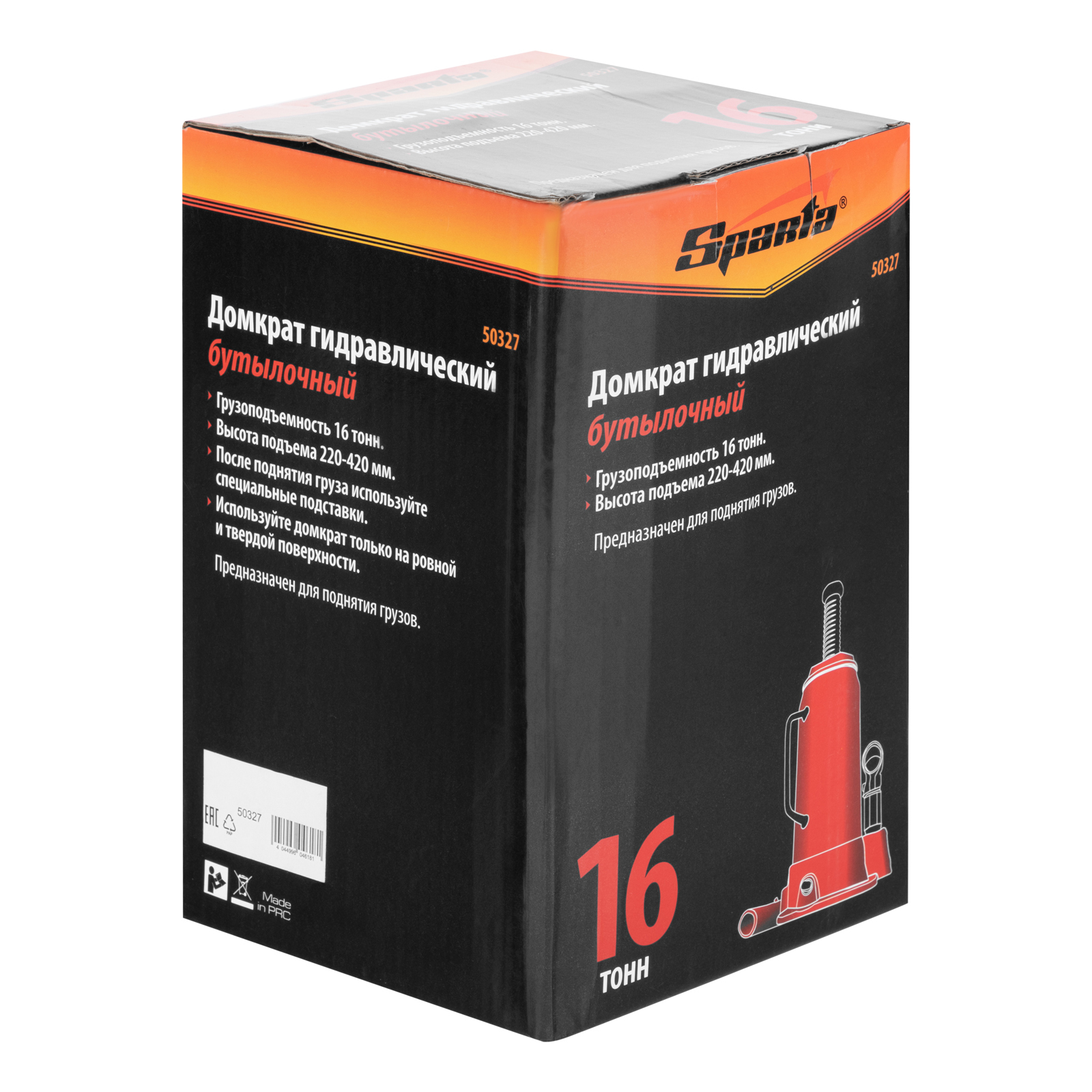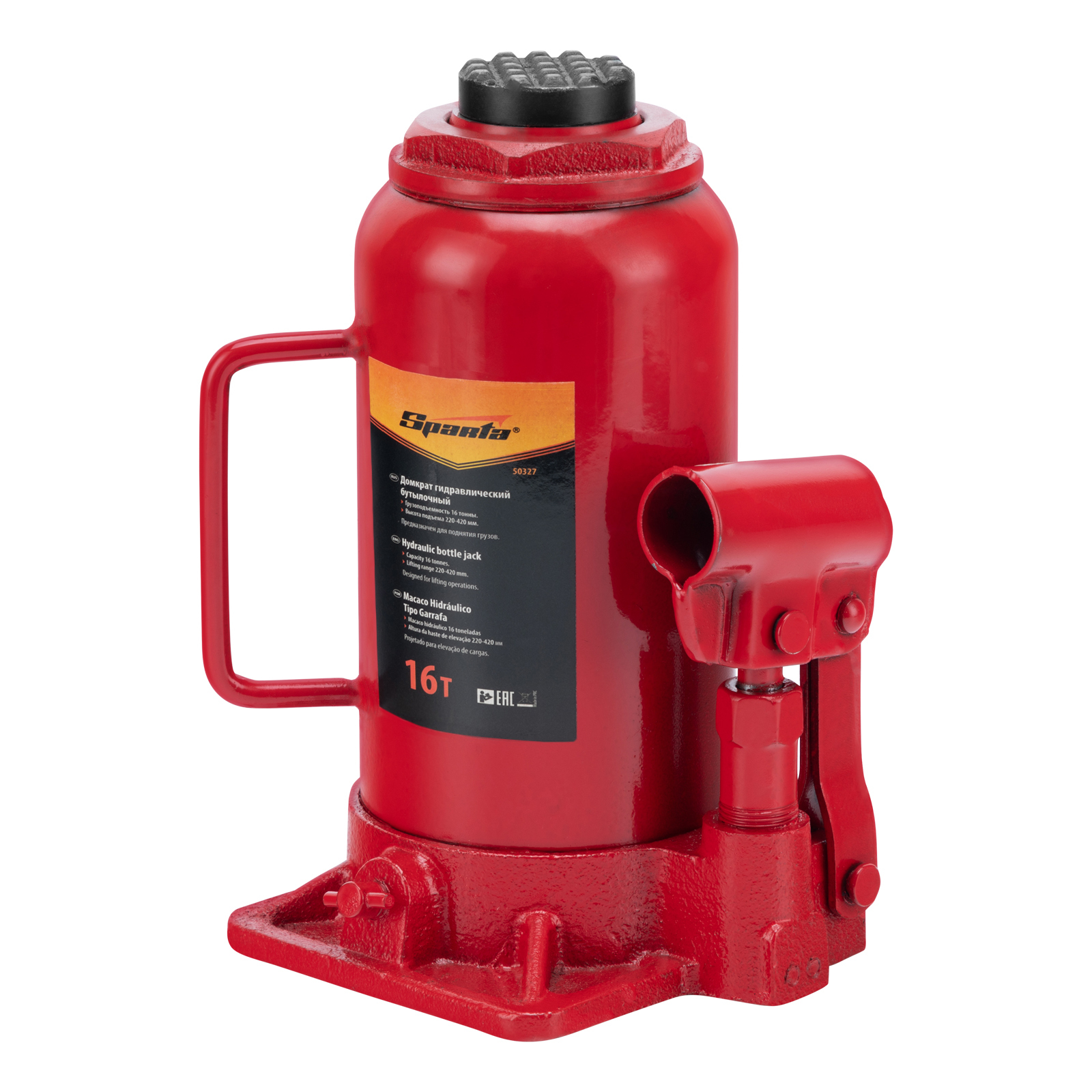 <p>Гидравлический бутылочный домкрат Sparta 50327 рассчитан на подъем грузов весом до 16 т на высоту от 220 до 420 мм. Он пригодится как автолюбителям в гараже, так и профессиональным мастерам в автосервисах. Домкрат обеспечивает плавный подъем груза без особых усилий со стороны пользователя.</p><h2>Преимущества</h2><ul><li>Надежность и долговечность — основание изготовлено из высокопрочного чугуна.</li><li>Ремонтопригодность — корпус крепится станине с помощью резьбового соединения.</li><li>Удобное хранение и транспортировка — домкрат оборудован съемным рычагом и весит 7,55 кг.</li></ul>