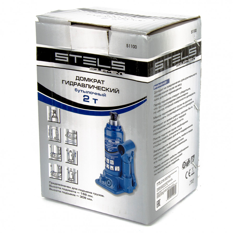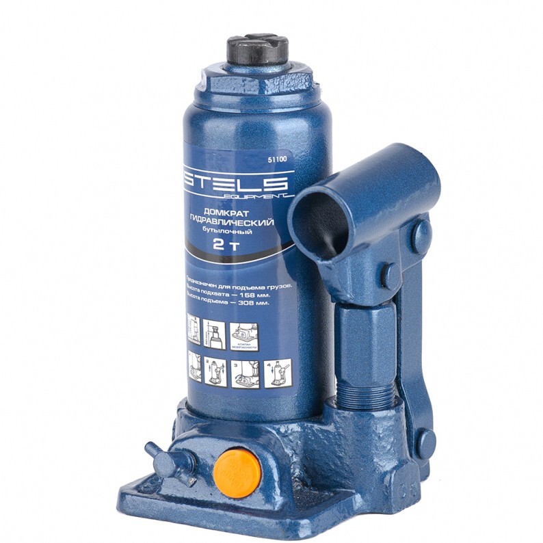 <p>Гидравлический бутылочный домкрат Stels 51100 предназначен для поднятия грузов массой до 2 т на высоту со 158 до 308 мм. Позволяет установить жесткую опору под груз для последующего проведения ремонта. Будет полезен на станции техобслуживания, подойдет также для самостоятельного обслуживания автомобиля. Пригодится во время проведения ремонтно-строительных работ.</p><h2>Преимущества</h2><ul><li>Безопасная эксплуатация — клапан безопасности предотвращает подъем груза массой свыше 2 т.</li><li>Долговечность — магнитный уловитель собирает металлическую стружку, образующуюся в процессе работы, защищая домкрат от поломки.</li><li>Удобная регулировка высоты — в верхней части штока имеется выдвижной винт.</li></ul>