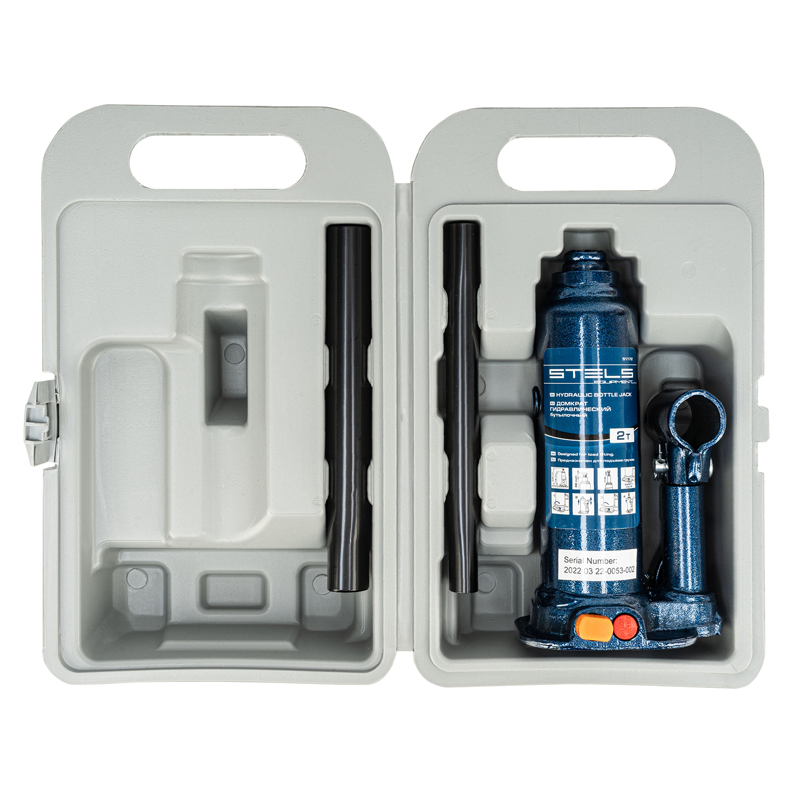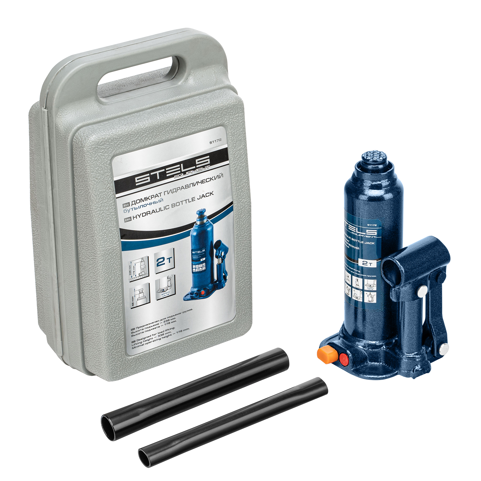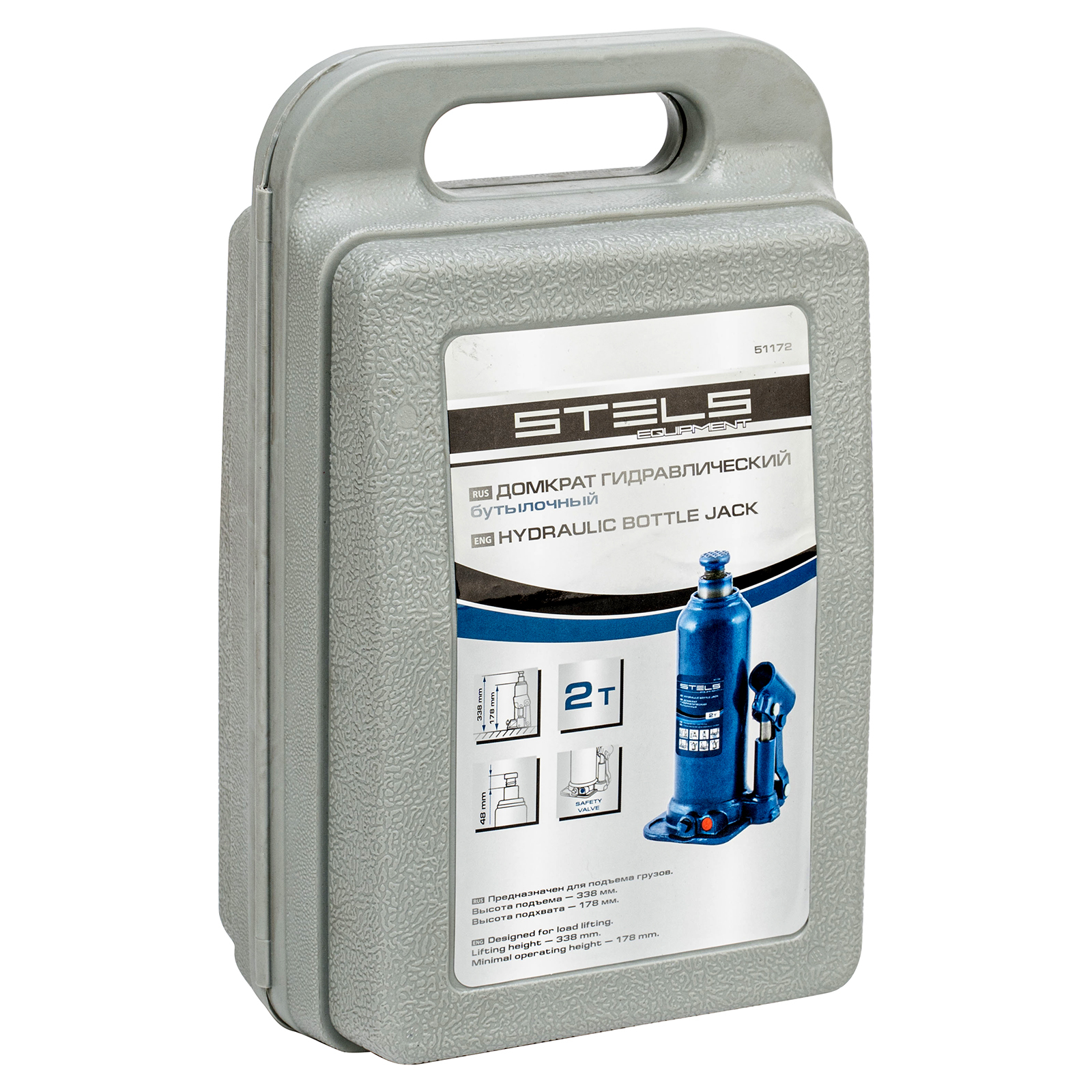<p>Гидравлический бутылочный домкрат Stels 51172 в пластиковом кейсе предназначен для поднятия грузов весом до 2 т на высоту 178-338 мм. Он не занимает много места и легко помещается в багажник, поэтому его можно брать с собой в дорогу или хранить в гараже. Используется для самостоятельного ремонта авто, также подходит для профессионального применения на станциях технического обслуживания.</p><h2>Преимущества</h2><ul><li>Защита от перегрузки и поломки — встроенный клапан безопасности не допускает подъема груза тяжелее 2000 кг.</li><li>Надежная и долговечная конструкция — корпус из коррозионностойкой стали приварен к станине.</li><li>Удобное хранение и транспортировка — домкрат поставляется в пластиковом кейсе.</li></ul>