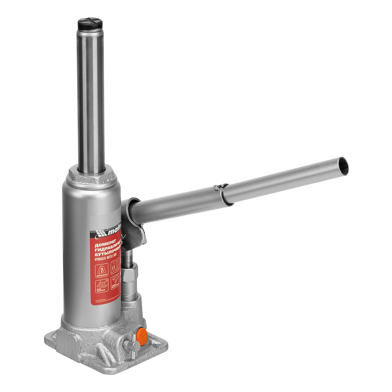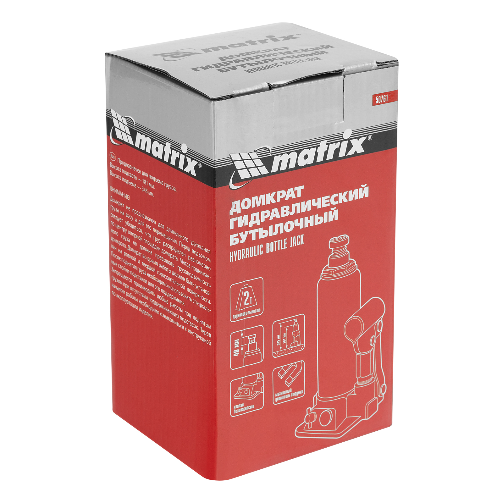<p>Гидравлический бутылочный домкрат Matrix 50761 предназначен для быстрого поднятия грузов массой до 2 т на высоту 181-345 мм. Будет полезен автолюбителям и мастерам СТО в качестве полупрофессионального инструмента. Встроенный магнитный уловитель металлической стружки защищает резиновые уплотнители от повреждений.</p><h2>Преимущества</h2><ul><li>Защита от перегрузки — домкрат оснащен клапаном безопасности, который не допускает поднятия груза массой более 2000 кг.</li><li>Надежность — подъемное устройство выполнено из прочной коррозионностойкой стали.</li><li>Разборный корпус — домкрат можно отремонтировать при необходимости.</li><li>Удобная транспортировка — домкрат весом 2,5 кг легко помещается в багажник авто.</li></ul>