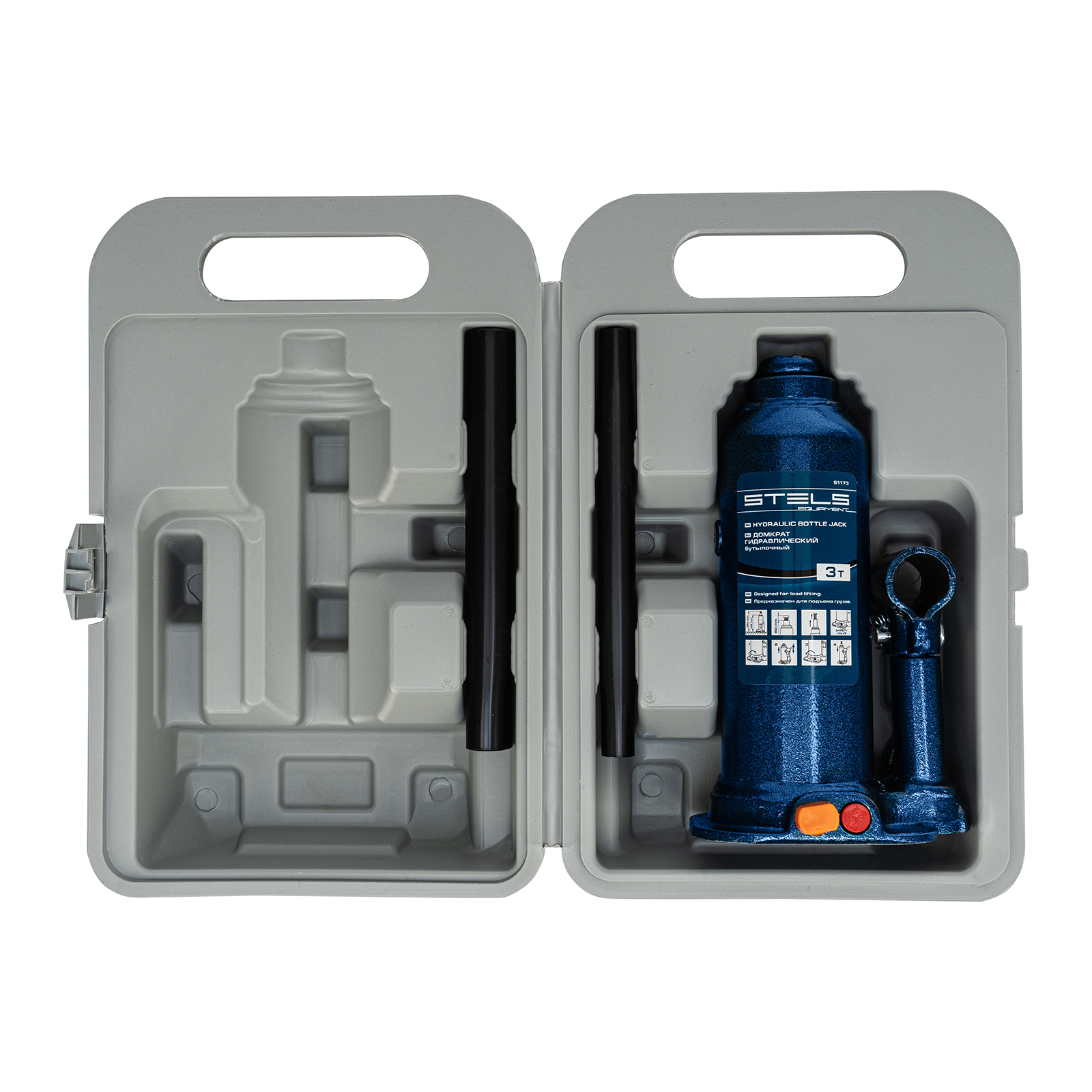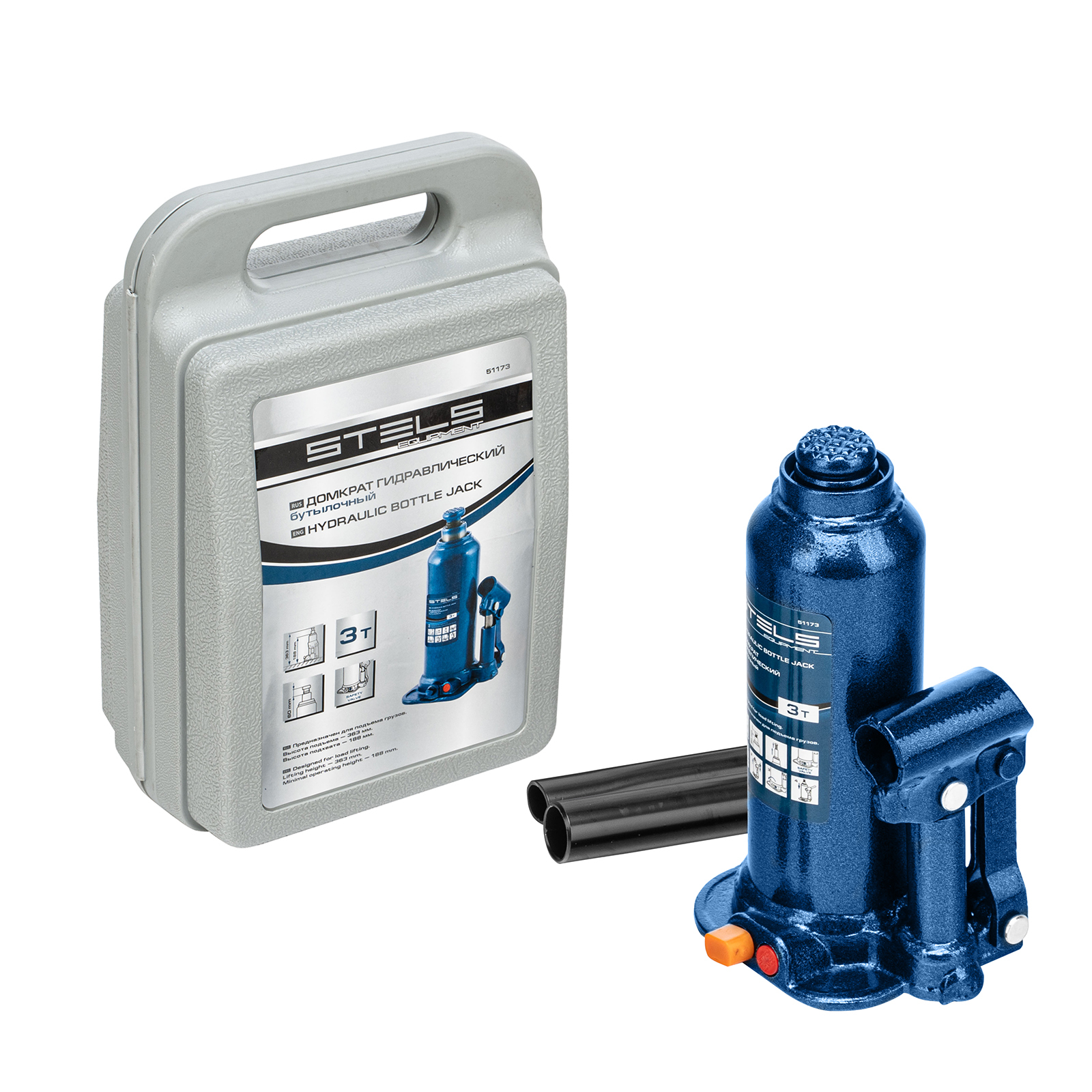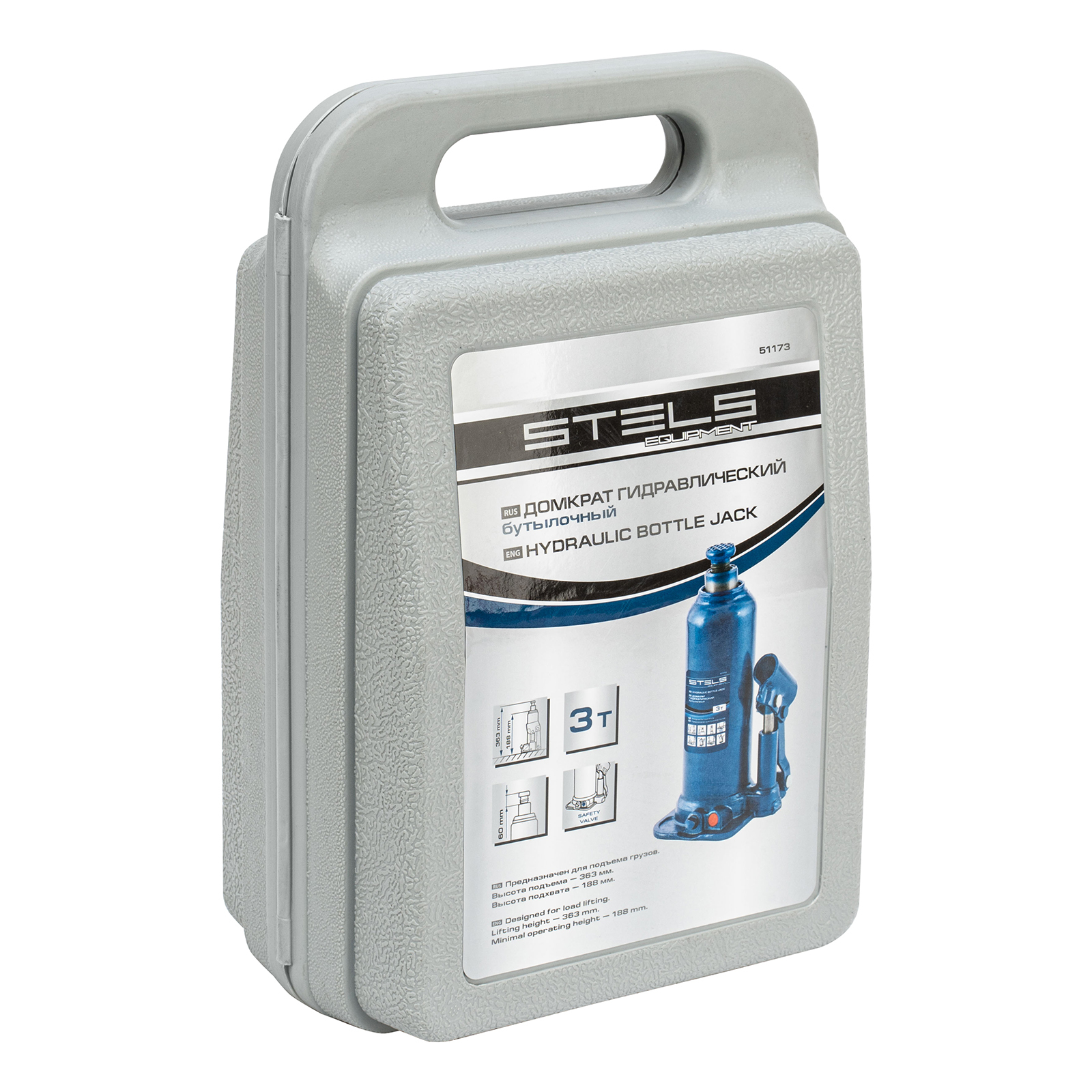 <p>Гидравлический бутылочный домкрат Stels 51173 в пластиковом кейсе предназначен для поднятия грузов весом до 3 т на высоту 188-363 мм. Он не занимает много места и легко помещается в багажник, поэтому его можно брать с собой в дорогу или хранить в гараже. Используется для самостоятельного ремонта авто, также подходит для профессионального применения на станциях технического обслуживания.</p><h2>Преимущества</h2><ul><li>Защита от перегрузки и поломки — встроенный клапан безопасности не допускает подъема груза тяжелее 3000 кг.</li><li>Надежная и долговечная конструкция — корпус из коррозионностойкой стали приварен к станине.</li><li>Удобное хранение и транспортировка — домкрат поставляется в пластиковом кейсе.</li></ul>