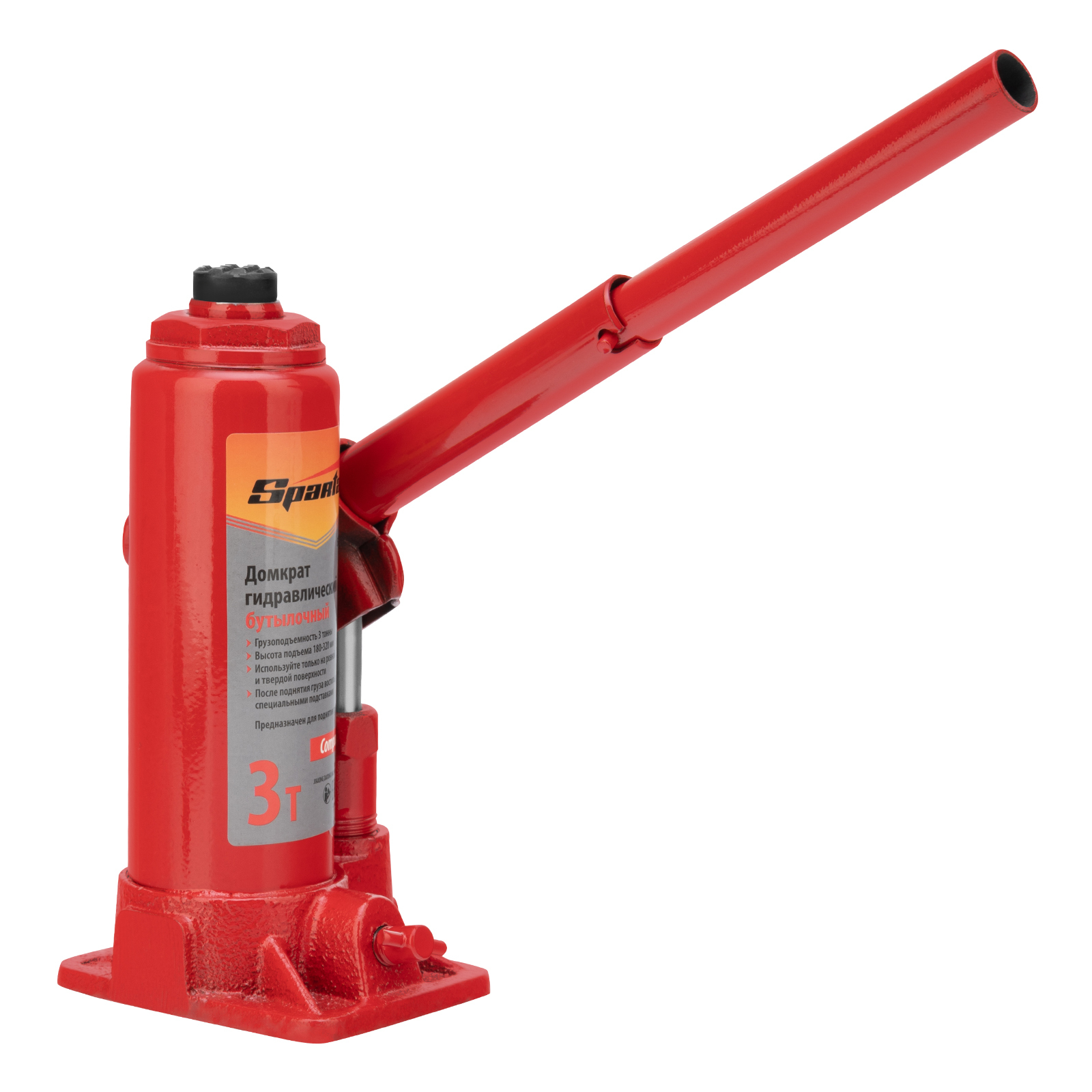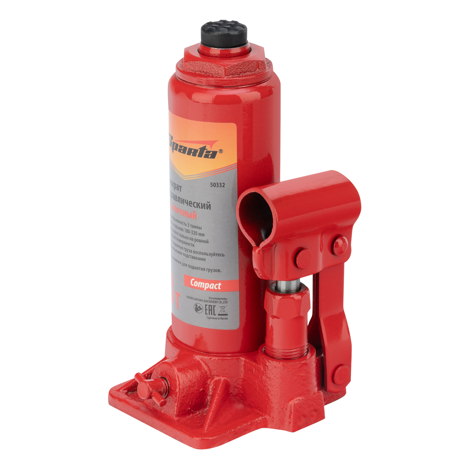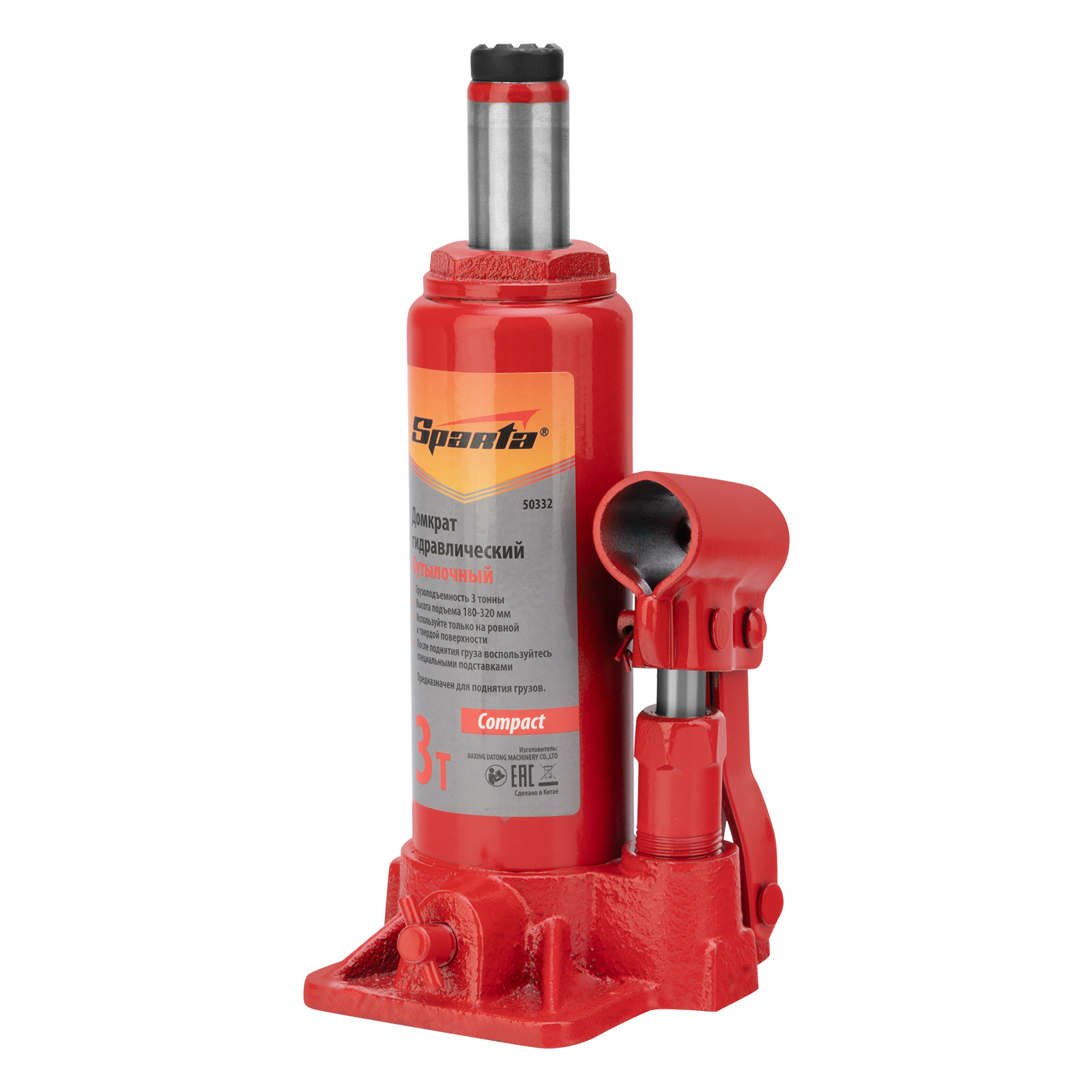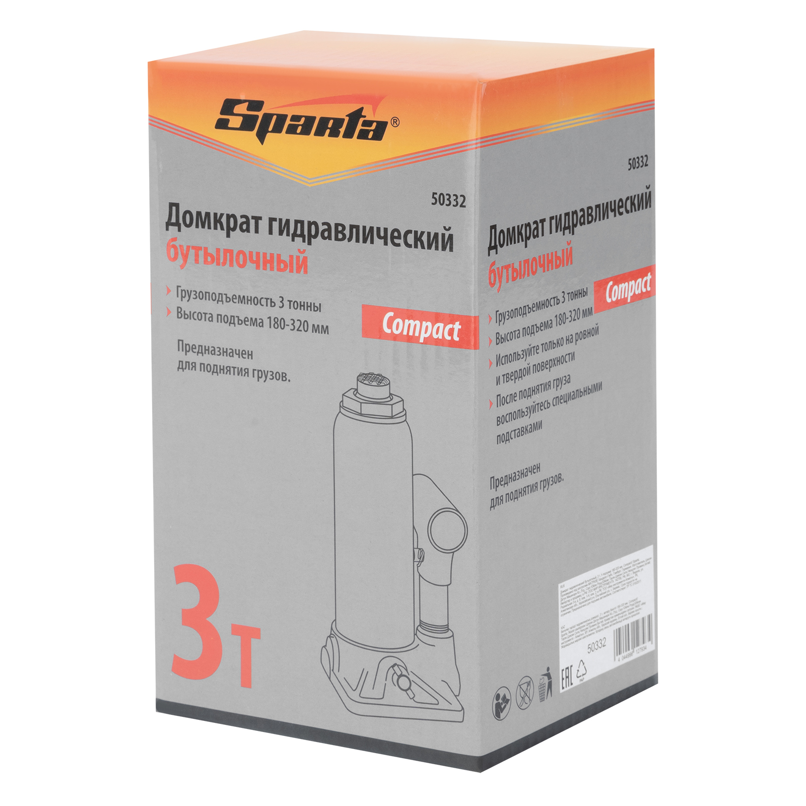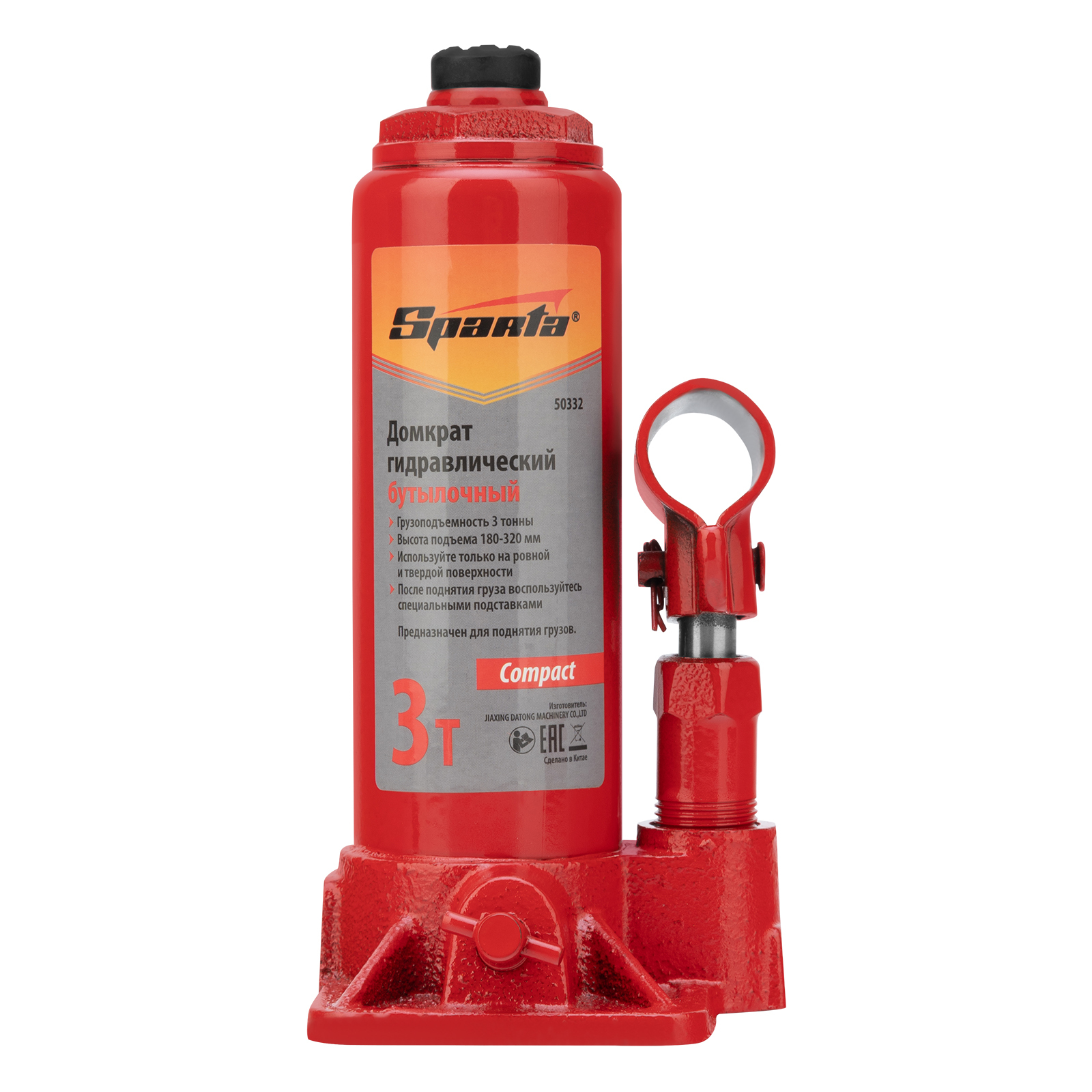 <p>Гидравлический бутылочный домкрат Sparta Compact 50332 предназначен для подъема грузов весом до 3 т на высоту 180-320 мм. Существенно облегчает рабочий процесс, т.к. не требует больших усилий от пользователя. Домкрат будет полезен в автосервисе и гараже для проведения технического обслуживания авто.</p><h2>Преимущества</h2><ul><li>Надежная конструкция — корпус домкрата выполнен из стали, а основание — из чугуна.</li><li>Ремонтопригодность — благодаря резьбовому соединению корпус легко снимается со станины.</li><li>Удобное хранение и транспортировка — домкрат весит 2,38 кг и не занимает много места благодаря съемному рычагу.</li></ul>