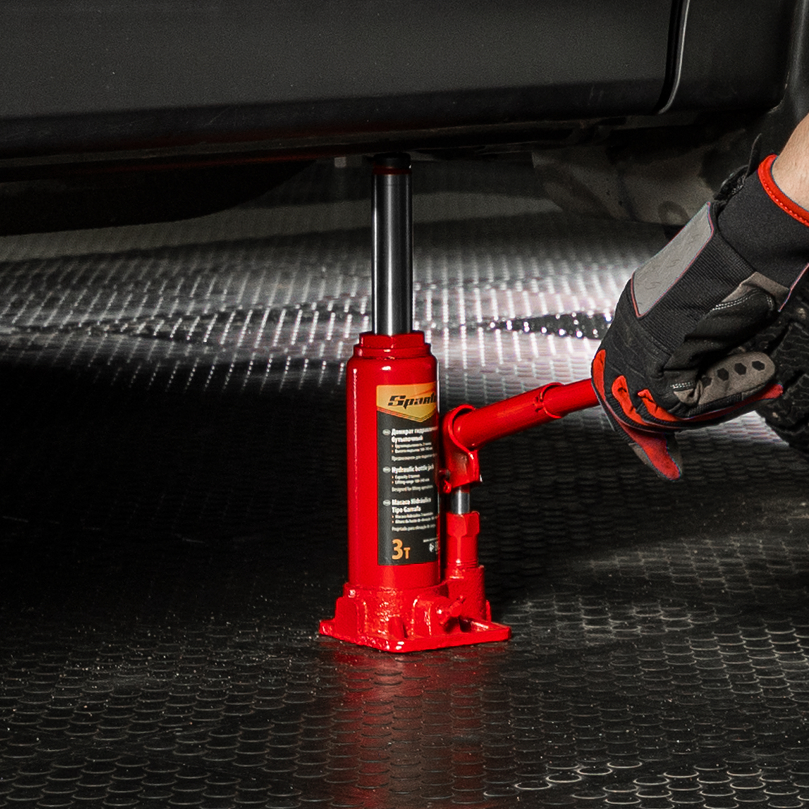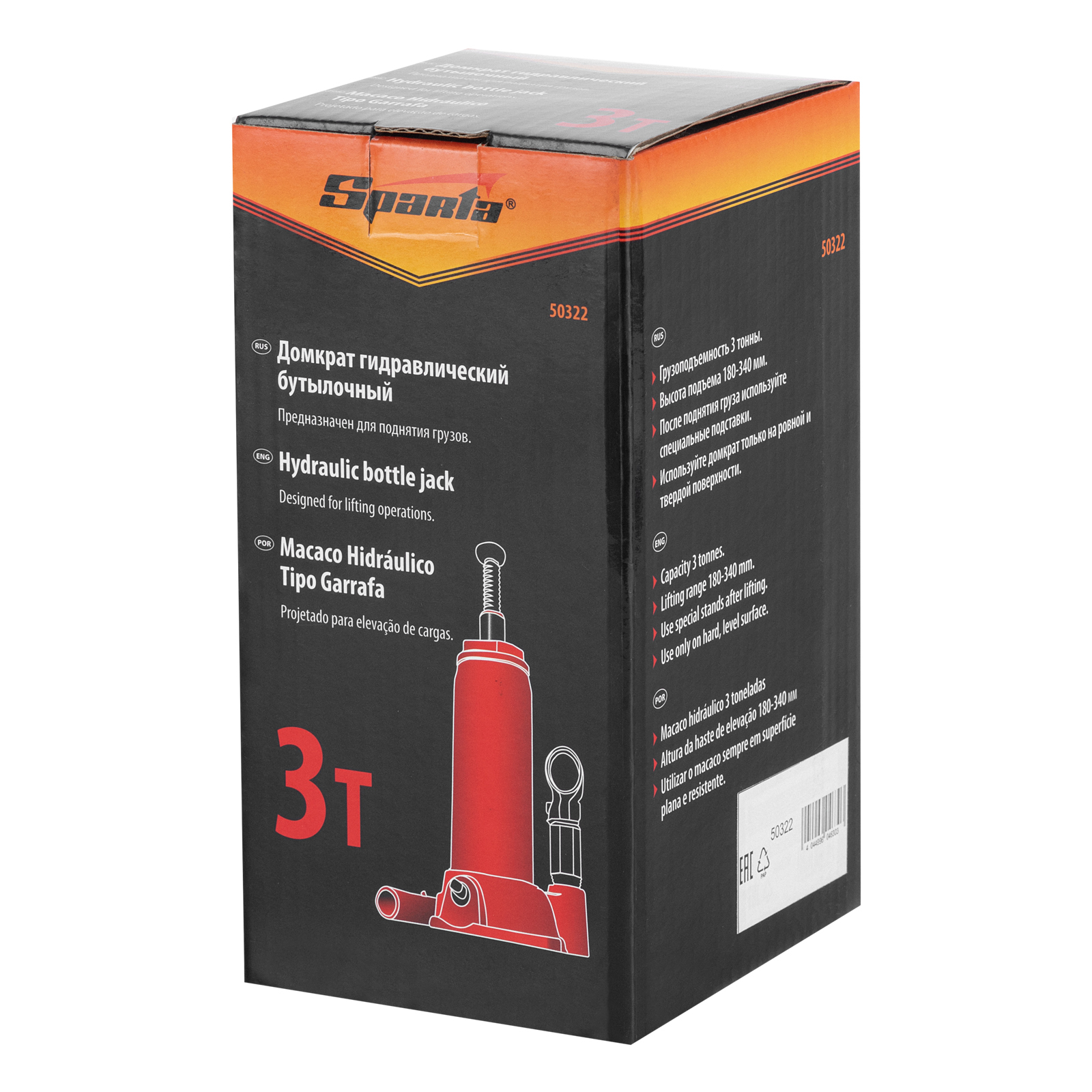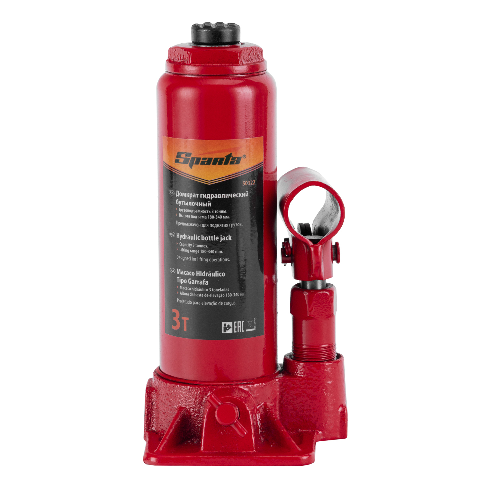 <p>Гидравлический бутылочный домкрат Sparta 50322 рассчитан на подъем грузов весом до 3 т на высоту от 180 до 340 мм. Он пригодится как автолюбителям в гараже, так и профессиональным мастерам в автосервисах. Домкрат обеспечивает плавный подъем груза без особых усилий со стороны пользователя.</p><h2>Преимущества</h2><ul><li>Надежность и долговечность — основание изготовлено из высокопрочного чугуна.</li><li>Ремонтопригодность — корпус крепится станине с помощью резьбового соединения.</li><li>Удобное хранение и транспортировка — домкрат оборудован съемным рычагом и весит 2,33 кг.</li></ul>